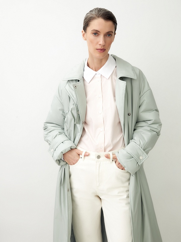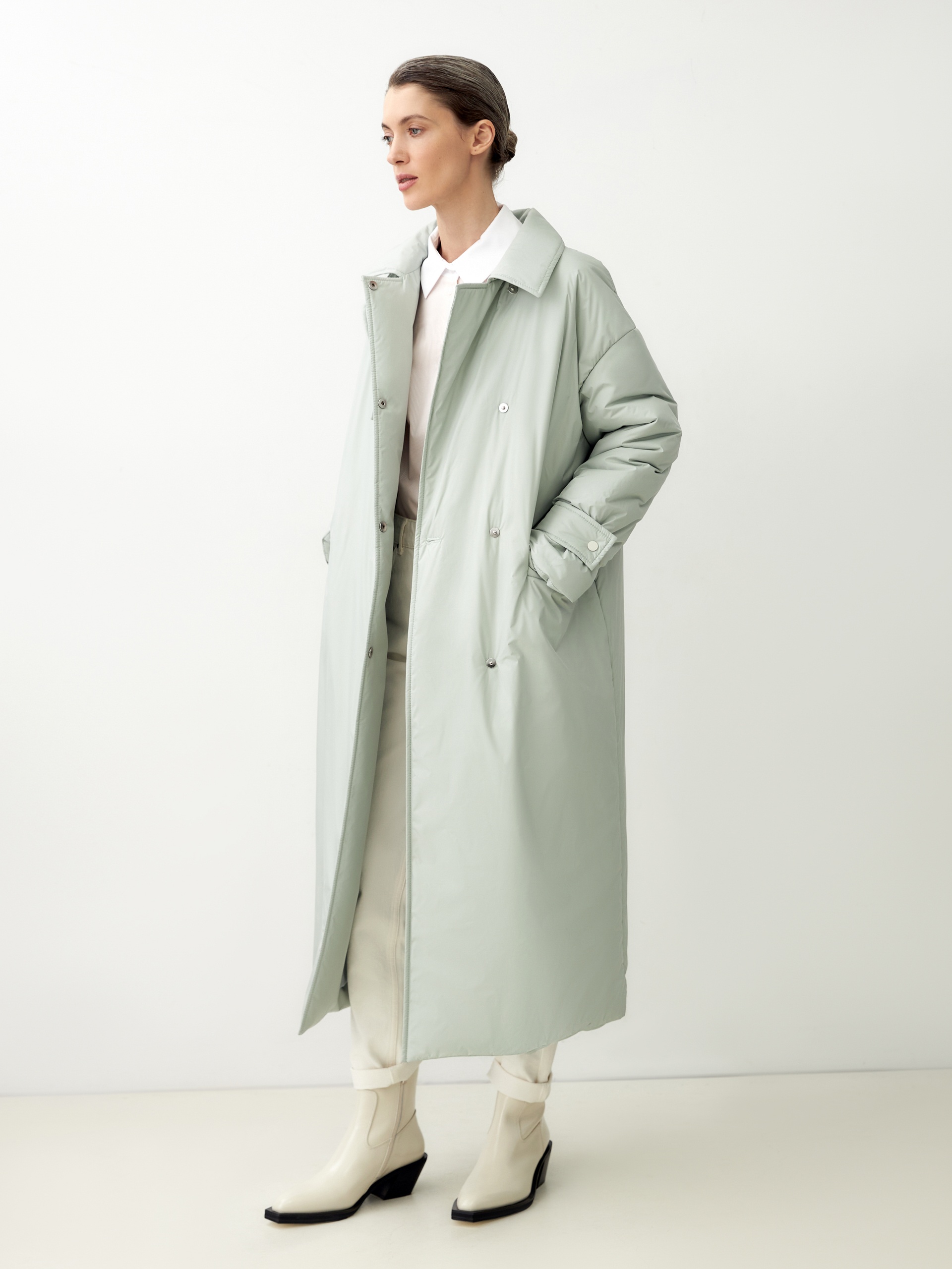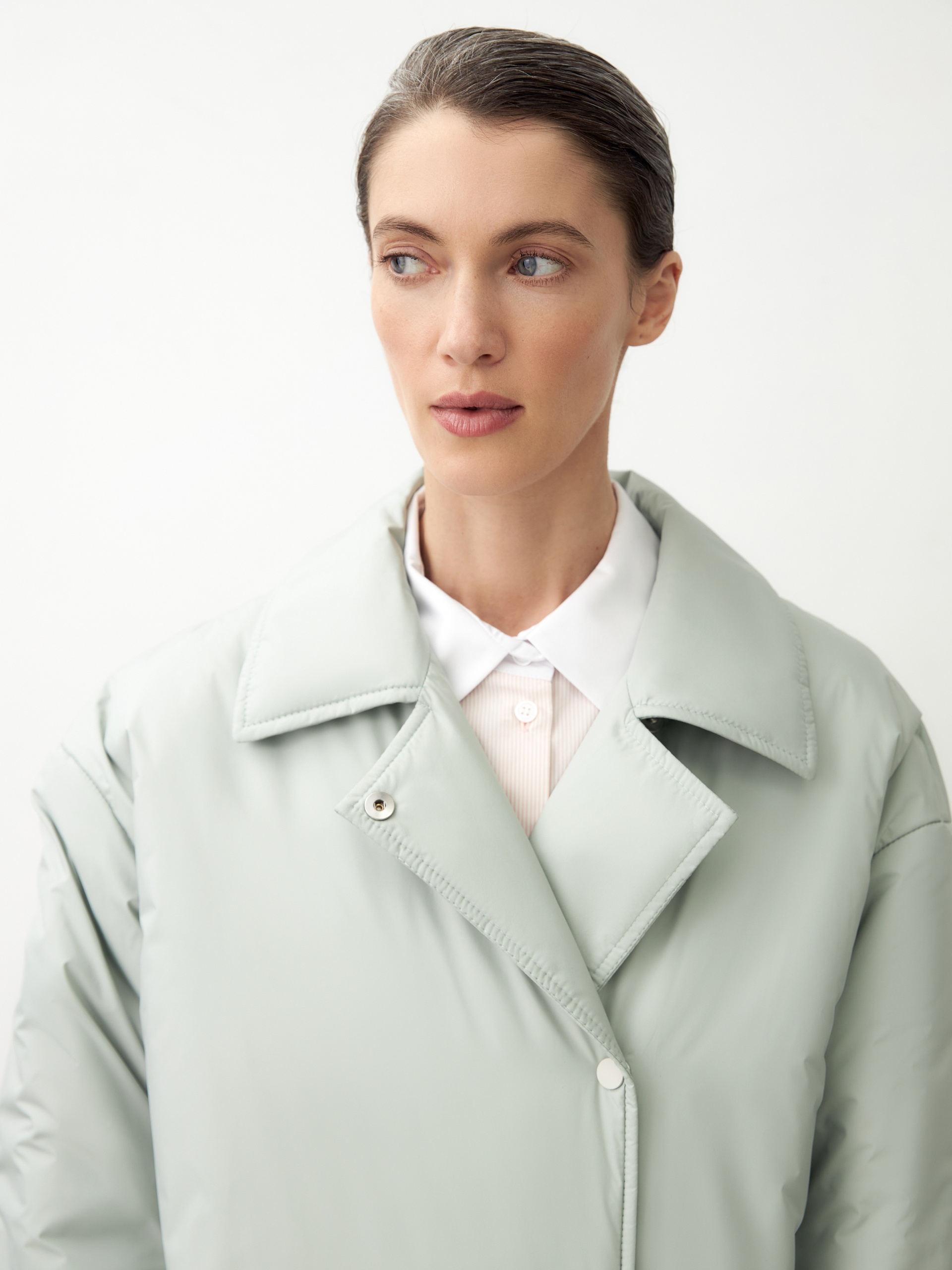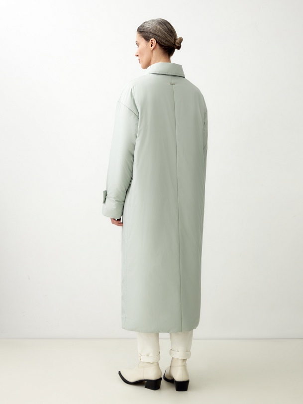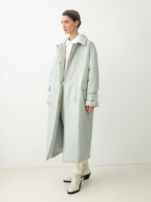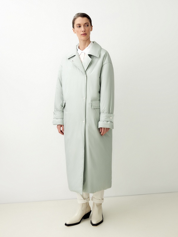 Ультрамодное утепленное пальто прямого силуэта из плащевой ткани в весеннем ментоловом оттенке. Пальто имеет свободный рубашечный рукав с декоративными патами по низу рукава. Горловина обработана стояче-отложным воротником со специальным съемным хлястиком, который обеспечит фиксацию воротника для лучшей защиты от ветра. По бокам расположены глубокие карманы с клапанами. Длина изделия ниже колена, застежка на ряд надежных установочных кнопок контрастного светло-серого цвета. Выполнено из качественной плащевой ткани с мембранным покрытием, которая надежно защитит от ветра и дождя, и современного легкого утеплителя. Произведено в Санкт-Петербурге.