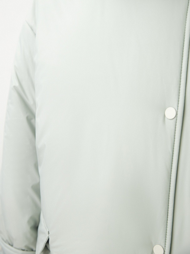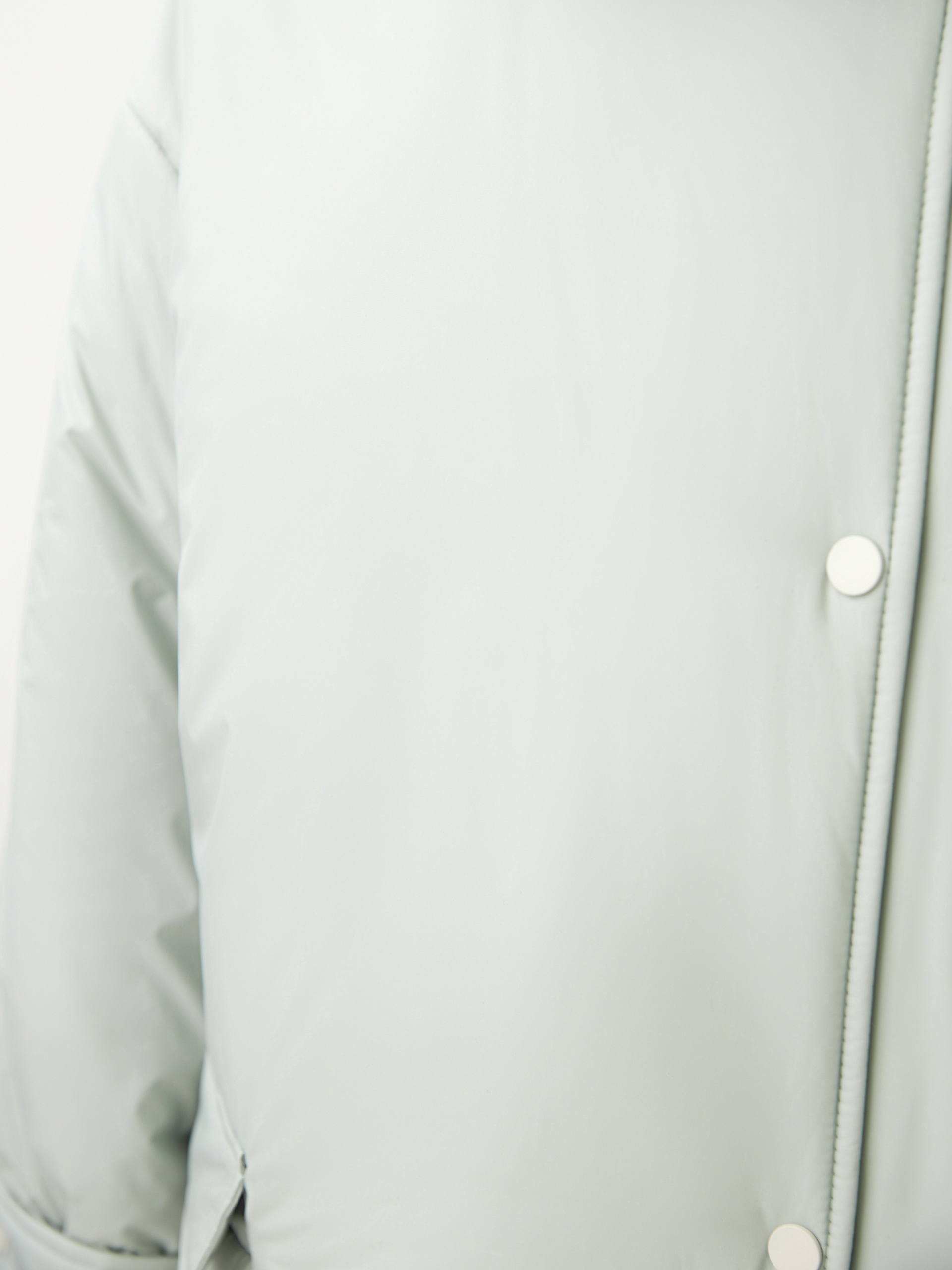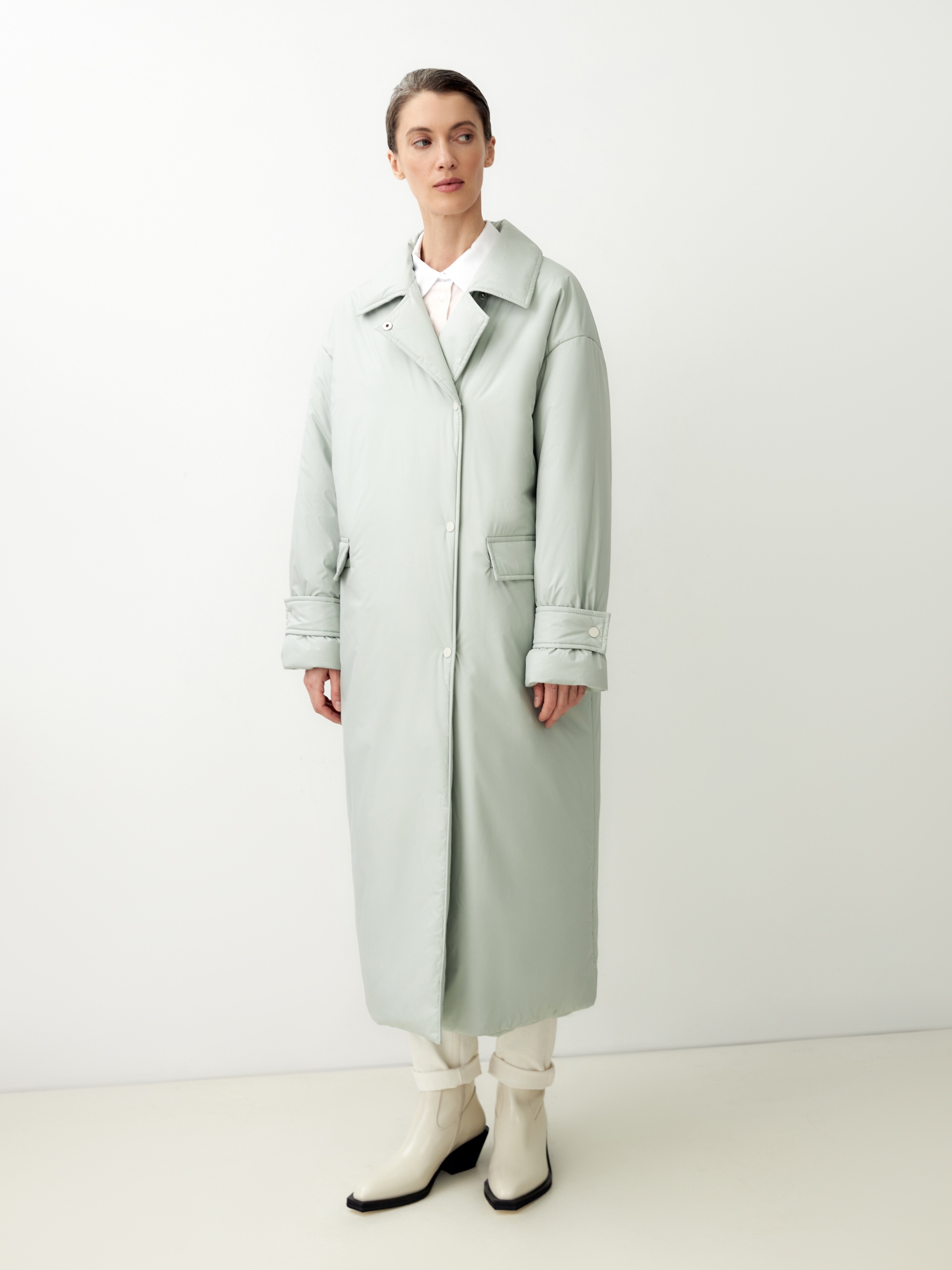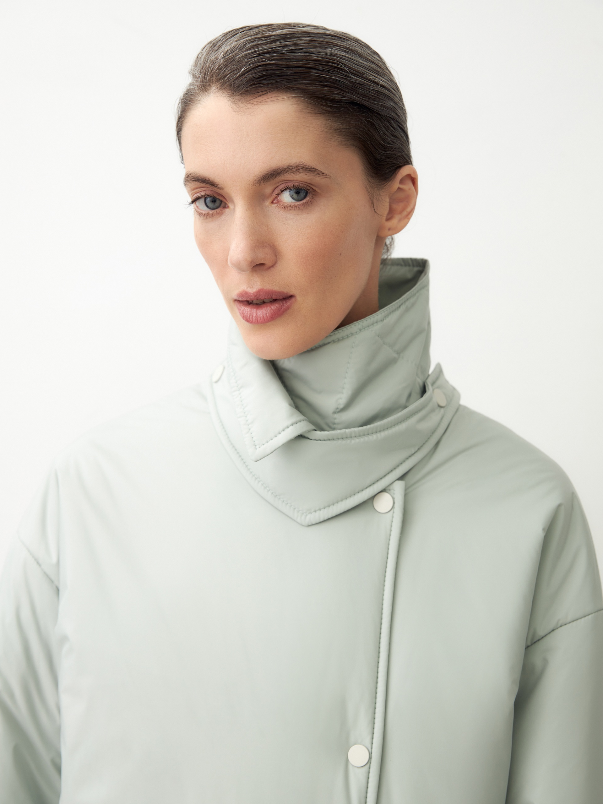 Ультрамодное утепленное пальто прямого силуэта из плащевой ткани в весеннем ментоловом оттенке. Пальто имеет свободный рубашечный рукав с декоративными патами по низу рукава. Горловина обработана стояче-отложным воротником со специальным съемным хлястиком, который обеспечит фиксацию воротника для лучшей защиты от ветра. По бокам расположены глубокие карманы с клапанами. Длина изделия ниже колена, застежка на ряд надежных установочных кнопок контрастного светло-серого цвета. Выполнено из качественной плащевой ткани с мембранным покрытием, которая надежно защитит от ветра и дождя, и современного легкого утеплителя. Произведено в Санкт-Петербурге.