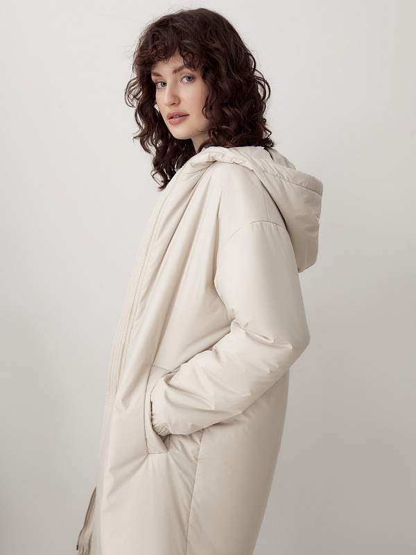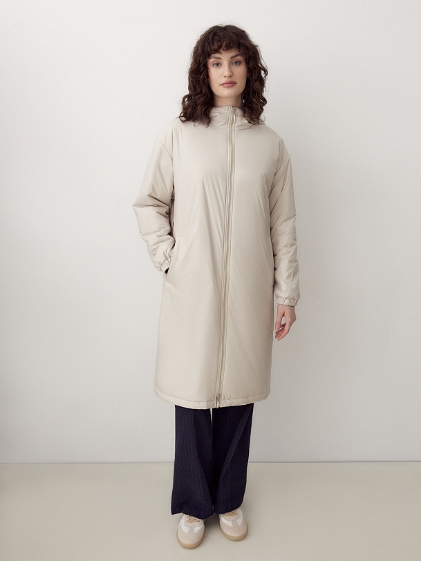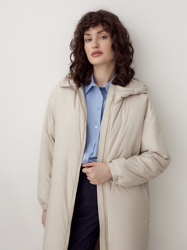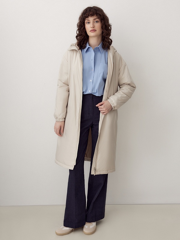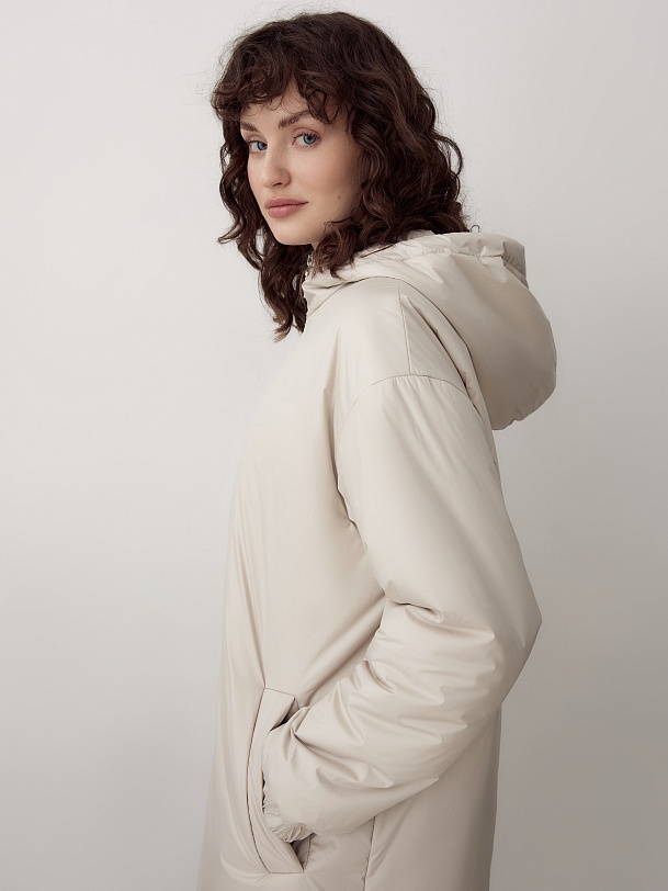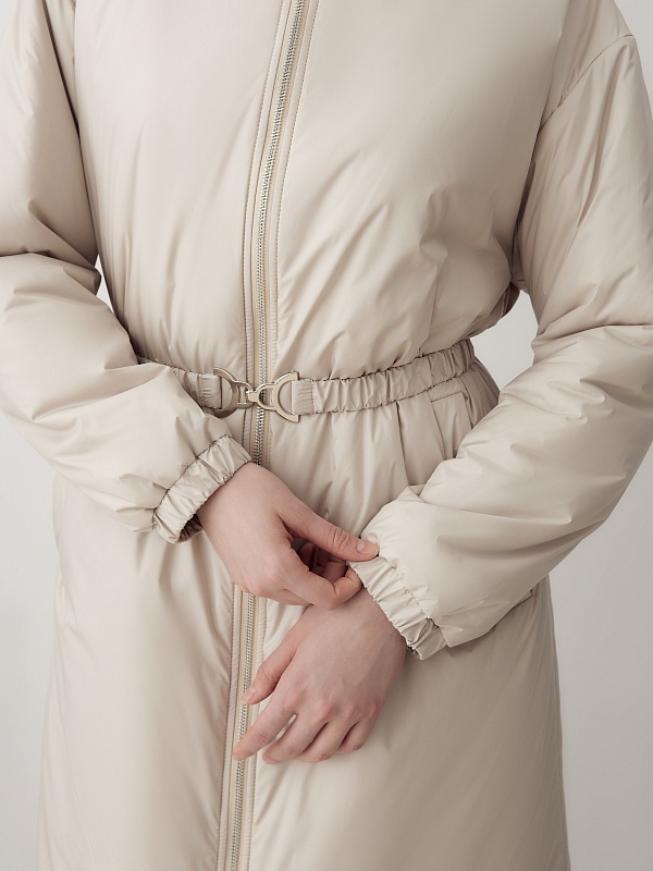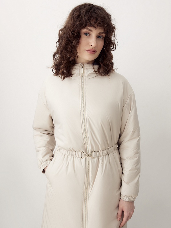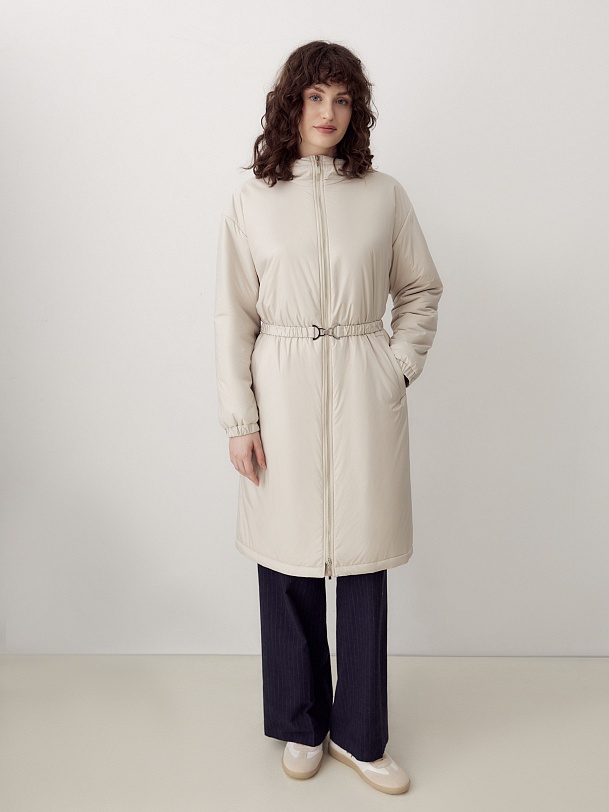Утепленное пальто прямого силуэта из плащевой ткани светлого жемчужного оттенка. Пальто имеет множество функциональных деталей. Рубашечный рукав не стесняет движений, низ рукава собран на резинку. Горловину обрамляет воротник-стойка с капюшоном, надежно защищающим от дождя и ветра. Изящный тонкий пояс на резинке из основной ткани с лаконичной пряжкой-крючком гармонично подчеркивает талию. Пальто имеет универсальную длину до колена и застежку на легкую пластиковую молнию. А для дополнительной защиты от ветра и холода пальто выполнено с использованием высокотехнологичной мембраны RaftPro и современного легкого утеплителя. Произведено в Санкт-Петербурге.