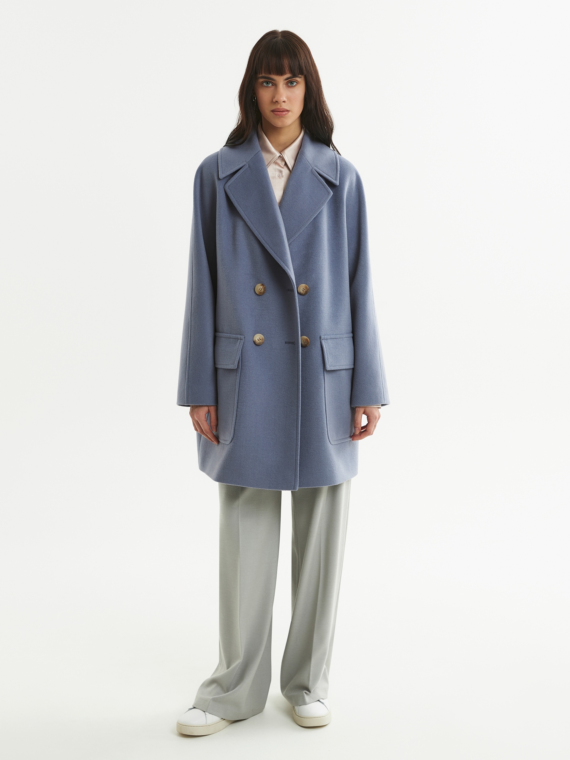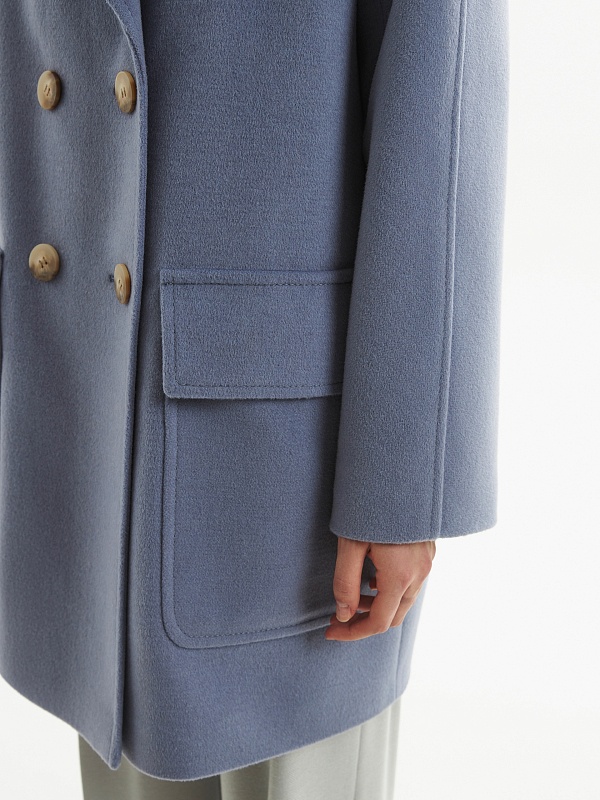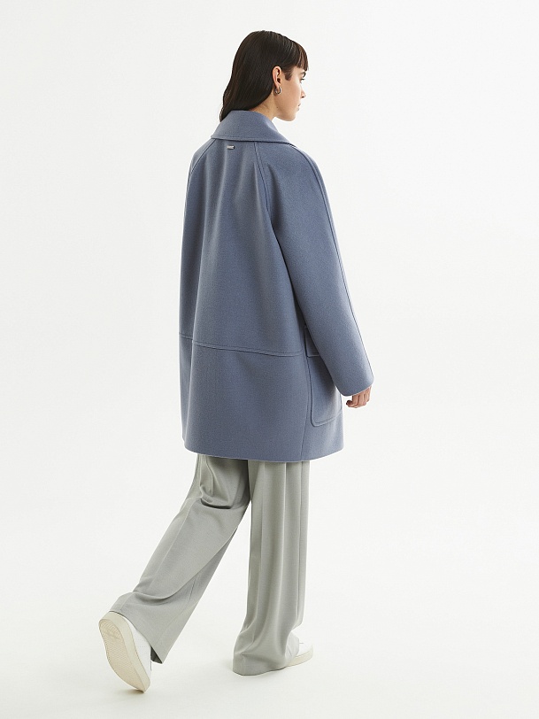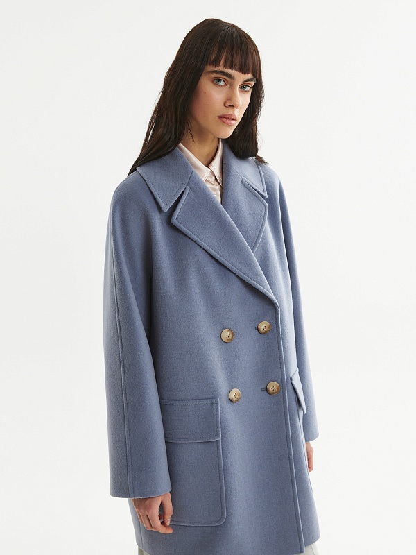 Двубортное укороченное пальто силуэта "кокон" из ворсовой пальтовой ткани нежного весеннего серо-голубого оттенка. Полупальто универсальной длины выше колена, с широким английским воротником и комфортным рукавом уникальной комбинированной конструкции: цельнокроеный спереди и реглан на спинке. Функциональным декоративным элементом служат большие накладные карманы с клапанами. Остроты пальто добавляют широкие отделочные строчки. Застежка на два ряда стильных пуговиц под натуральный рог. Благодаря высокому содержанию шерсти пальто очень уютное и теплое. А для дополнительной защиты от непогоды изделие выполнено с использованием высокотехнологичной мембраны RaftPro. Произведено в Санкт-Петербурге.