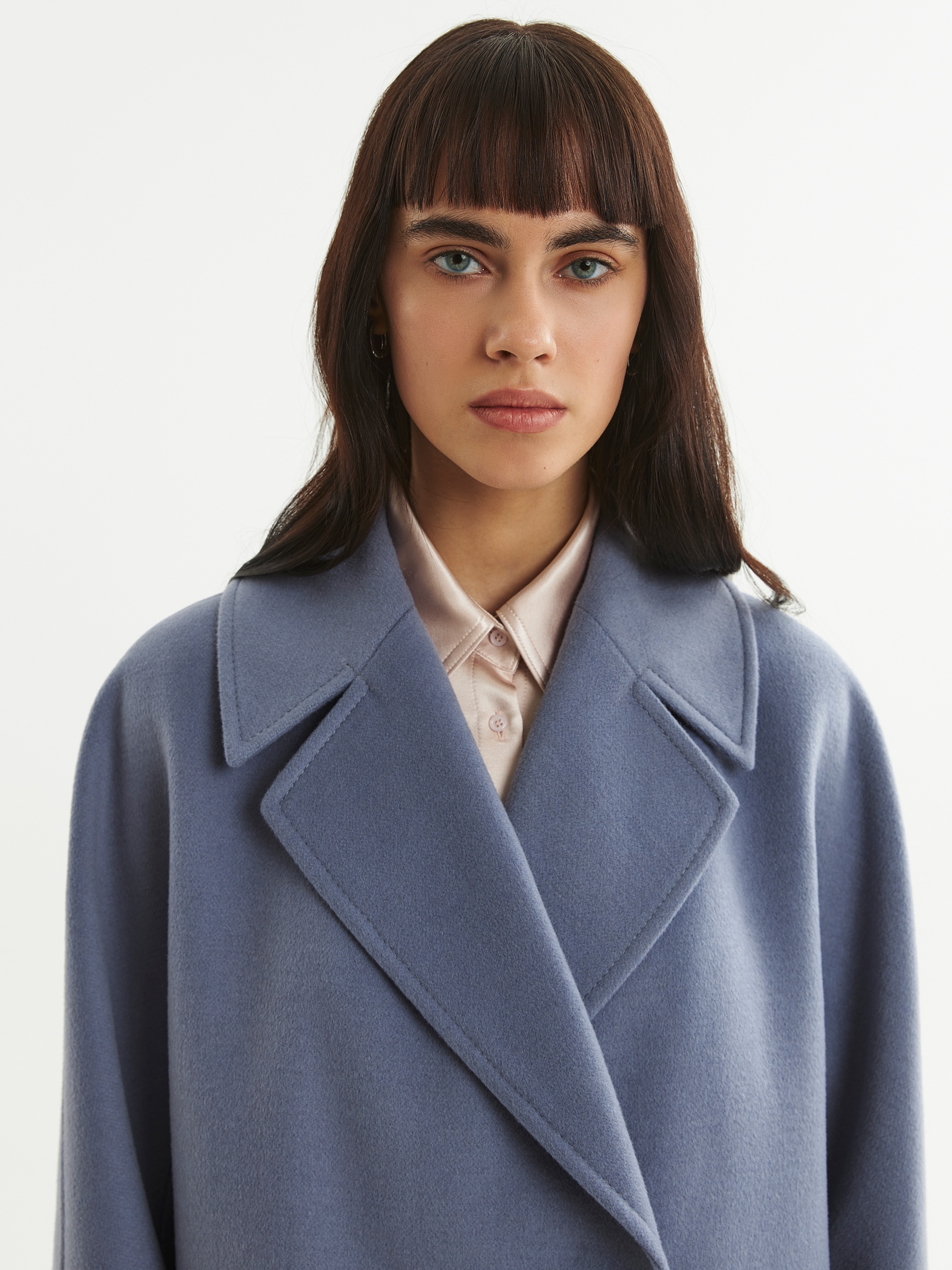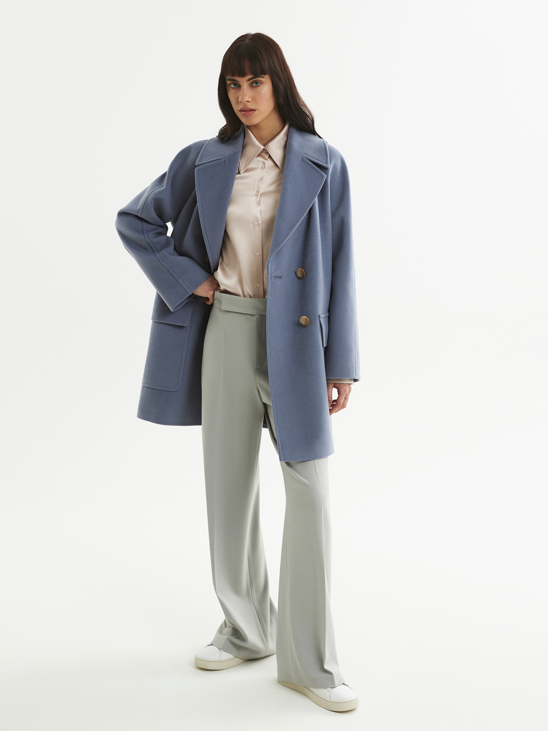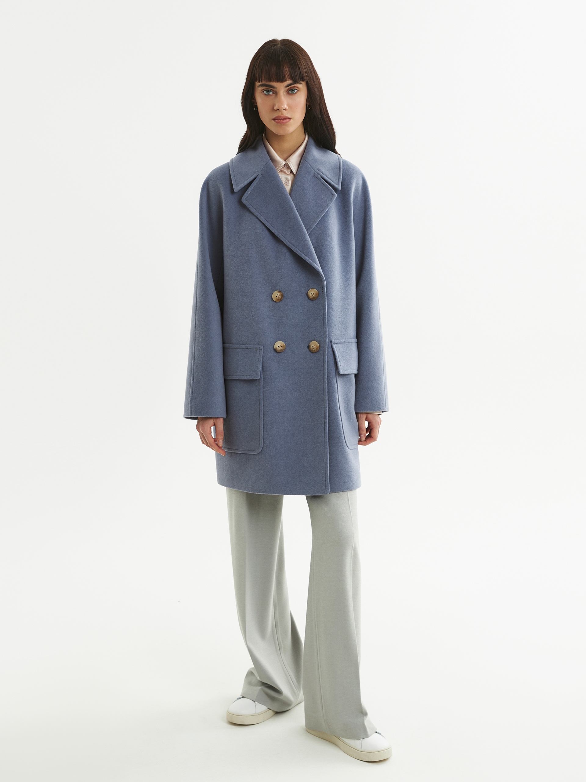 Двубортное укороченное пальто силуэта "кокон" из ворсовой пальтовой ткани нежного весеннего серо-голубого оттенка. Полупальто универсальной длины выше колена, с широким английским воротником и комфортным рукавом уникальной комбинированной конструкции: цельнокроеный спереди и реглан на спинке. Функциональным декоративным элементом служат большие накладные карманы с клапанами. Остроты пальто добавляют широкие отделочные строчки. Застежка на два ряда стильных пуговиц под натуральный рог. Благодаря высокому содержанию шерсти пальто очень уютное и теплое. А для дополнительной защиты от непогоды изделие выполнено с использованием высокотехнологичной мембраны RaftPro. Произведено в Санкт-Петербурге.