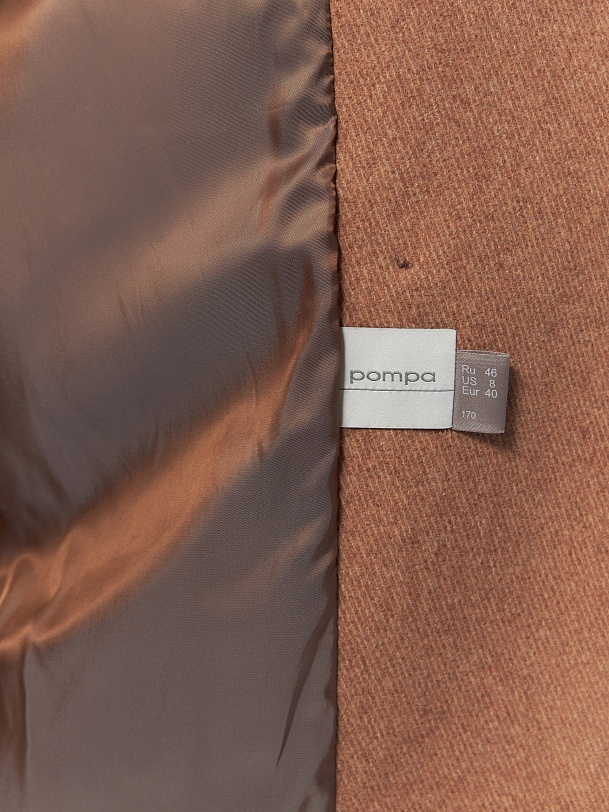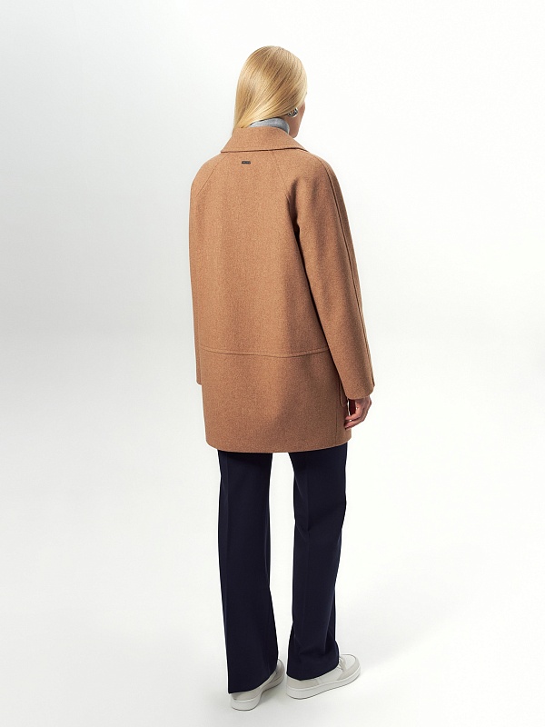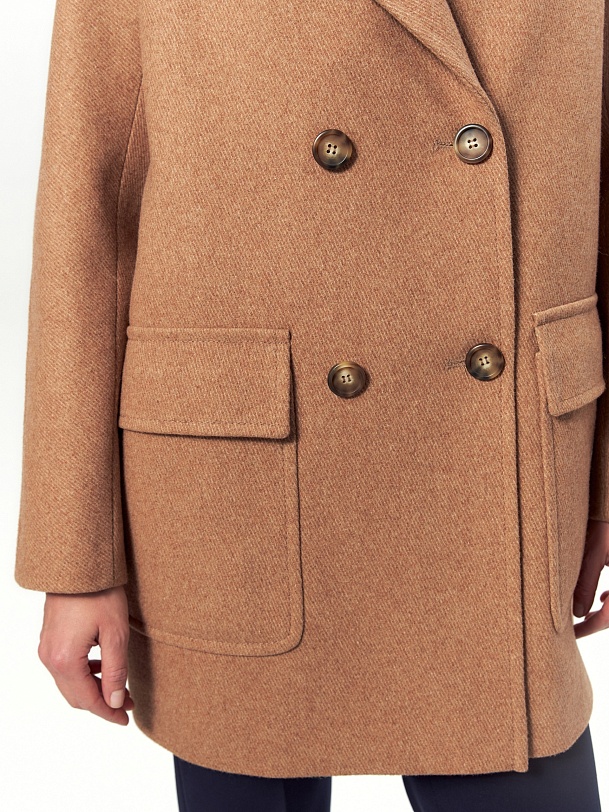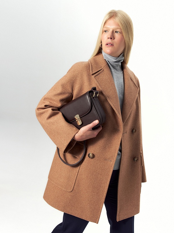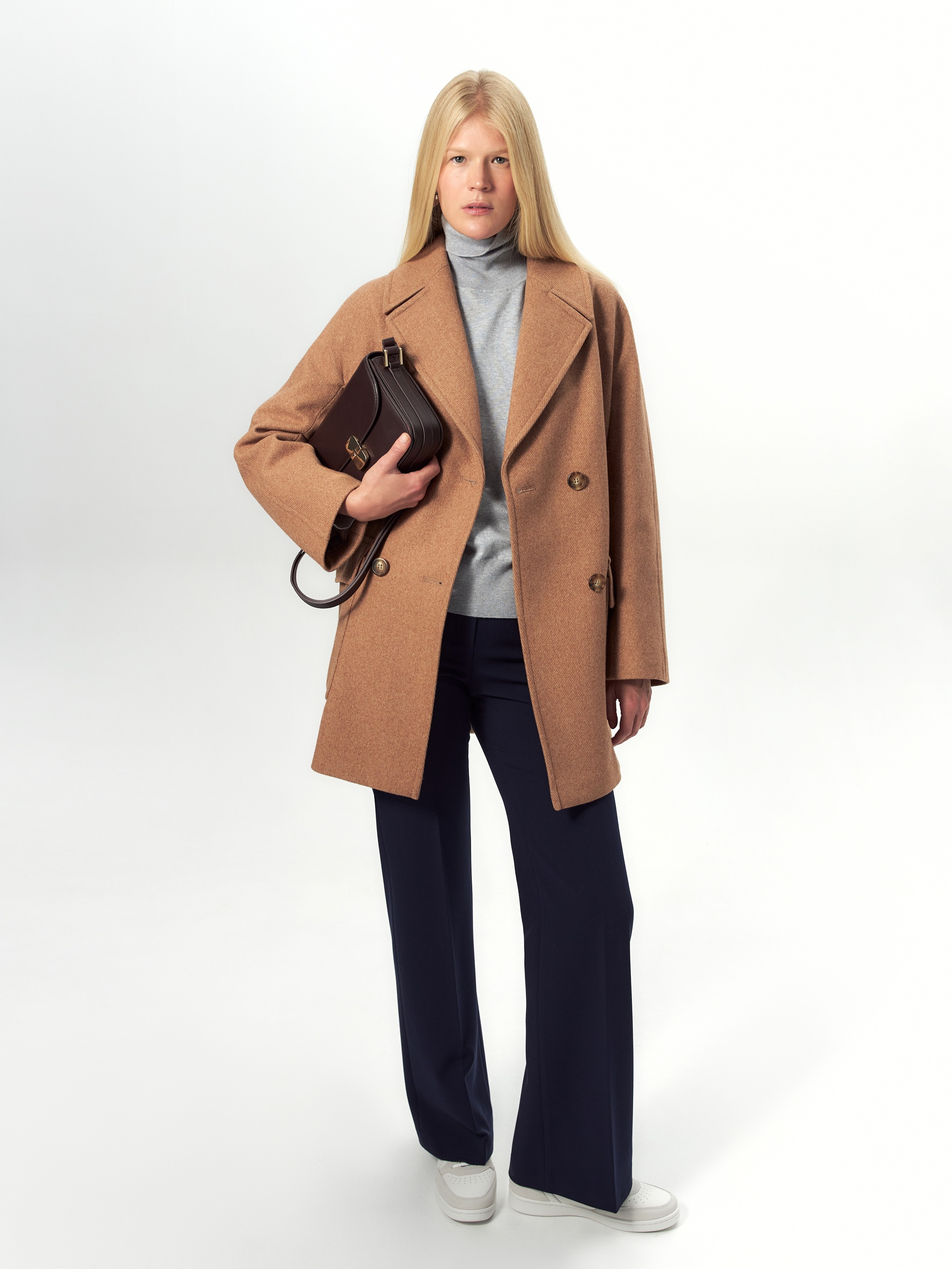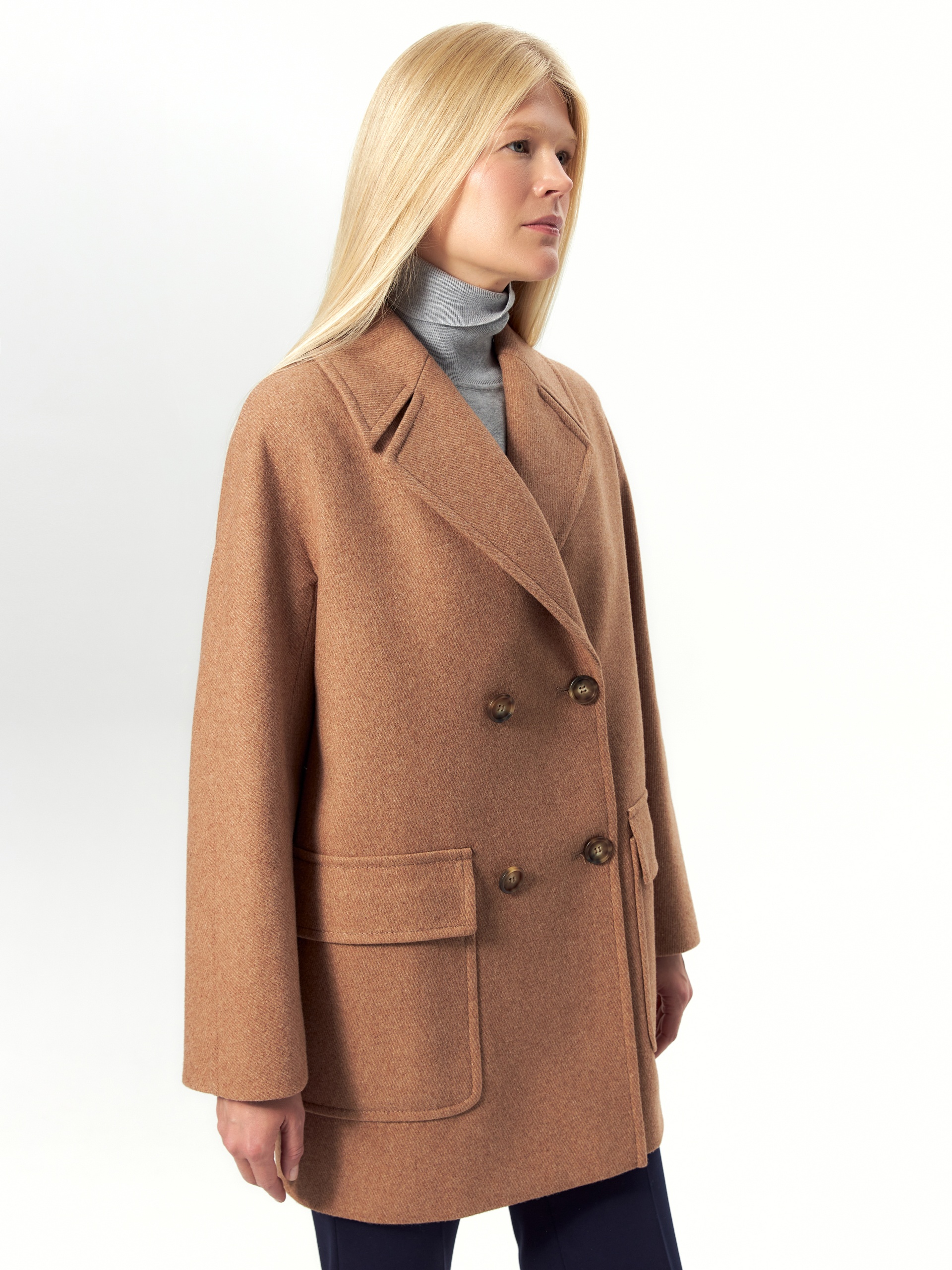 Двубортное укороченное пальто силуэта "кокон" из пальтовой ткани с эффектом "диагональ" в модном карамельном оттенке. Полупальто универсальной длины выше колена, с широким английским воротником и комфортным рукавом уникальной комбинированной конструкции: цельнокроеный спереди и реглан на спинке. Функциональным декоративным элементом служат большие накладные карманы с клапанами. Остроты пальто добавляют широкие отделочные строчки. Застежка на два ряда стильных пуговиц под натуральный рог. Для дополнительной защиты от непогоды изделие выполнено с использованием высокотехнологичной мембраны RaftPro. Произведено в Санкт-Петербурге.