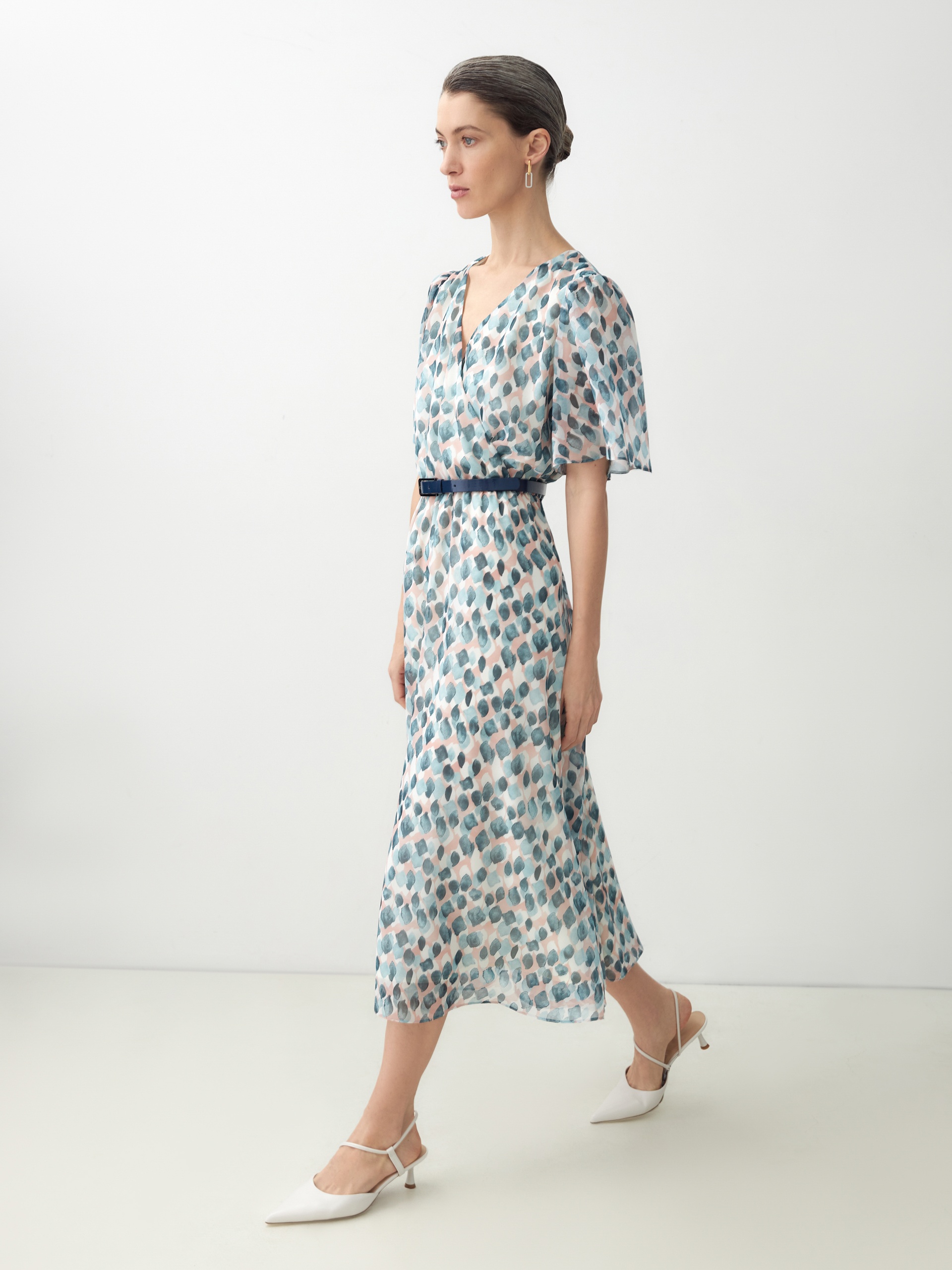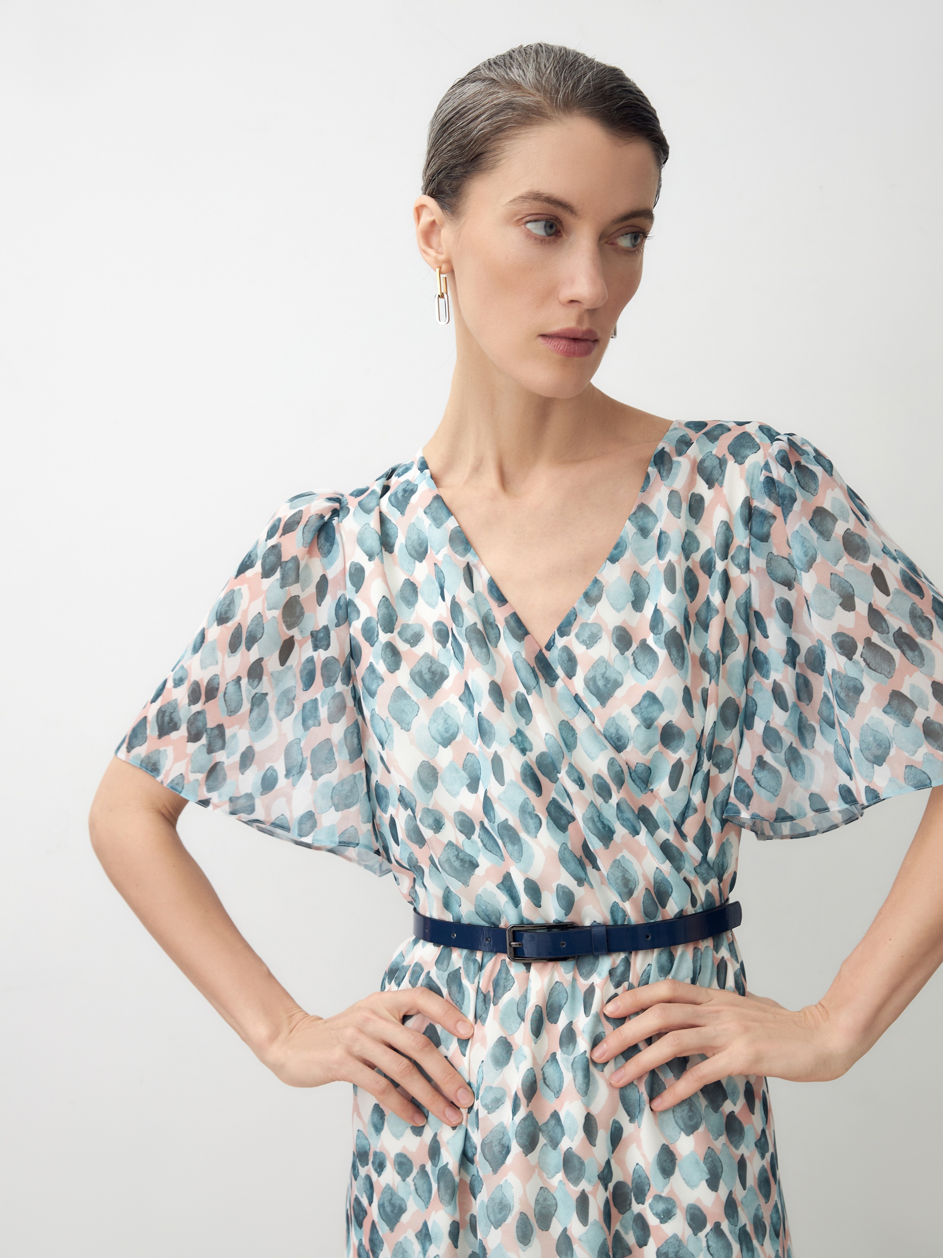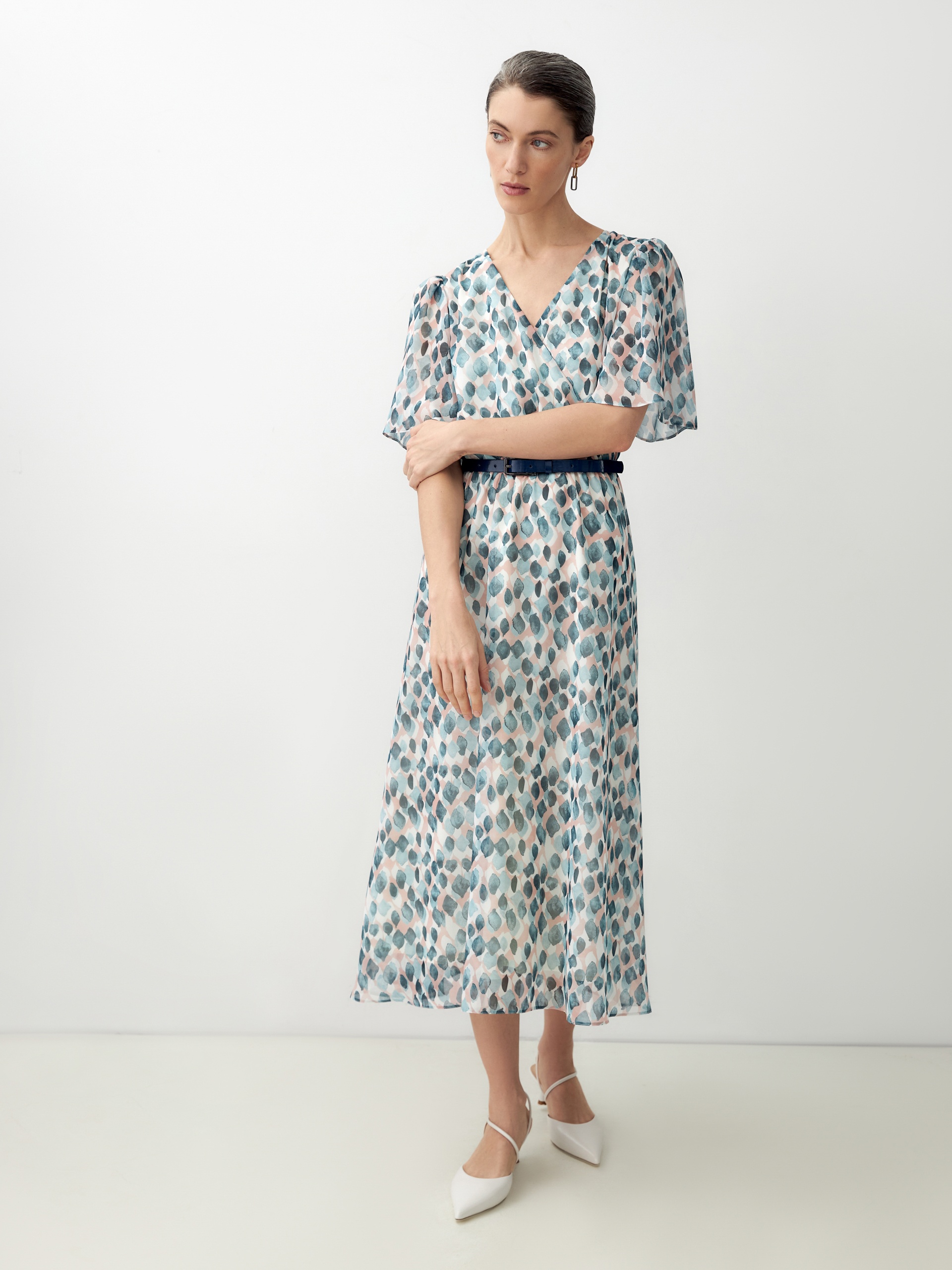 Платье-макси из струящейся полупрозрачной принтованной ткани, лиф и юбка на подкладке. Лиф платья имитирует запах, на талии резинка для лучшей посадки, с "летящим" рукавом. Юбка со сборкой на талии и расклешена к низу. В комплект входит ремень из экокожи.