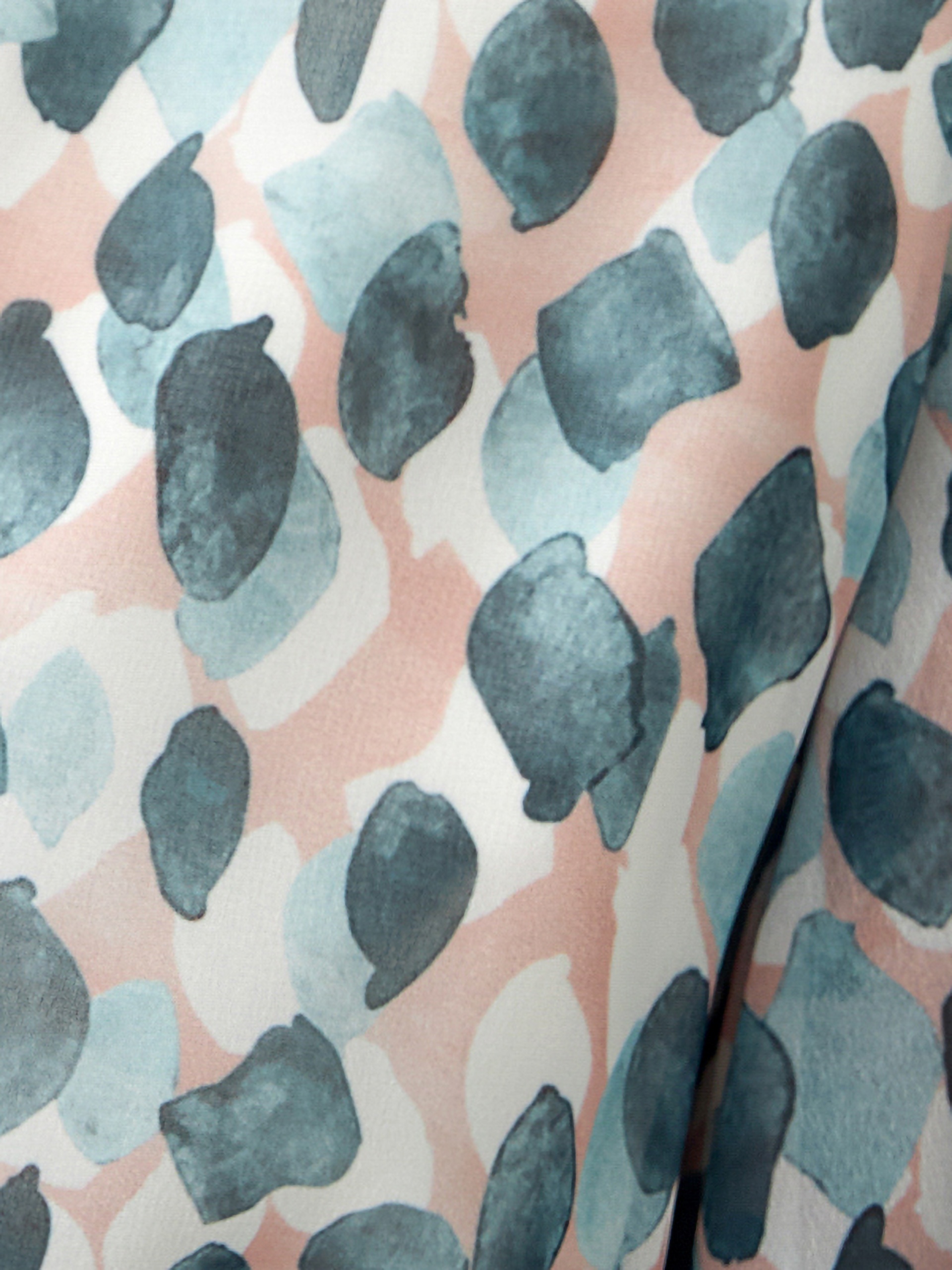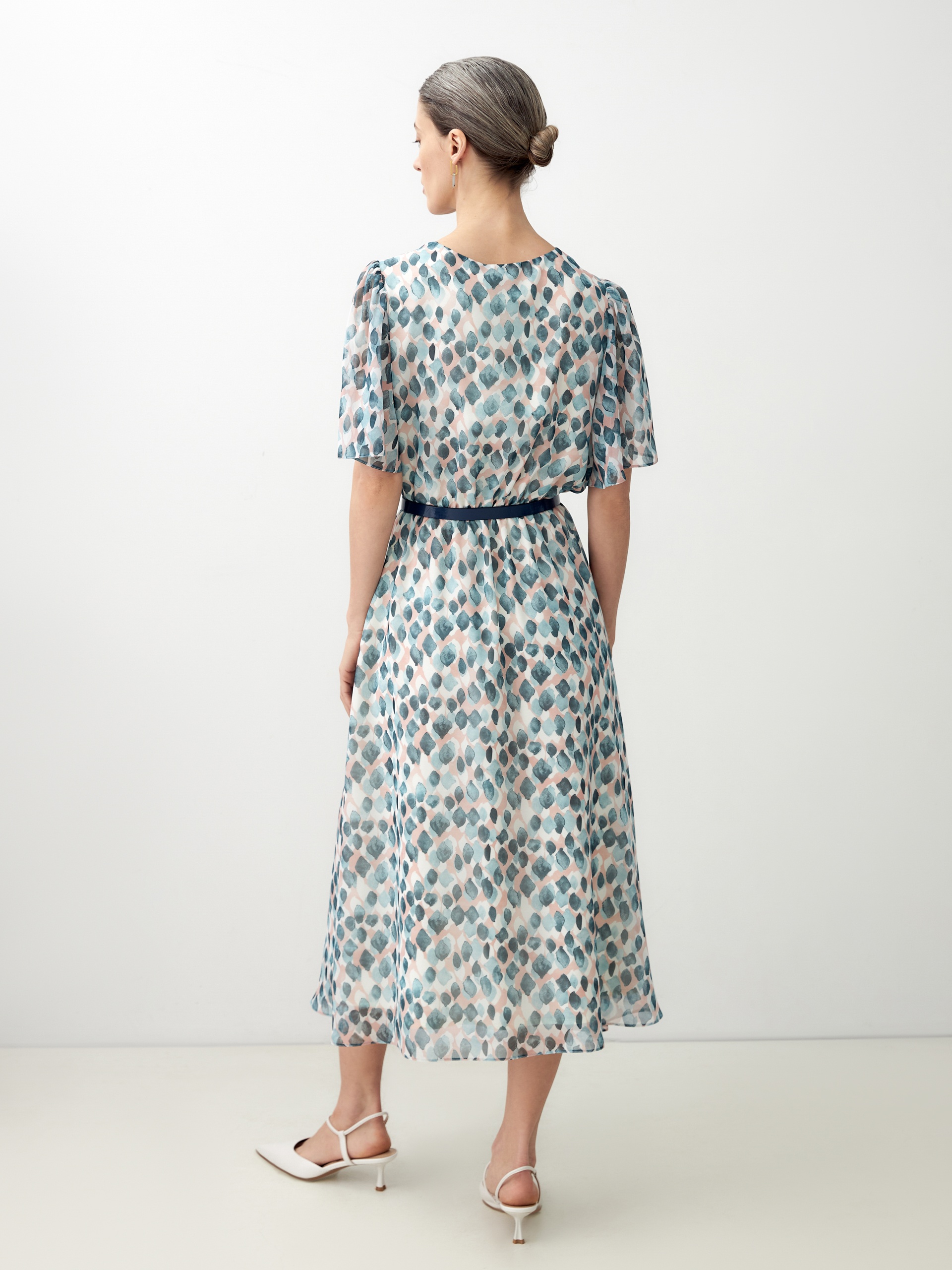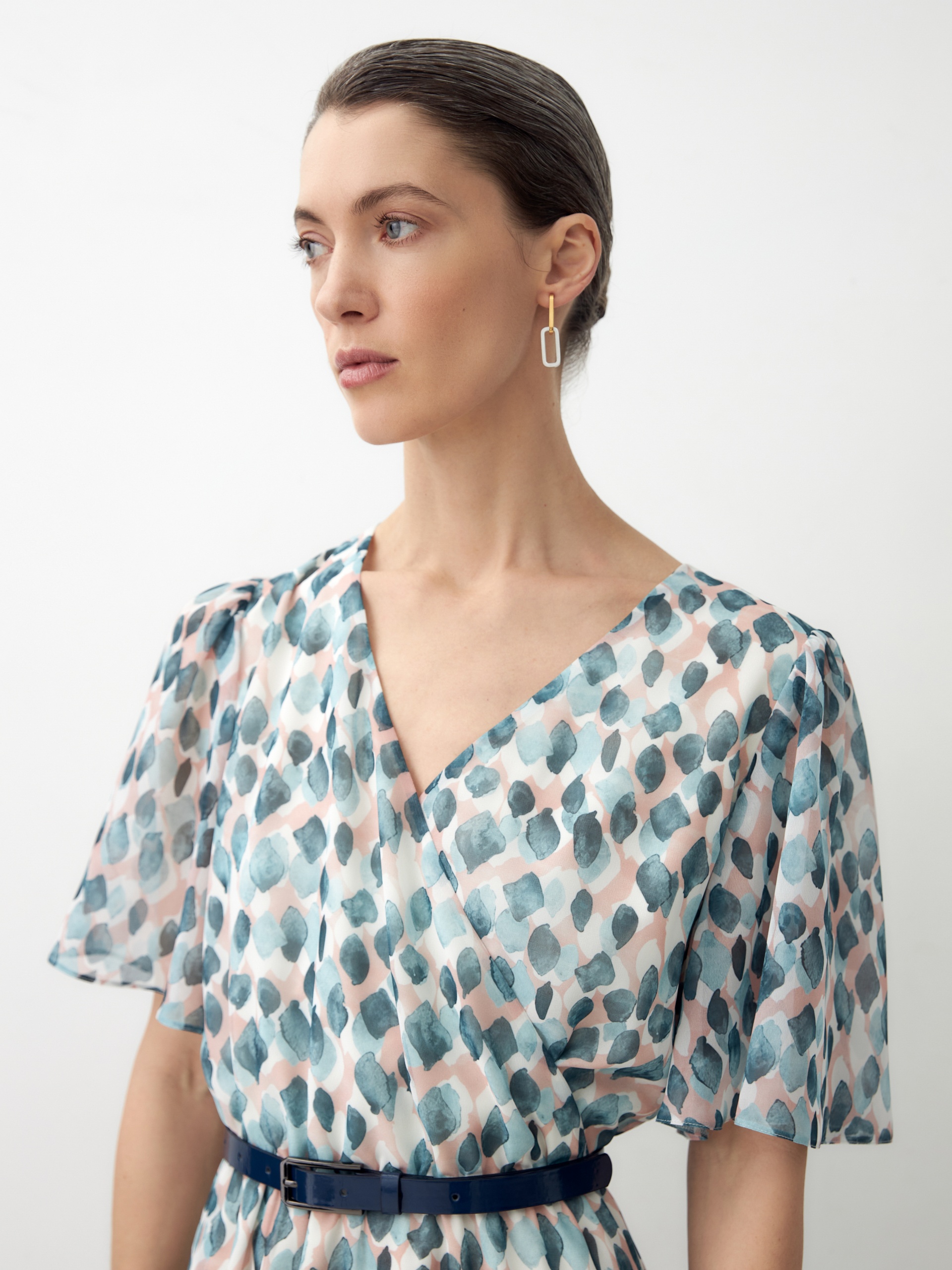 Платье-макси из струящейся полупрозрачной принтованной ткани, лиф и юбка на подкладке. Лиф платья имитирует запах, на талии резинка для лучшей посадки, с "летящим" рукавом. Юбка со сборкой на талии и расклешена к низу. В комплект входит ремень из экокожи.