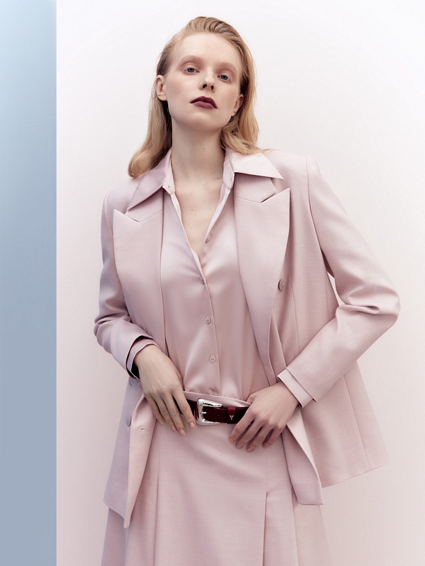 Приталенная блуза из плотной вискозной атласной ткани и трендовым острым воротником. Блуза с классическим рукавом и широким манжетом.