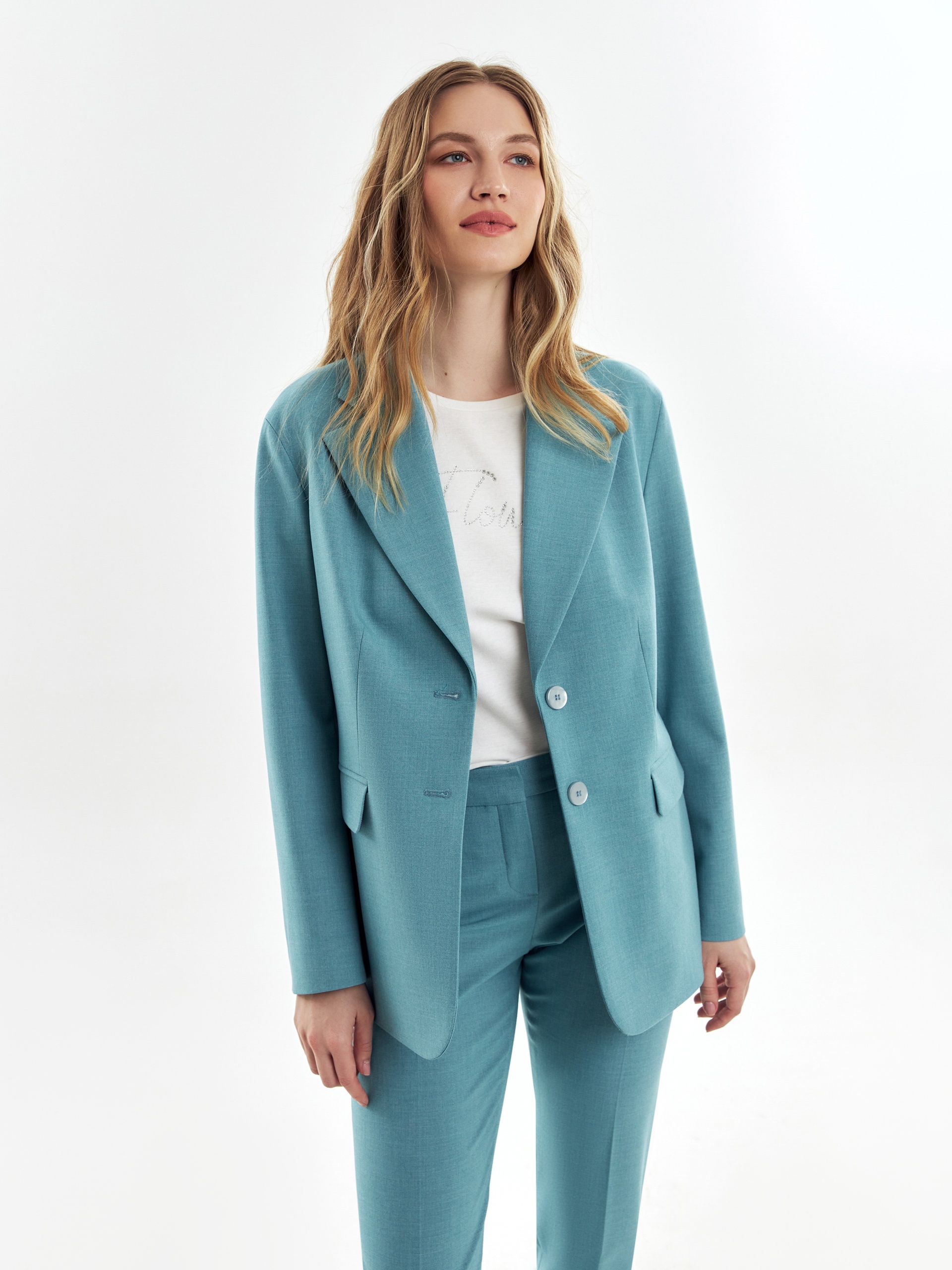 Однобортный жакет на подкладке со спущенной линией плеча и округлыми лацканами. Прорезные карманы с клапанами. Жакет выполнен из костюмной ткани бирюзового цвета.