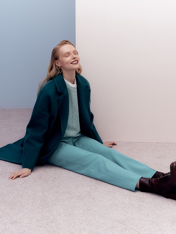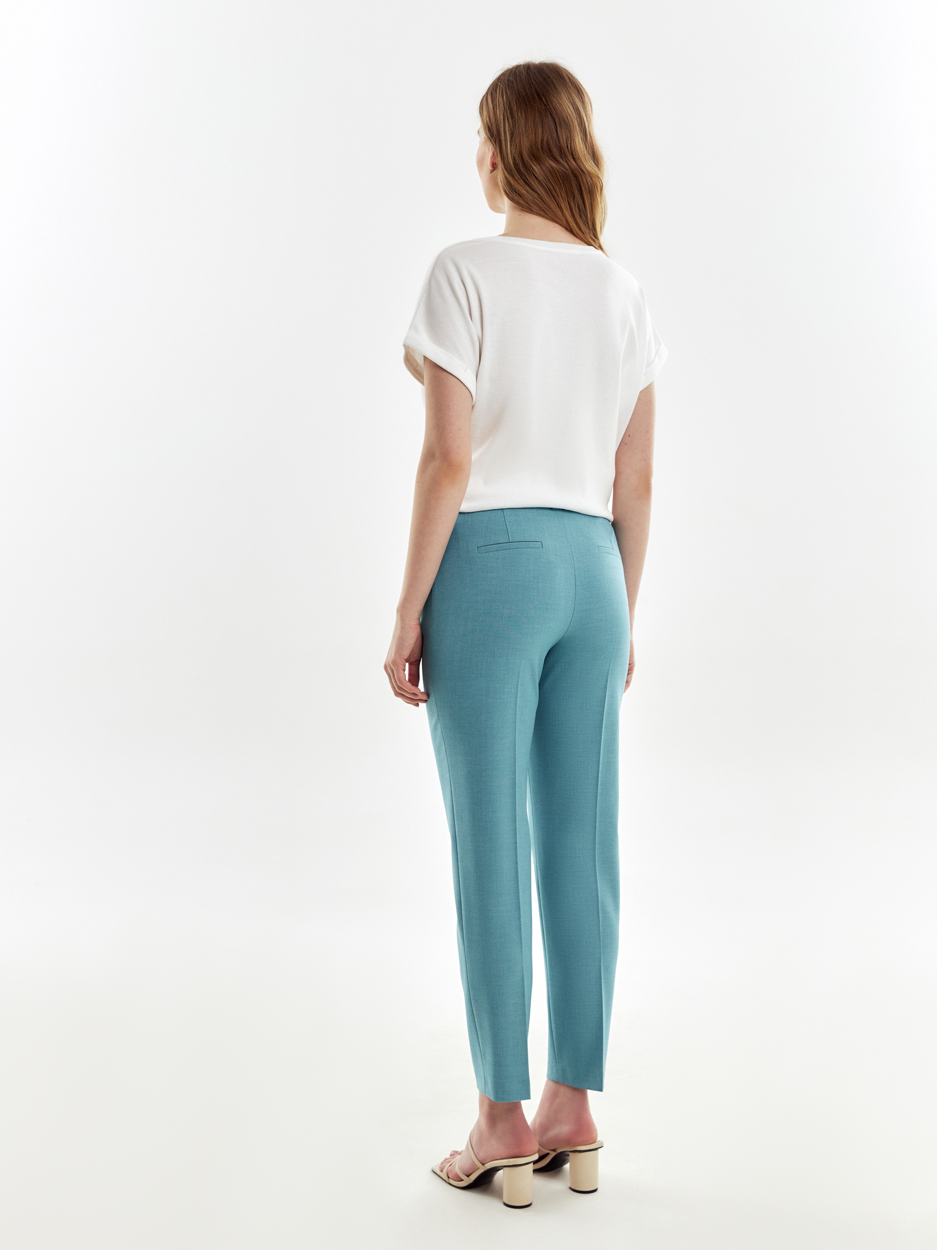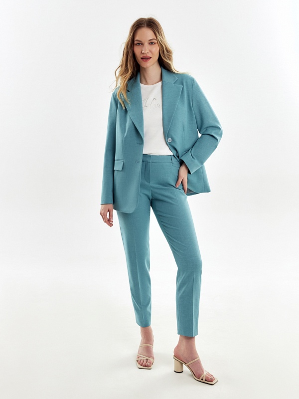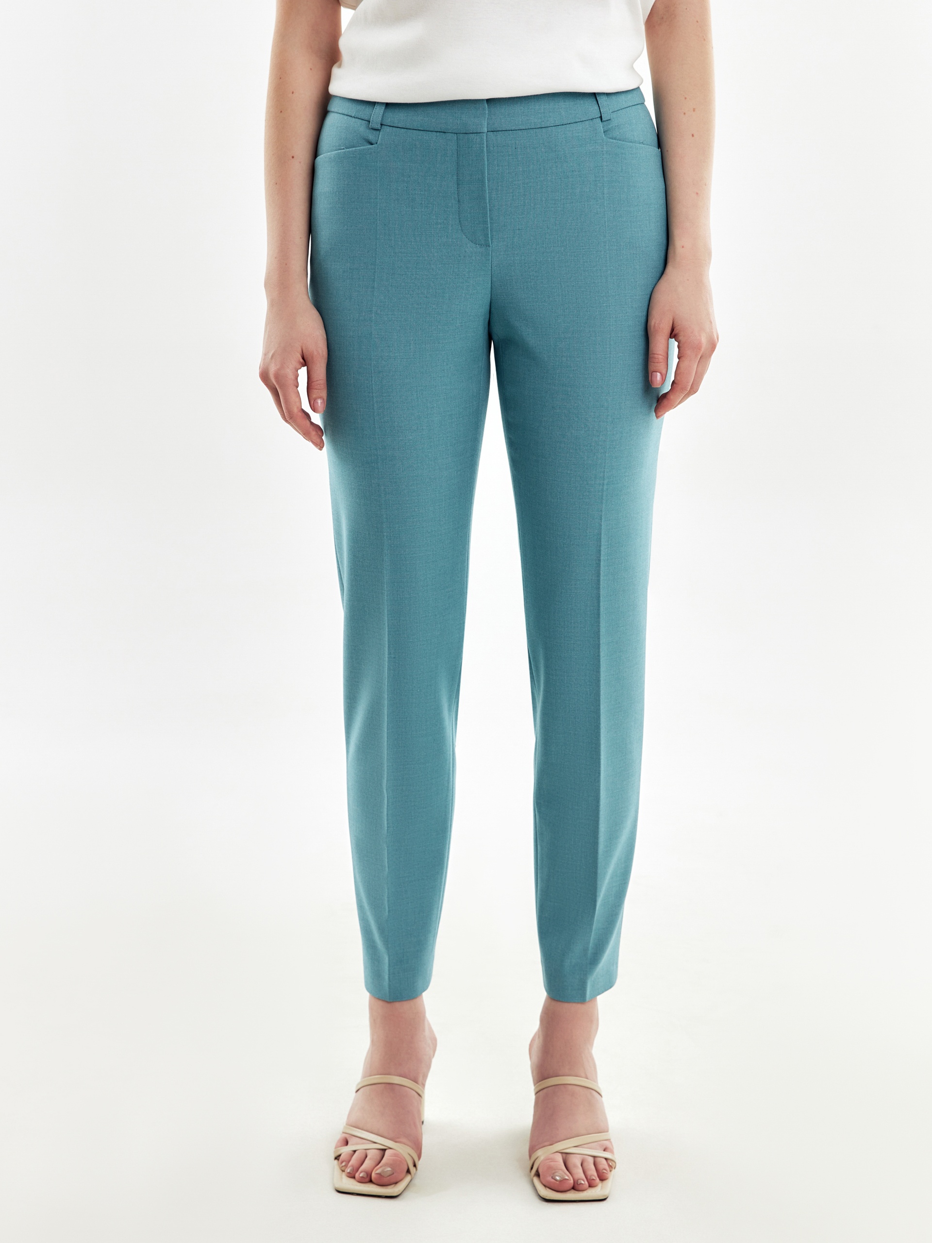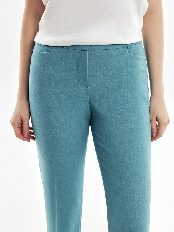 Базовые брюки со стрелками прямого силуэта на притачном поясе со шлевками и рабочими карманами фигурной формы. Застежка спереди на молнию и крючок. Сзади прорезные карманы с листочками.