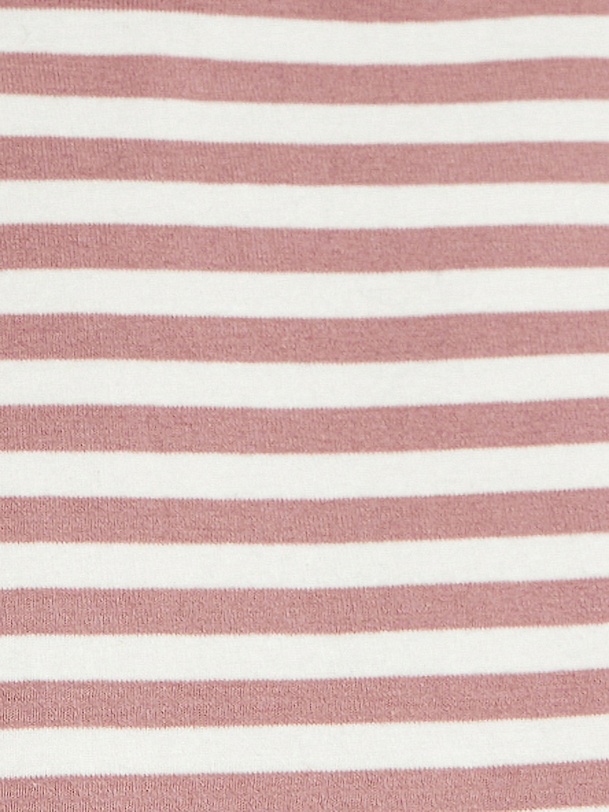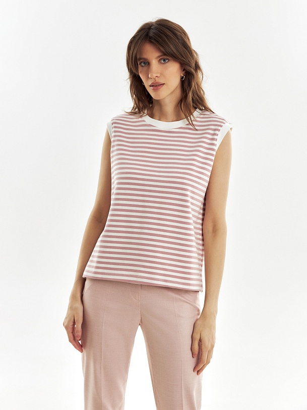 Топ из трикотажа в нежную розово-белую полоску, прямого силуэта, плечо расширено. Идеален для составления стильных кажуальных образов.