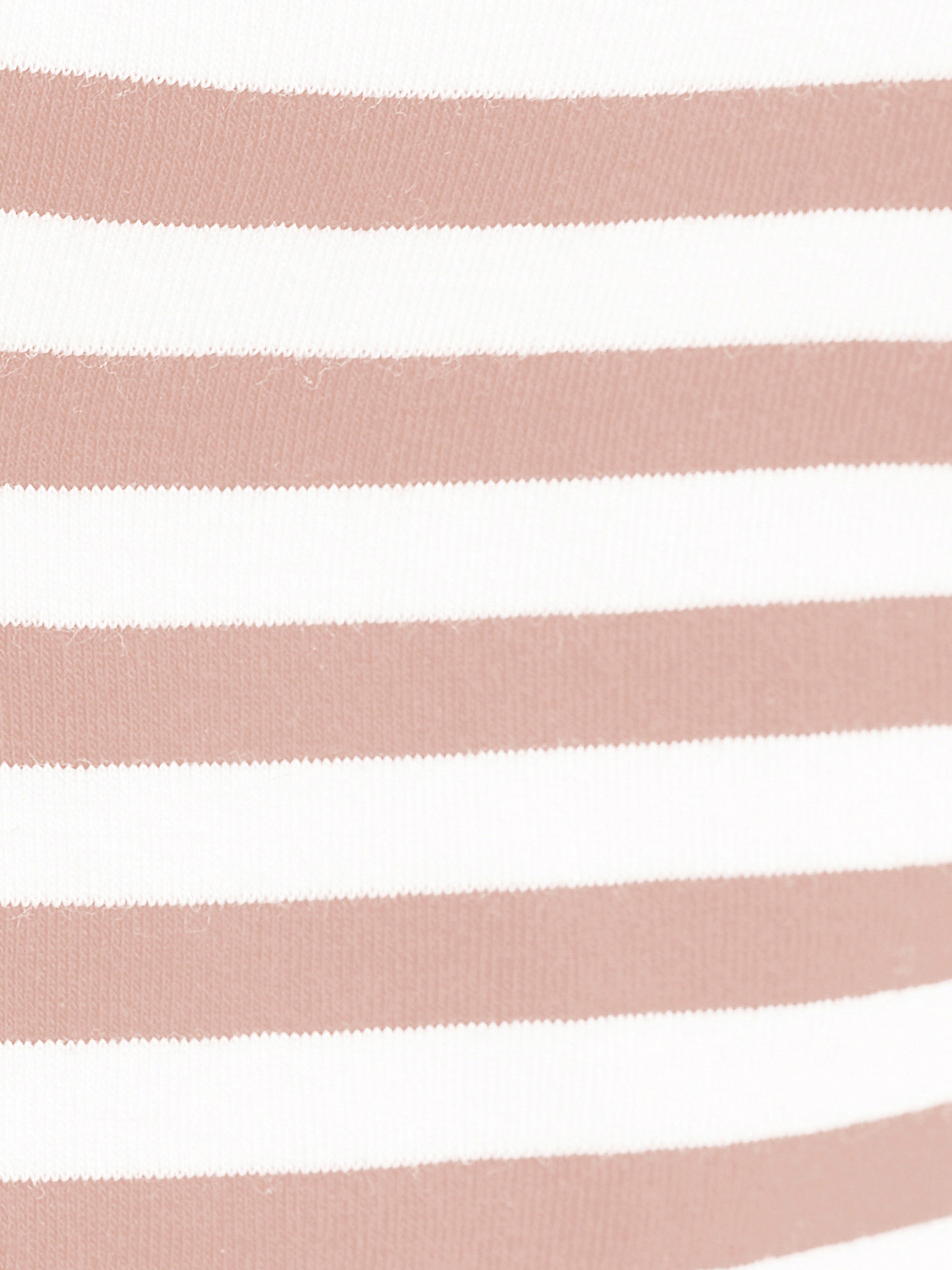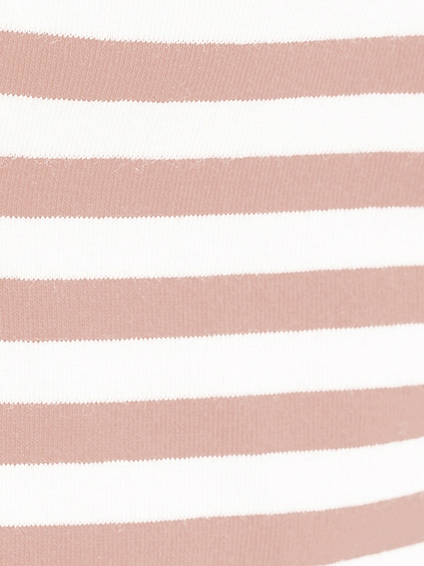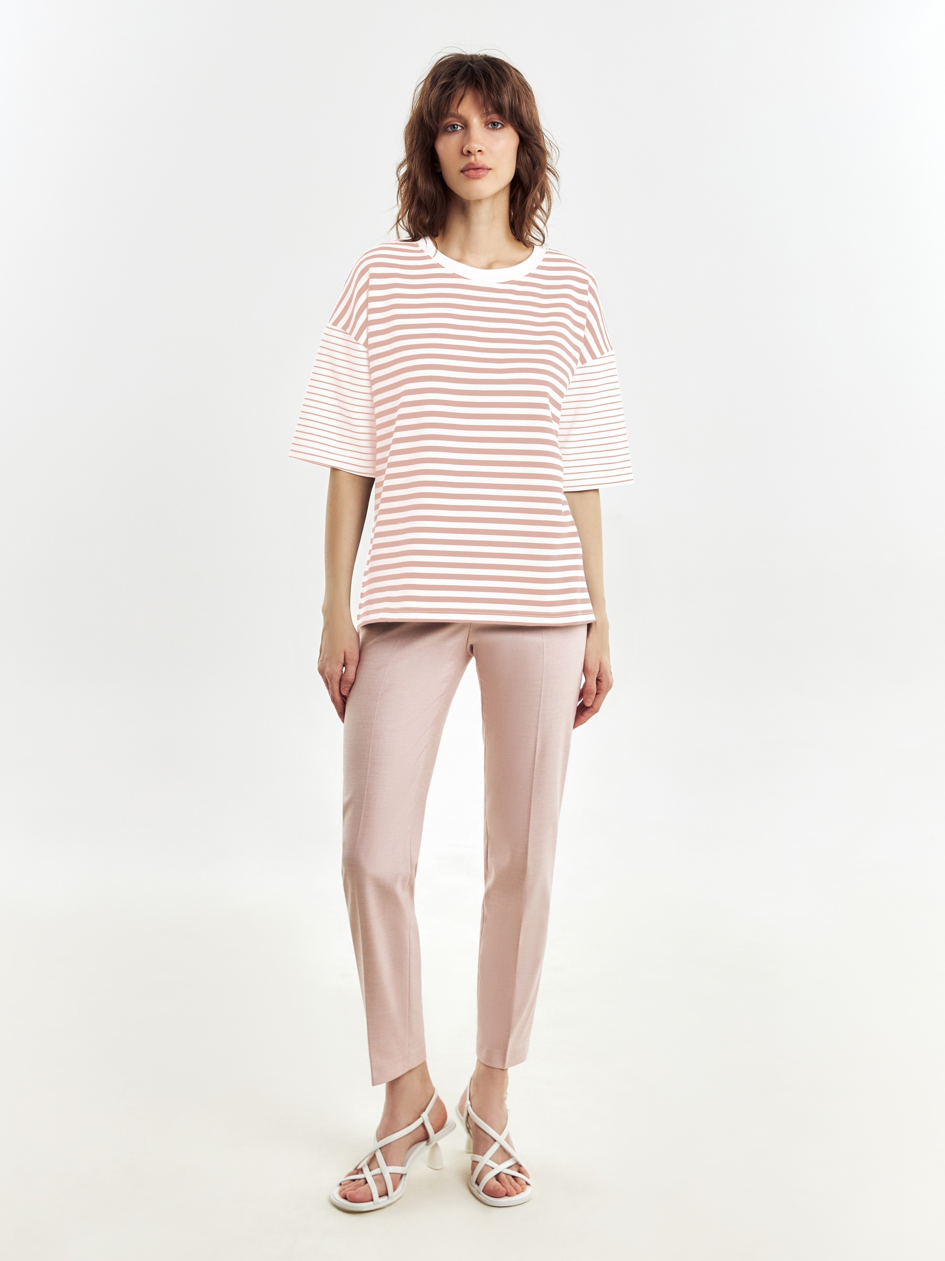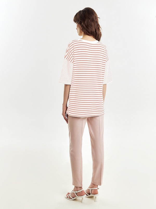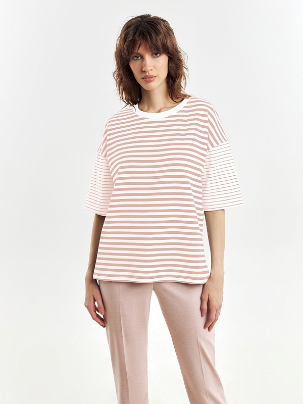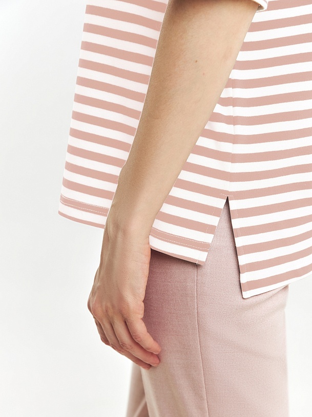 Футболка свободного силуэта с круглой горловиной и спущенной линией рукава, в боковых швах разрезы. Пудровые полоски разного размера придают образу игривости.