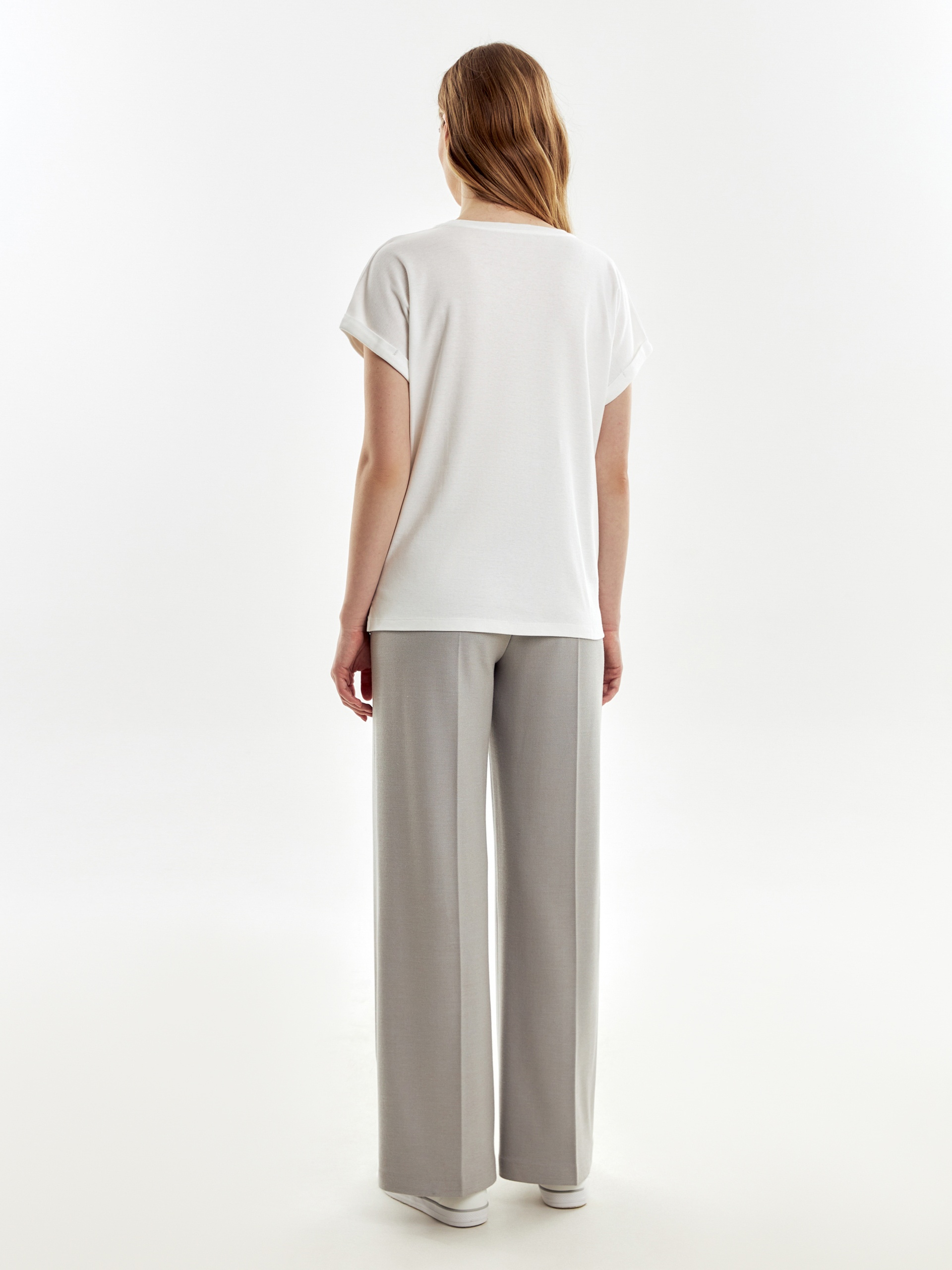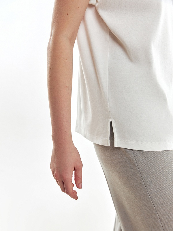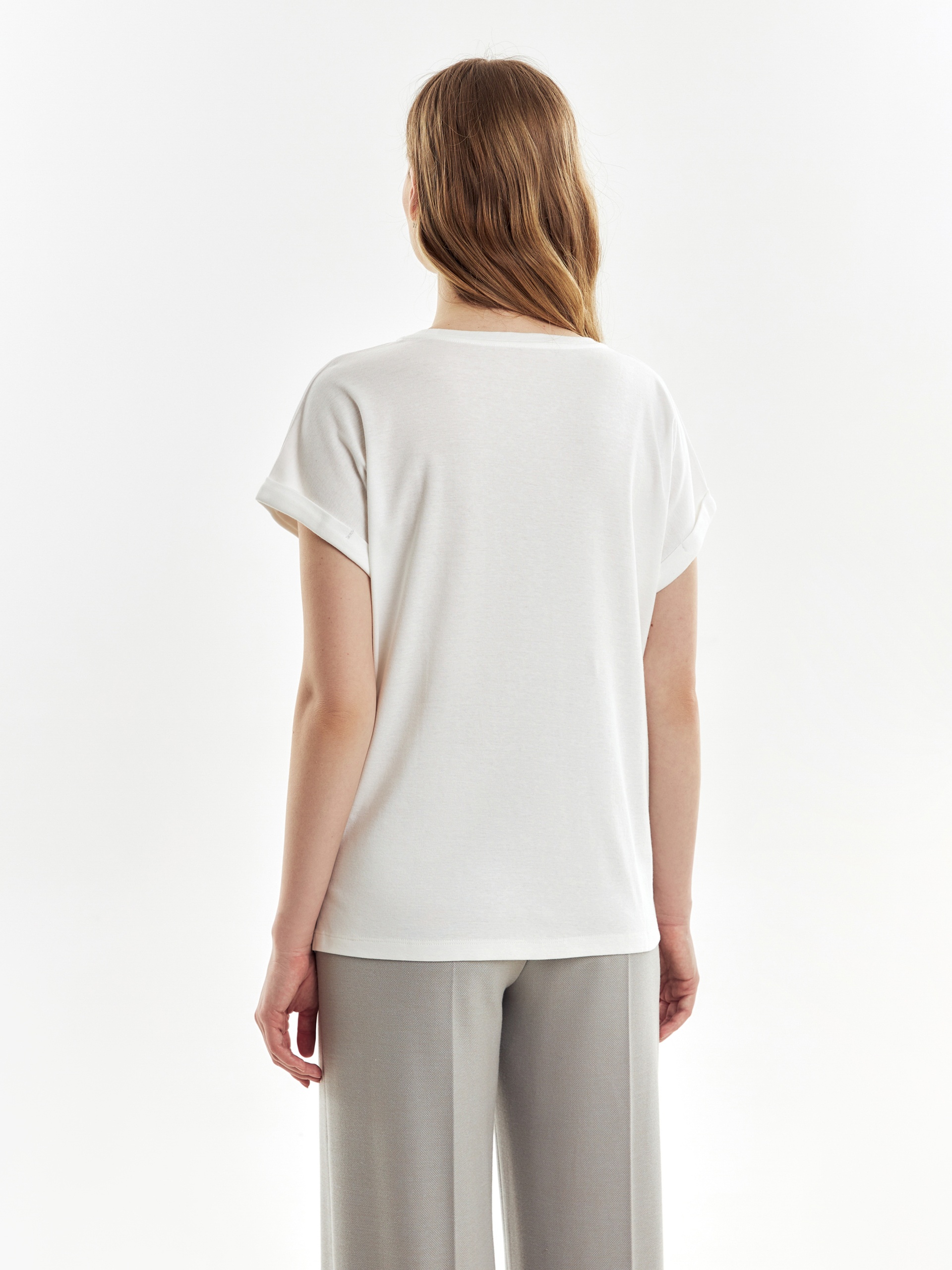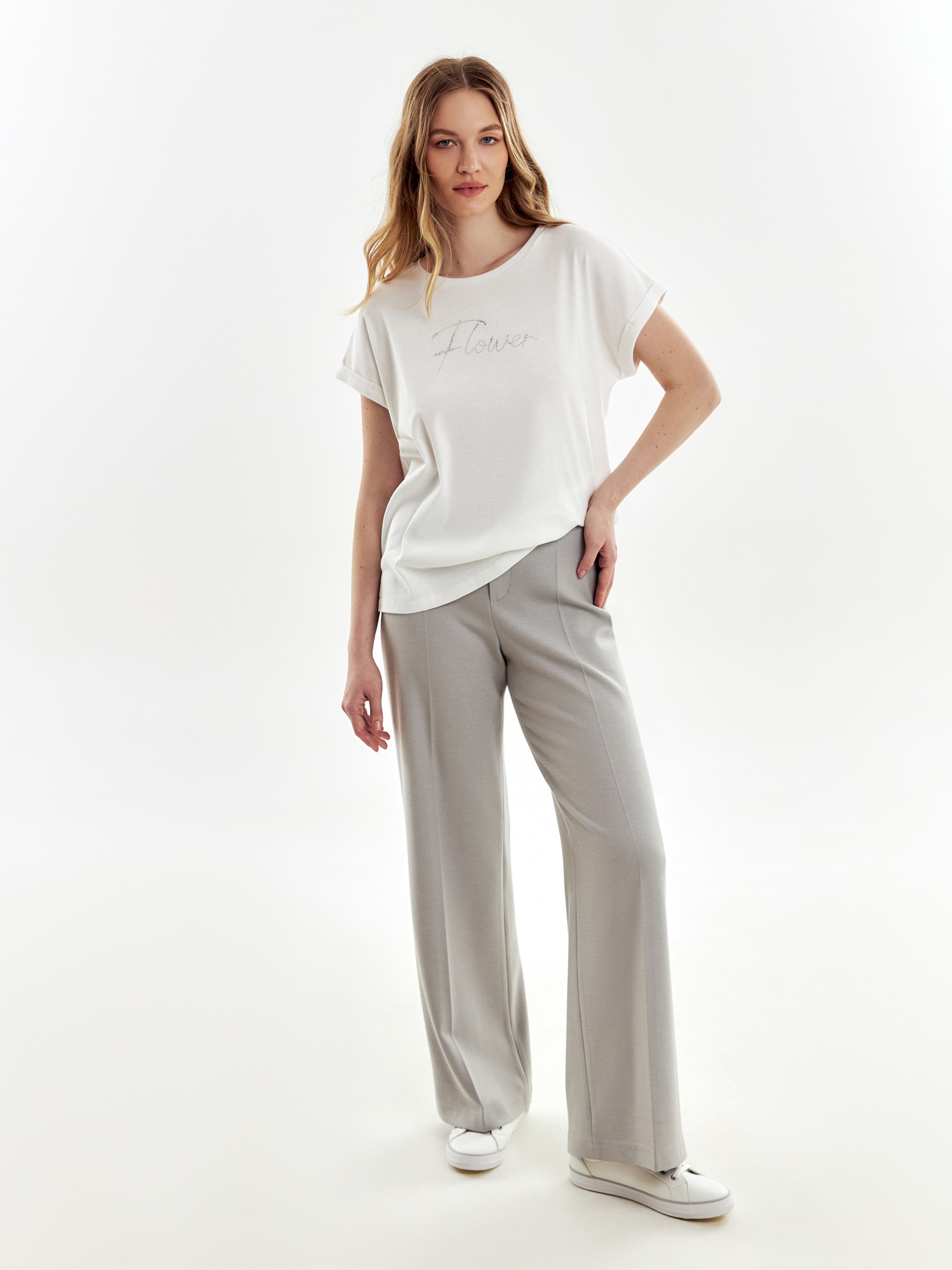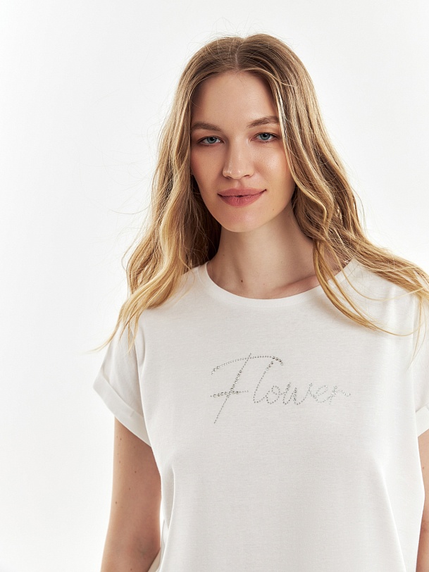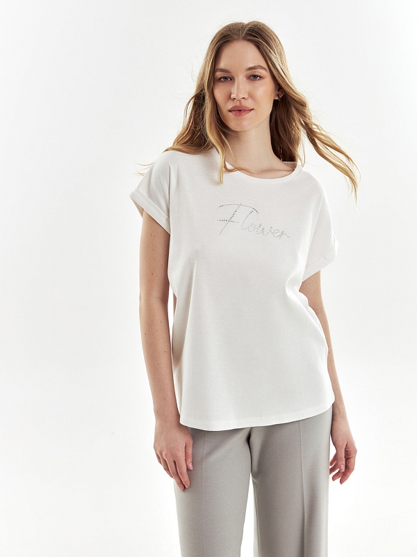 Футболка из премиального мерсеризированного хлопка, свободного кроя и с деликатным принтом из страз на полочке. Мерсеризированный хлопок имеет шелковистый блеск и не деформируется после стирок, практически не мнется и не выцветает со временем.