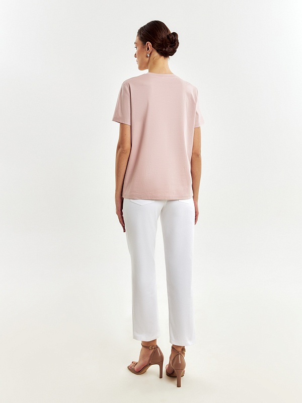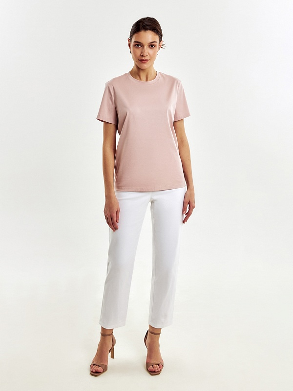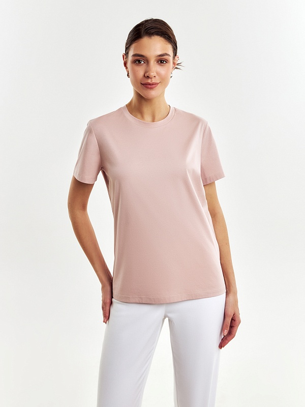 Футболка прямого силуэта нежного цвета пыльной розы будет прекрасно сочетаться как с денимными изделиями, так и с классическими ансамблями. Мерсеризированный хлопок имеет шелковистый блеск и не деформируется после стирок, практически не мнется и не выцветает со временем.