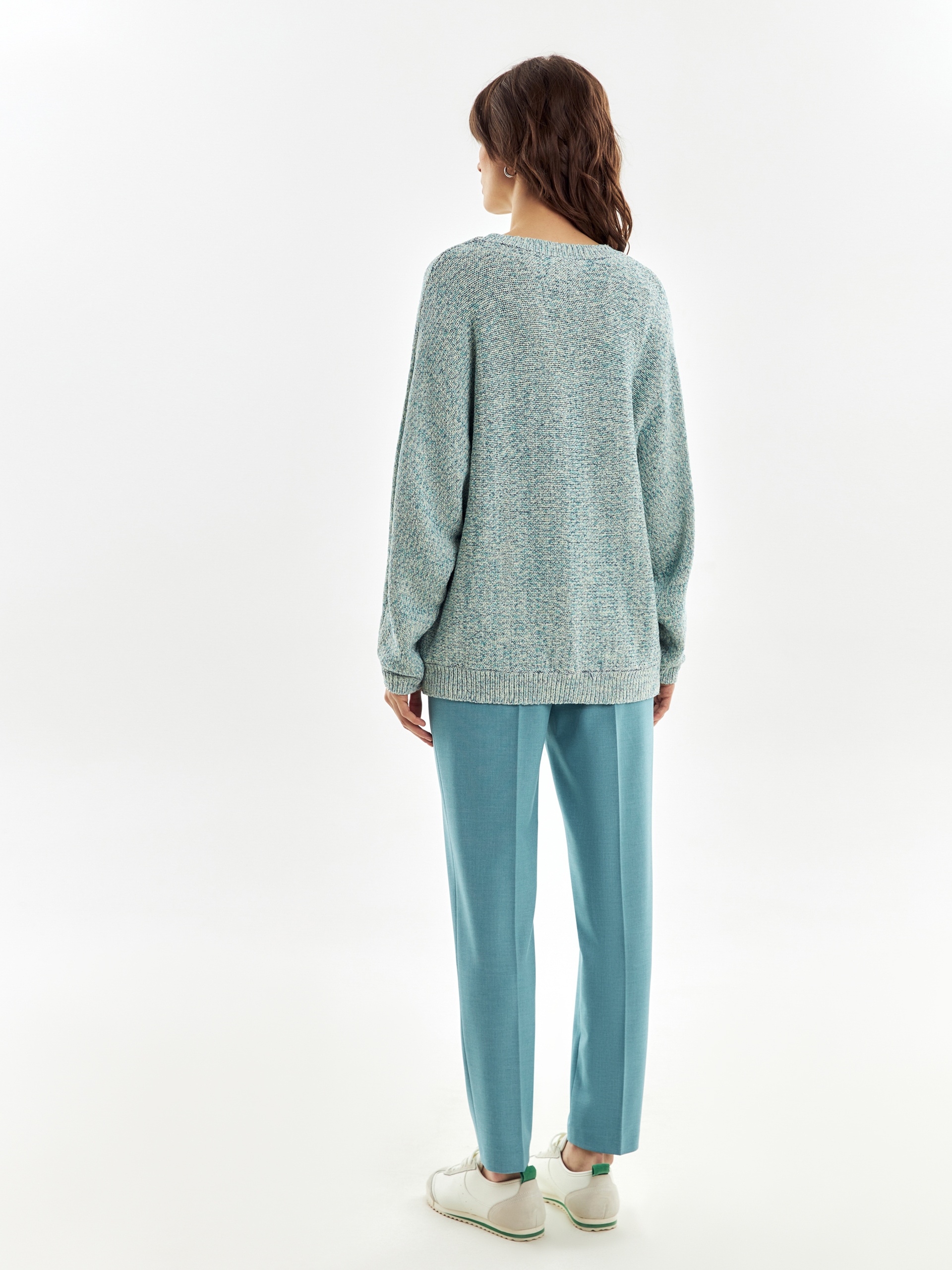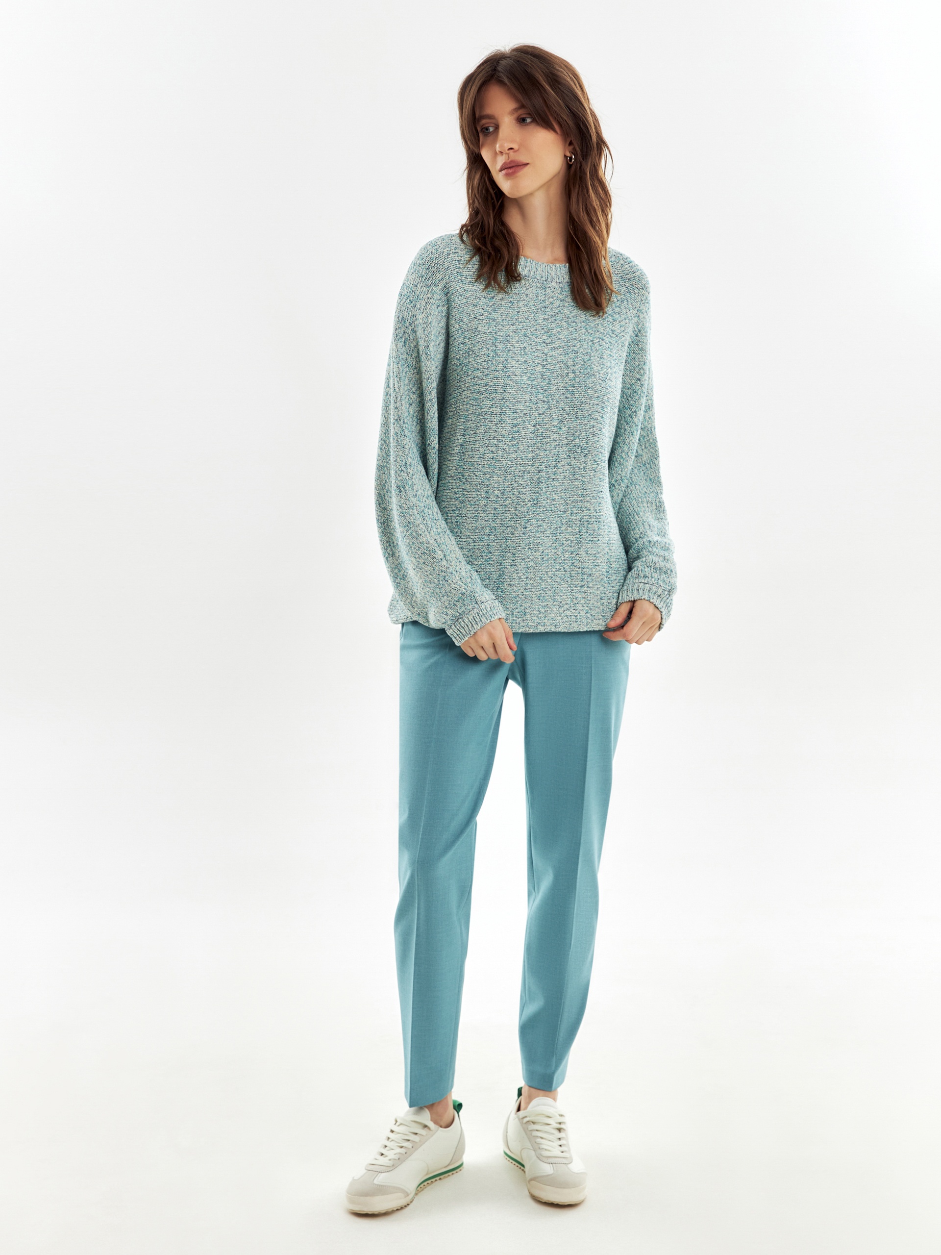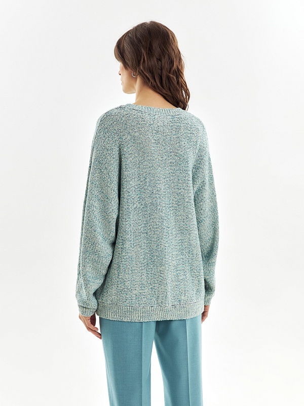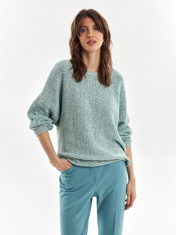 Мягкий джемпер в стиле оверсайз, крупной вязки из ленточной пряжи, со спущенным плечом и рукавом три четверти.