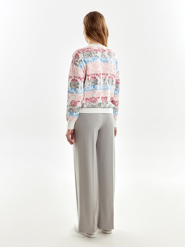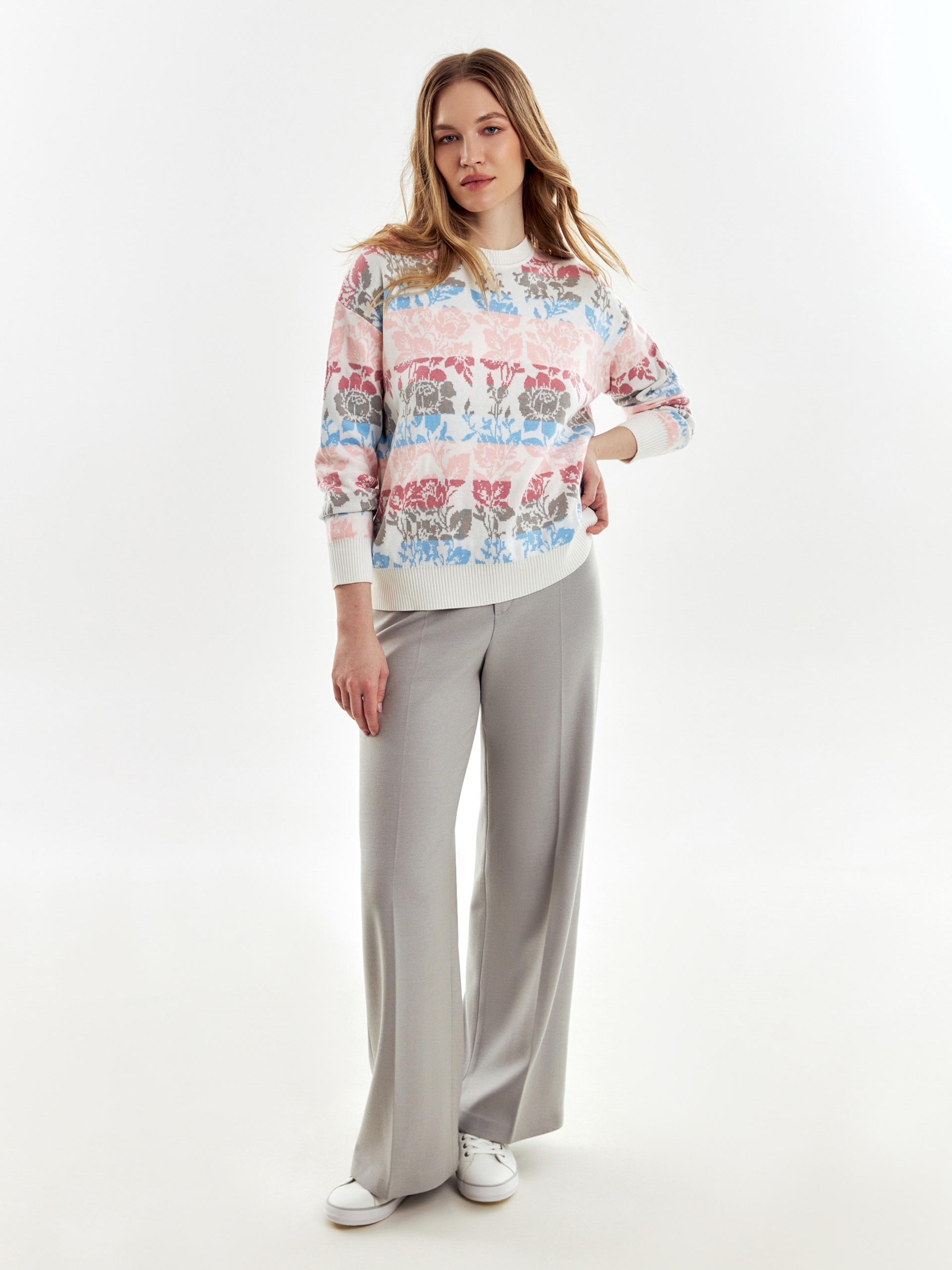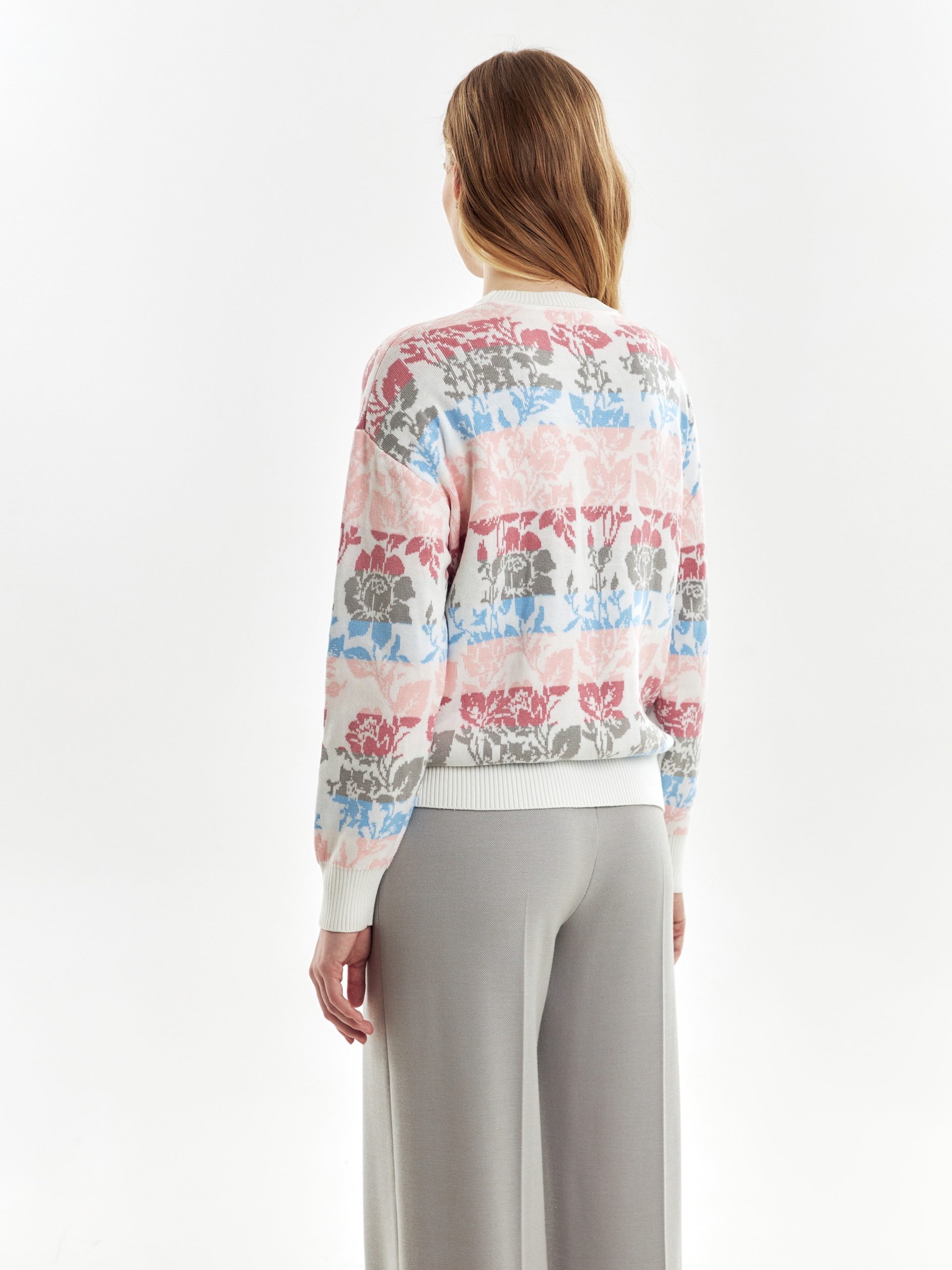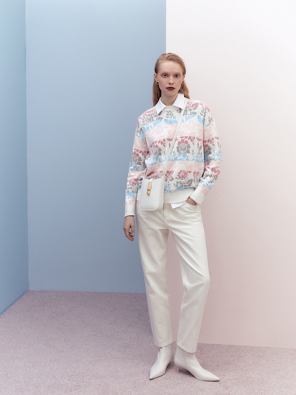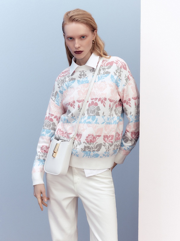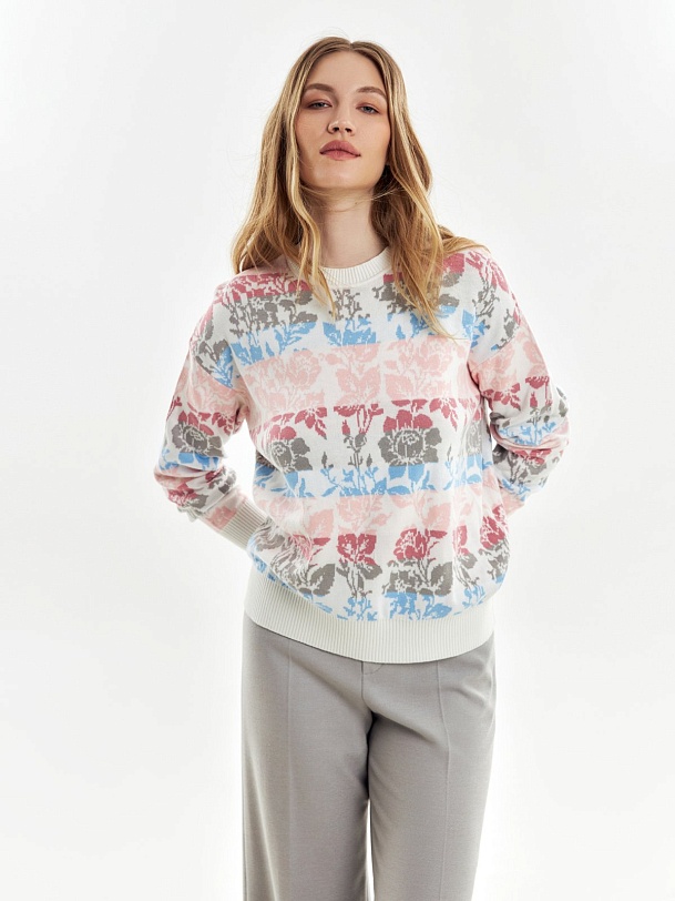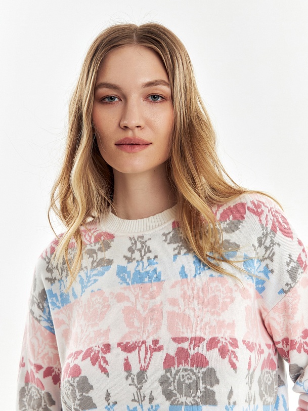 Эффектный жаккардовый свитер с цветочным мотивом по всему изделию будет вашим теплым спутником не только предстоящей весной, но и в течение всего года.