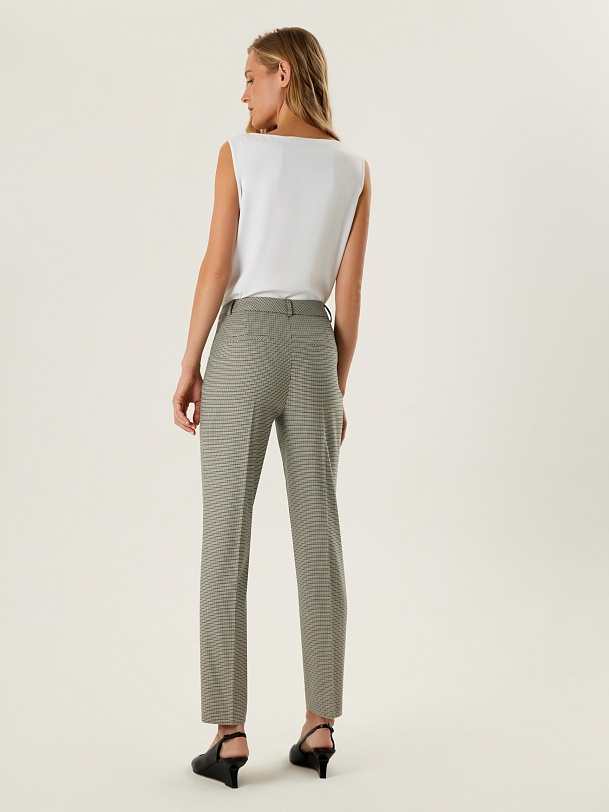 Базовые брюки со стрелками прямого силуэта на притачном поясе со шлевками и рабочими карманами фигурной формы. Застежка спереди на молнию и крючок. Сзади прорезные карманы с листочками.