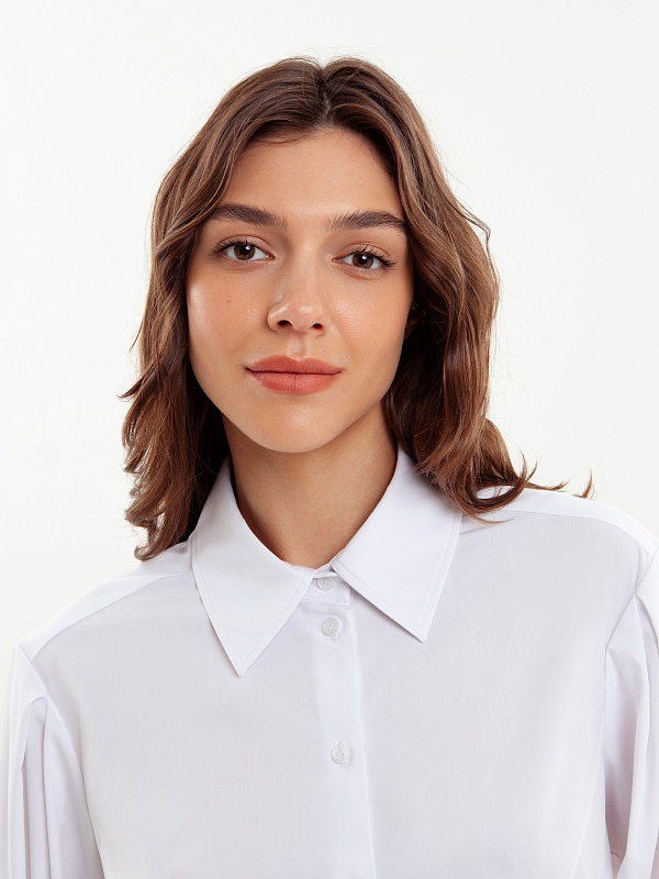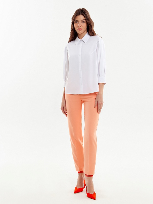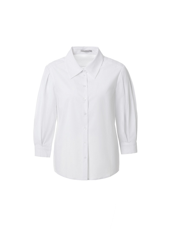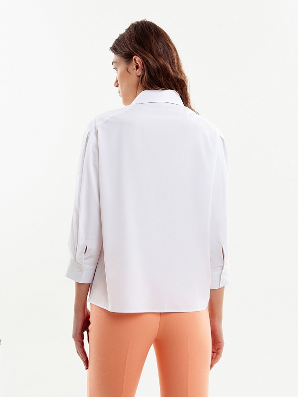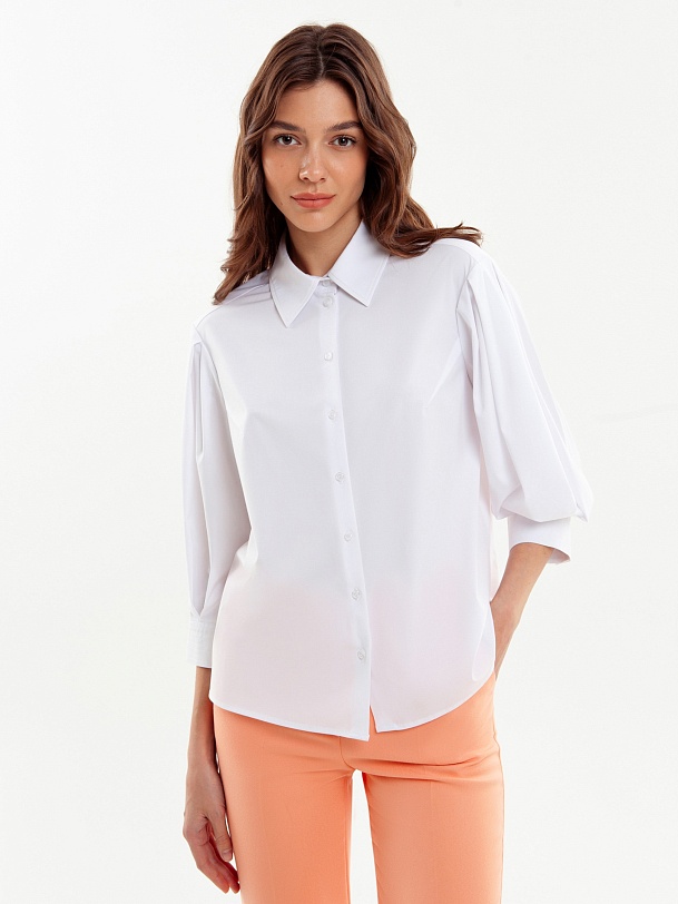 Прямая блуза со спущенным плечом и рукавом 3/4 со складками на манжете. Манжеты с декоративной строчкой. Блуза выполнена из блузочной ткани с добавлением хлопка.