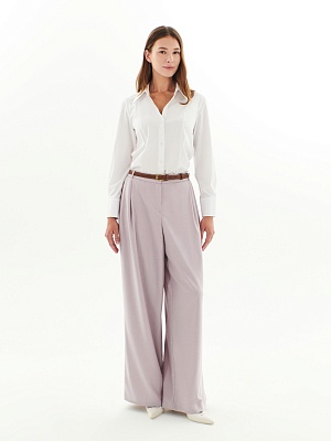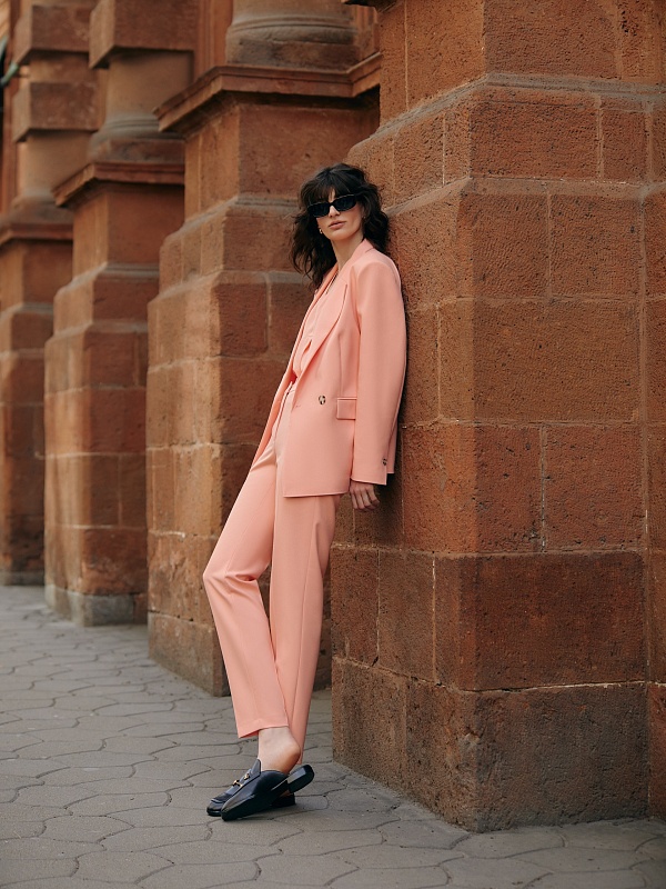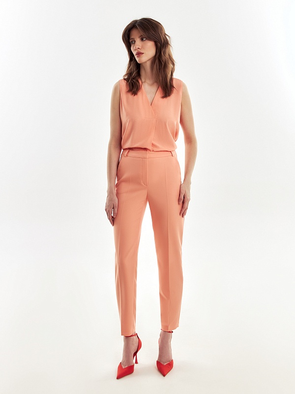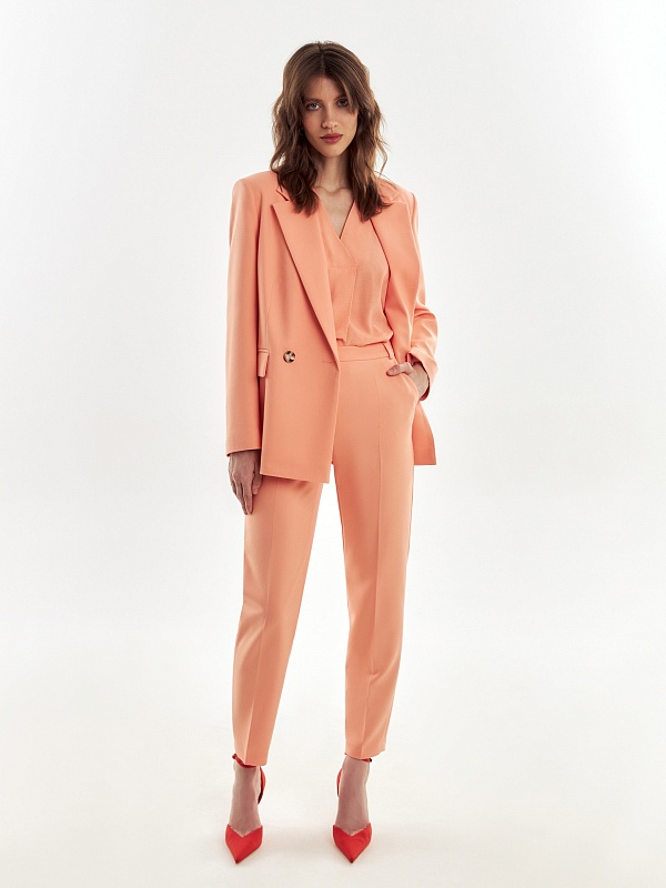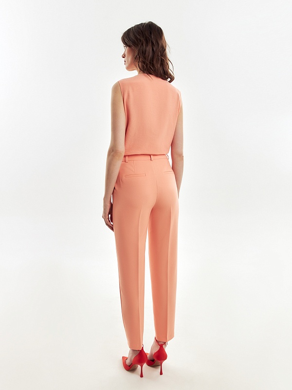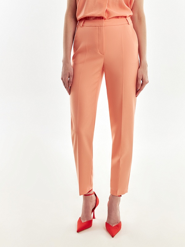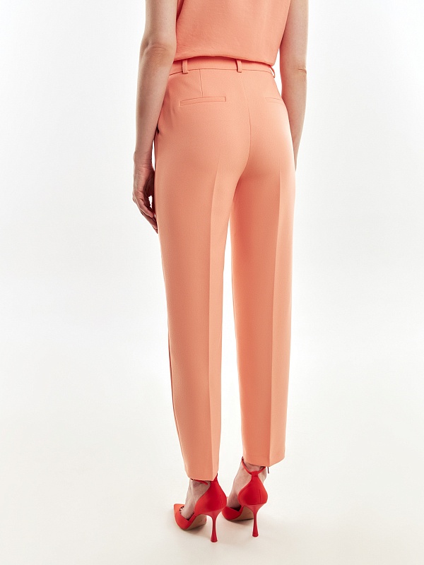Брюки со стрелками из костюмной ткани в нежно-персиковом цвете, зауженного к низу силуэта на притачном поясе со шлевками. Спереди рабочие боковые карманы и застежка на молнию и крючок. Модель идеально сочетается с жакетом из этой же ткани.