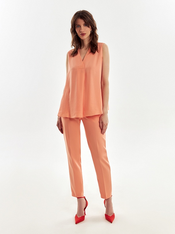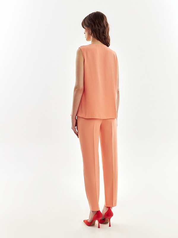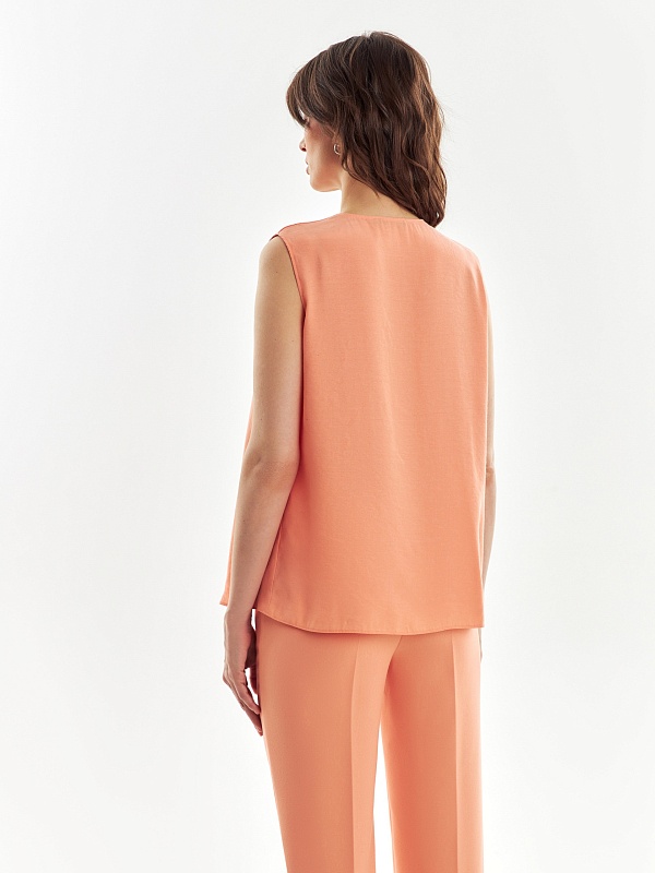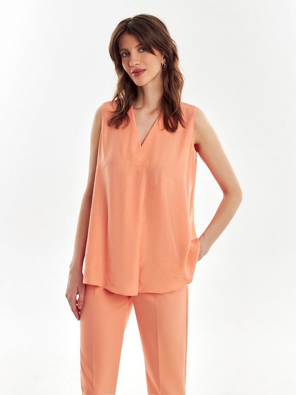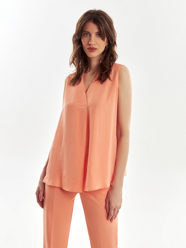 Топ прямого силуэта из вискозной ткани в нежно-персиковом цвете, без рукавов, с V-образным вырезом горловины и складкой на полочке.
