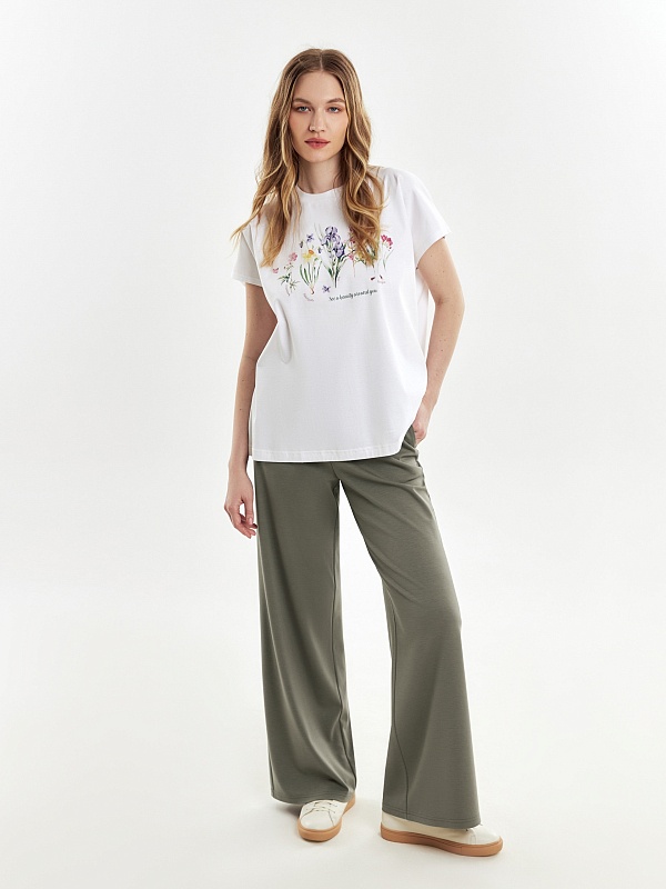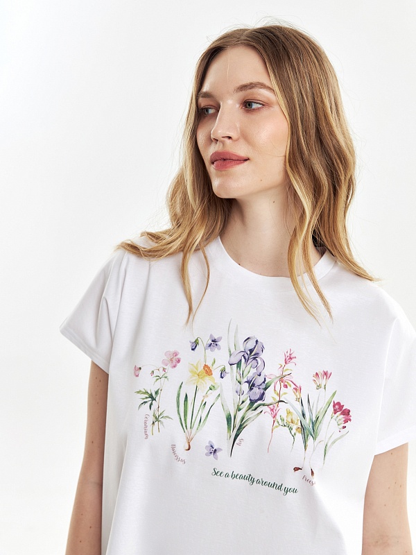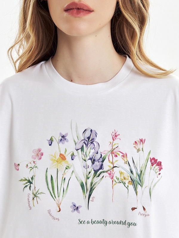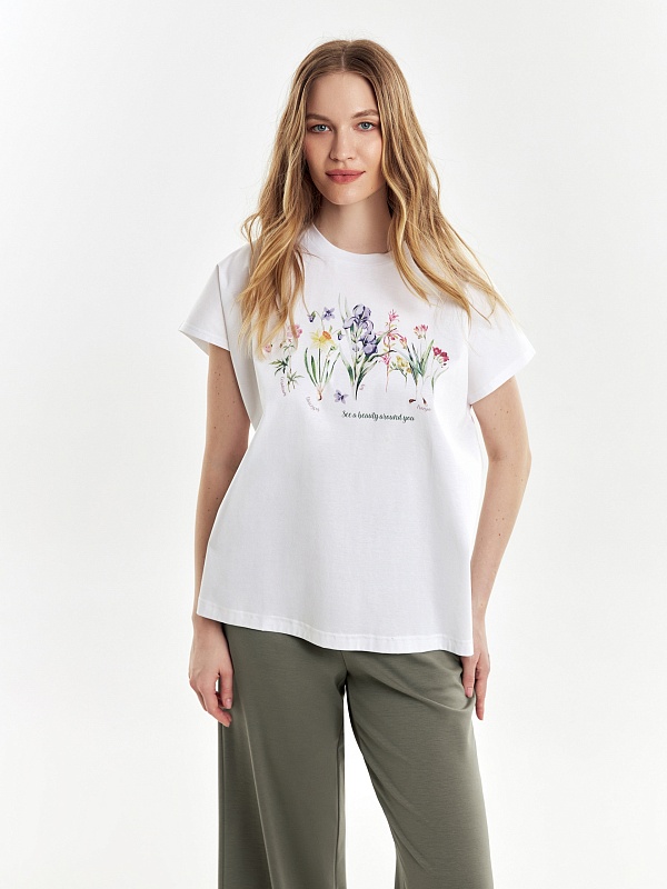 Футболка очень милая,особенно для тех, кто любит растительный принт. Но сильно большемерит. На свой 50р. заказала 48, но подошел бы даже 46. А так, рекомендую, качество на высоте.