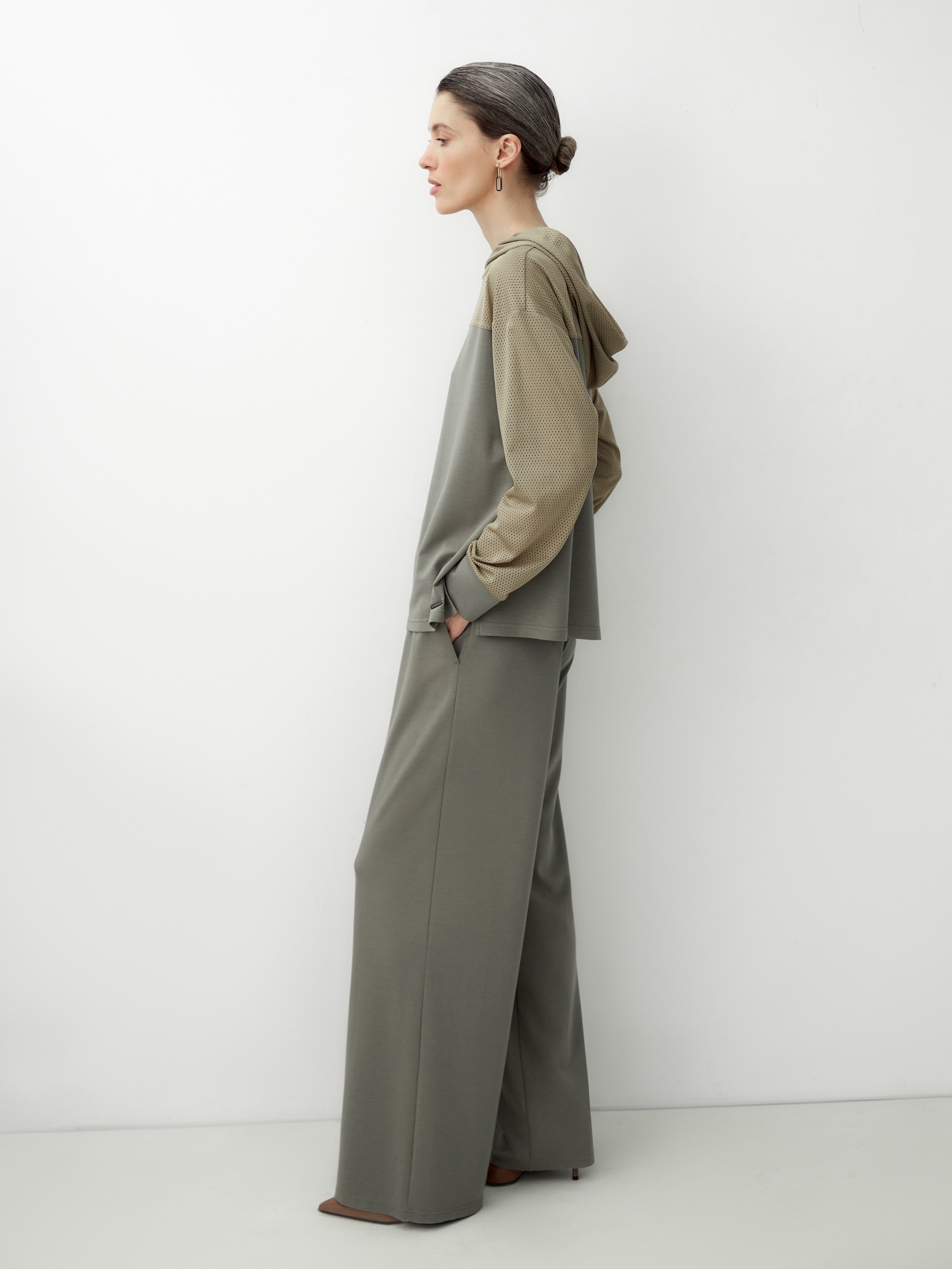 Широкие прямые трикотажные брюки, по бокам карманы, в поясе резинка. Составляет комплект с толстовкой из одной капсулы и создает кэжуальный расслабленный образ.