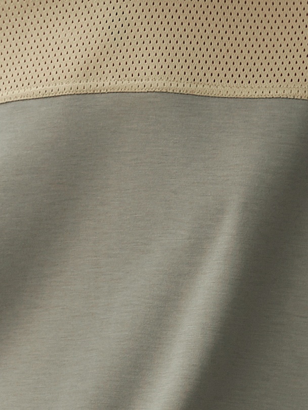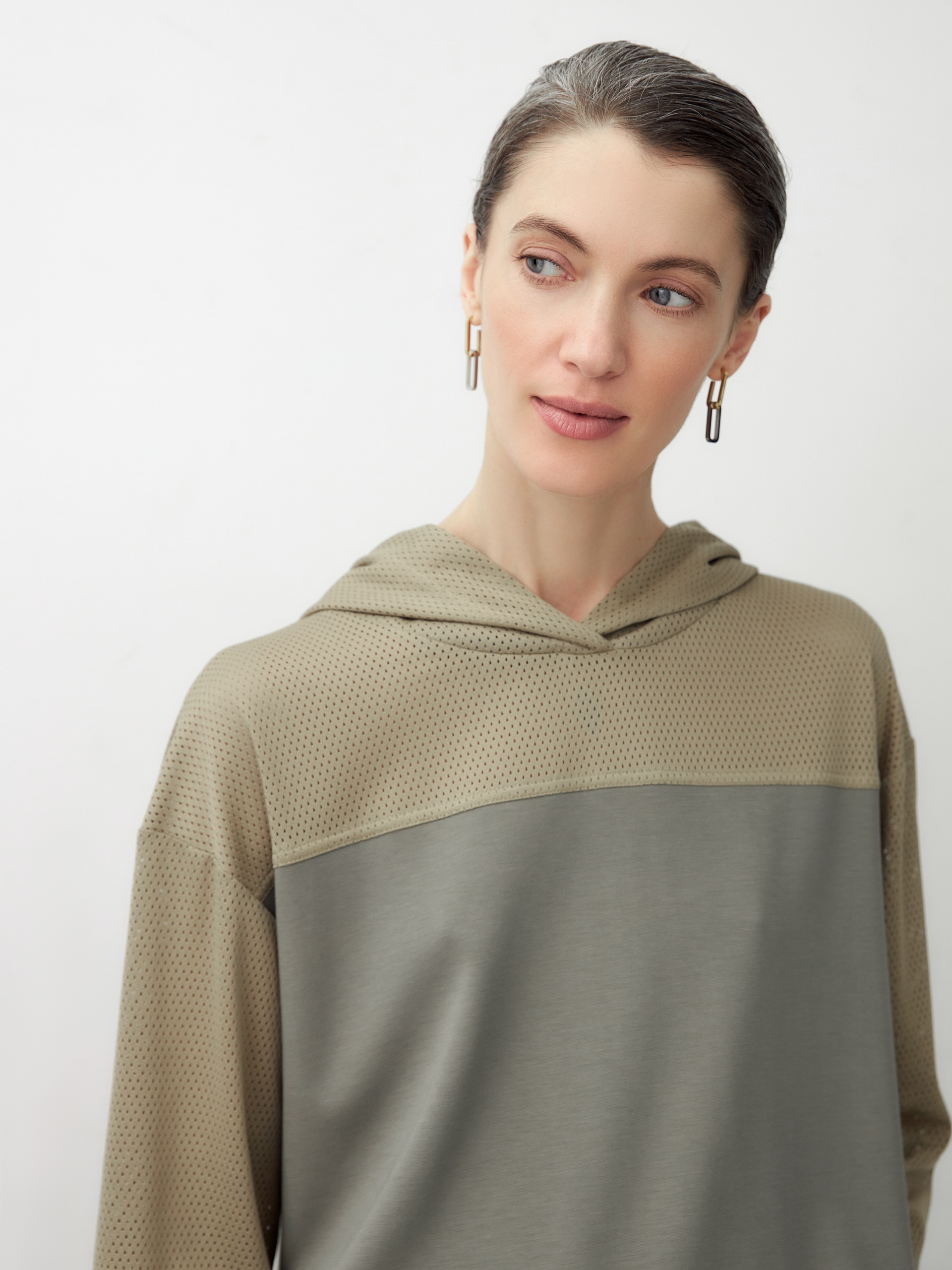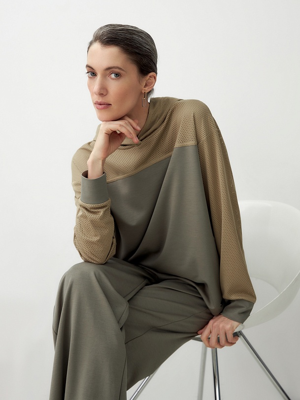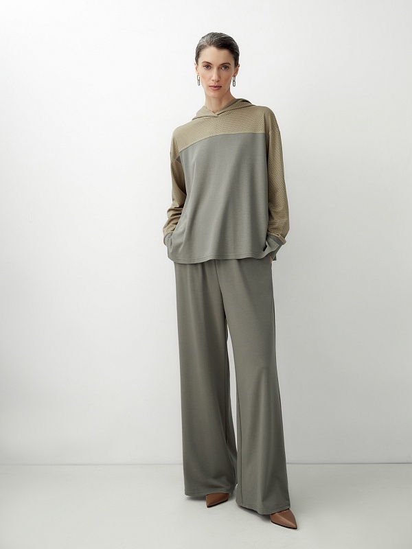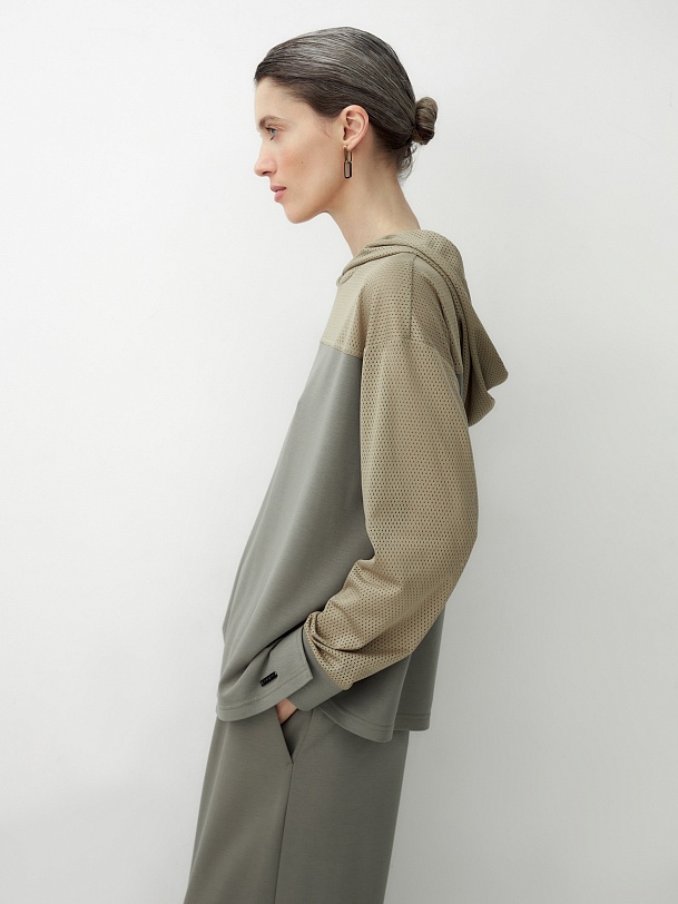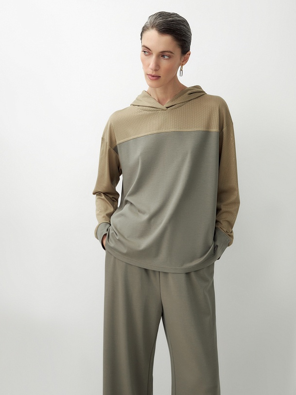 Комбинированная трикотажная толстовка с капюшоном, спущенная линия плеча придает расслабленности образу. Составляет комплект с брюками из одной капсулы и создает кэжуальный расслабленный образ.