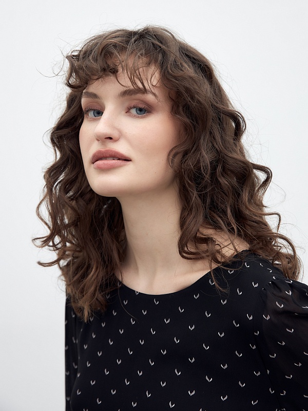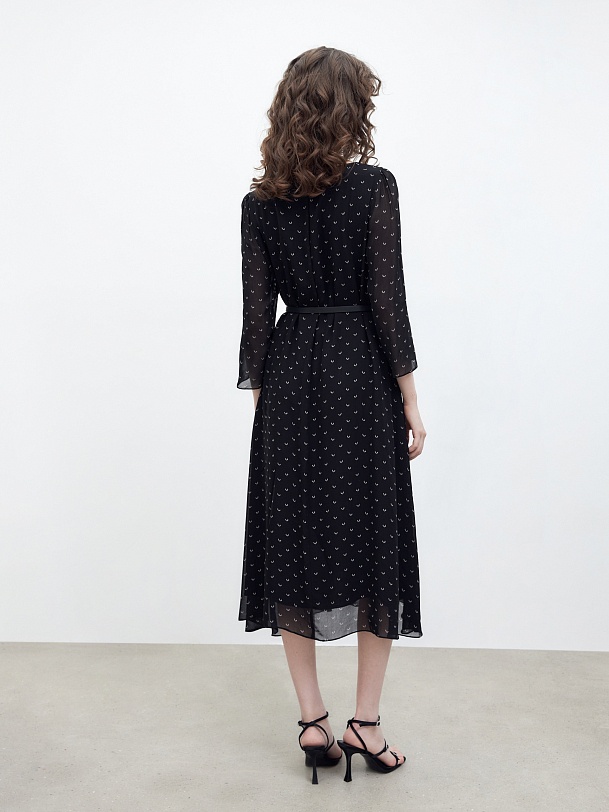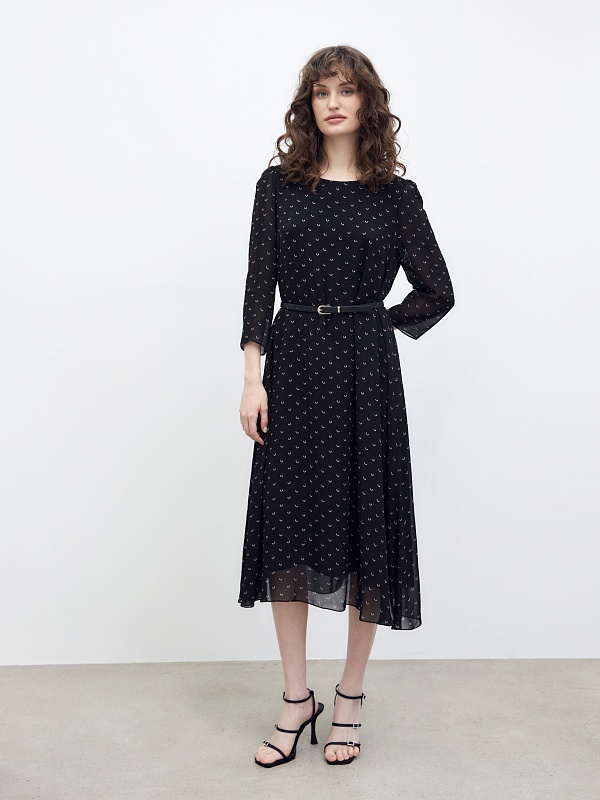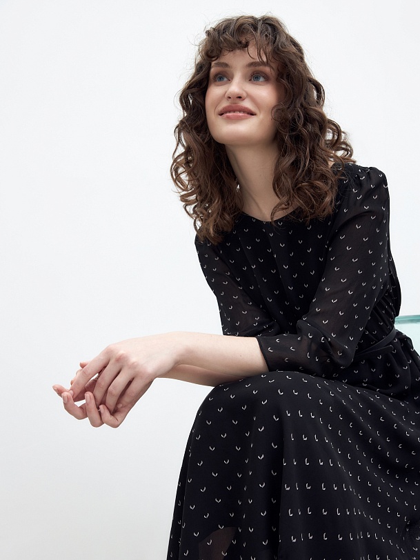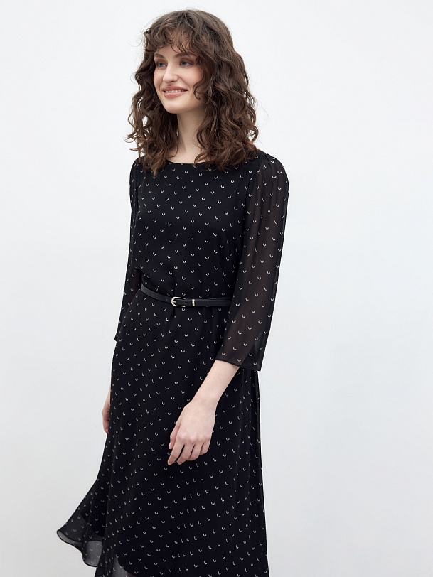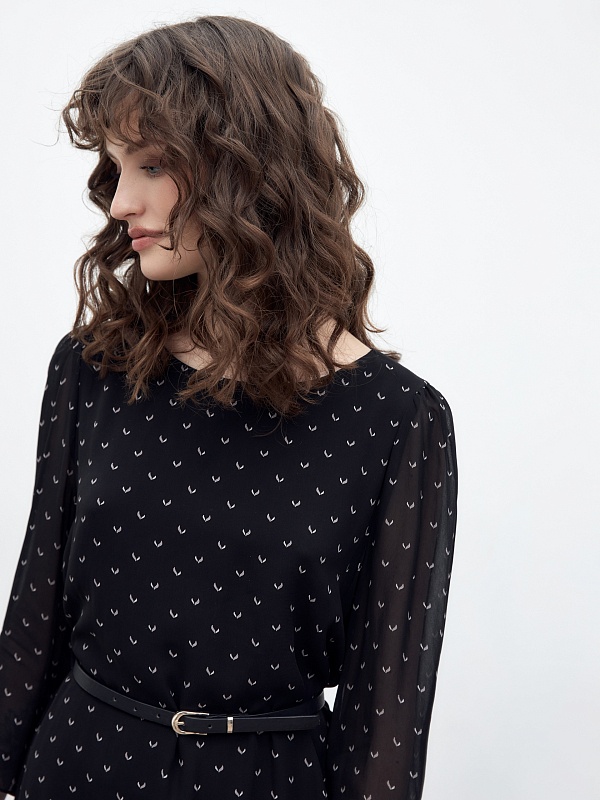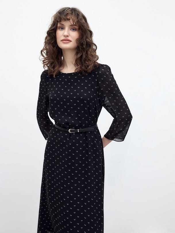 Женственное платье из натурального шифона с графичным принтом на вискозной подкладке. Платье A-силуэта с горловиной-лодочкой и втачным рукавом со сборкой. В комплект идет тонкий пояс из черной экокожи.