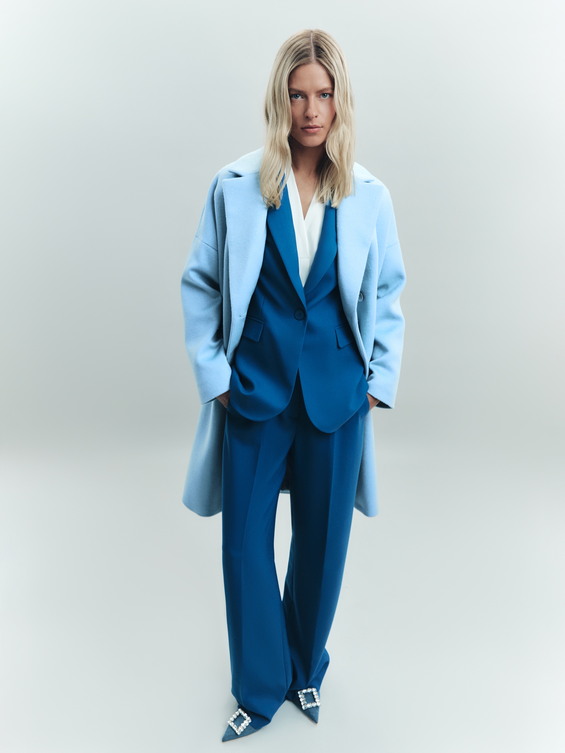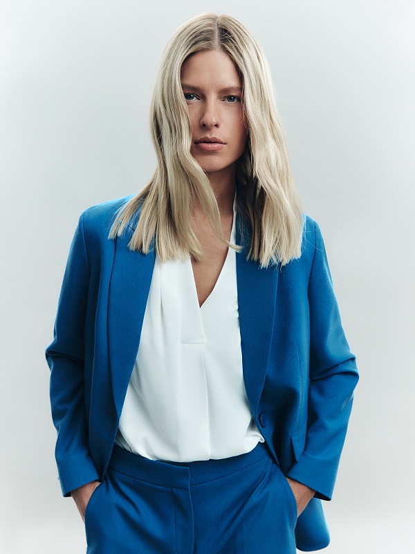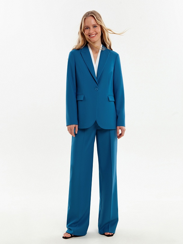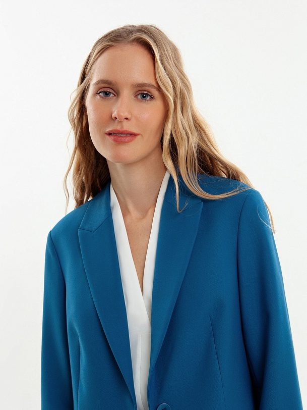 Прямой однобортный удлиненный жакет из костюмной вискозной ткани насыщенного синего цвета на одной пуговице. Воротник с лацканом сшит вместе, спереди прорезной карман и клапан. Рукава полной длины. Жакет на подкладке.
