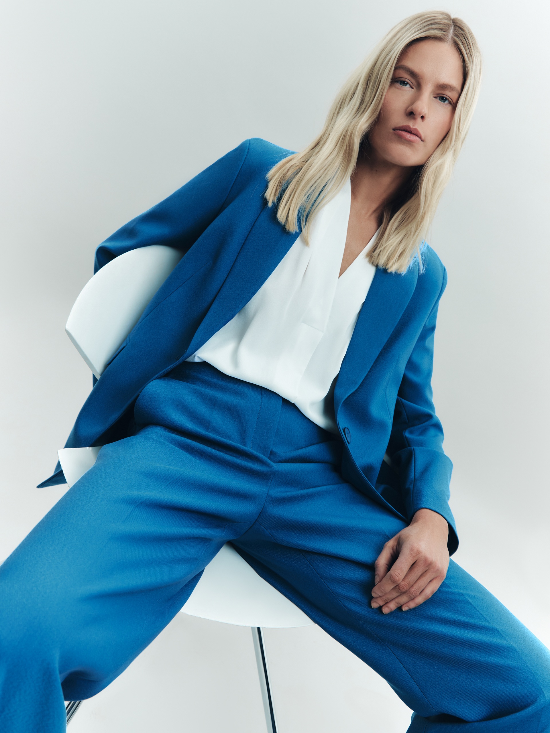 Брюки прямые на высокой посадке немного расклешенные к низу, на притачном поясе со стрелками из костюмной вискозной ткани насыщенного синего цвета. Спереди рабочие боковые карманы.