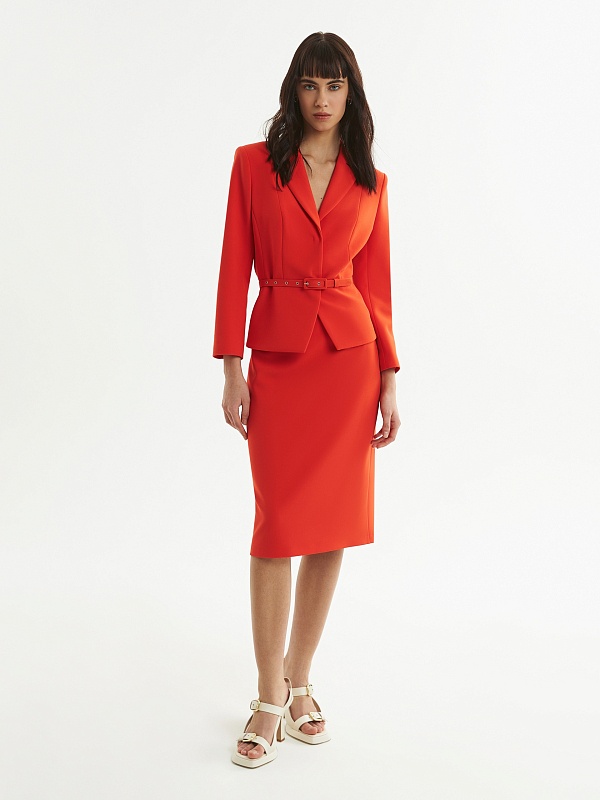 Яркий укороченный жакет с баской и поясом