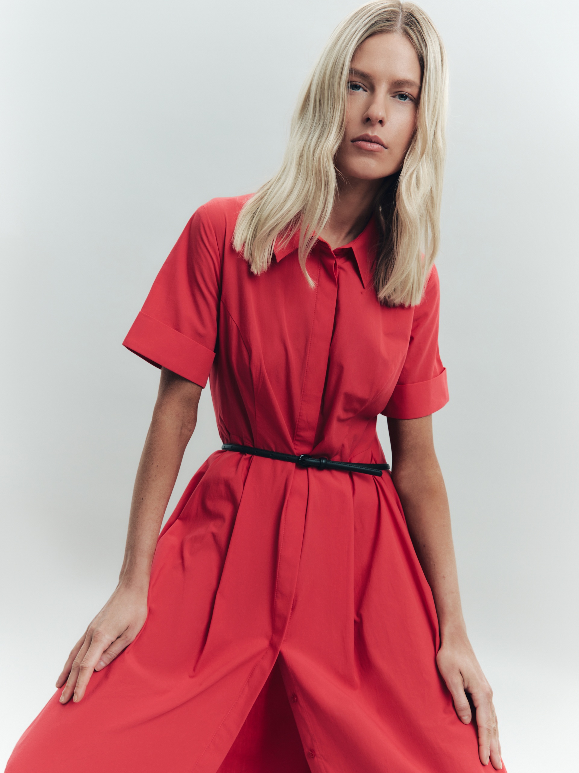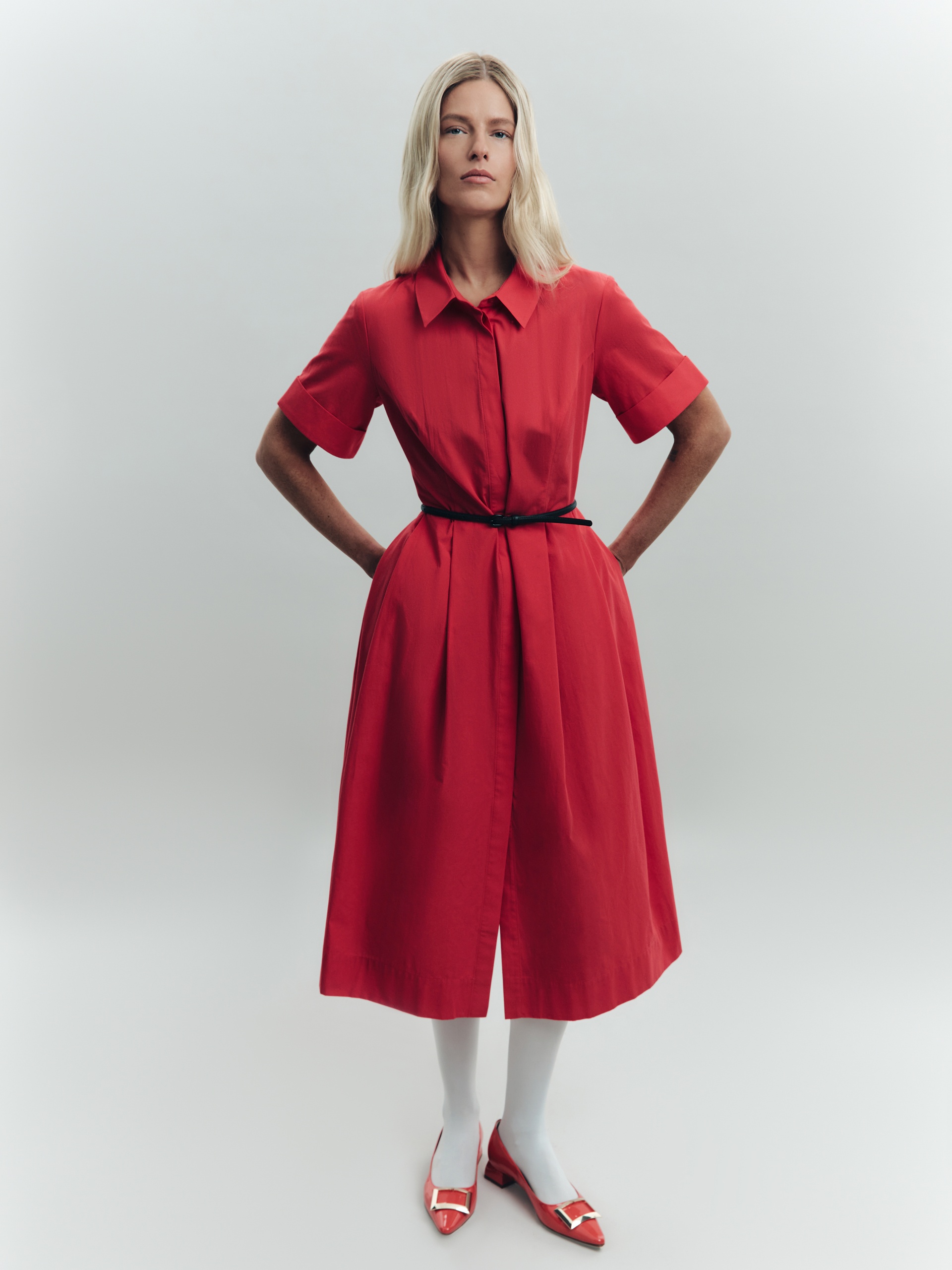 Платье-рубашка отрезное по талии, с юбкой со складками. Лиф платья с рельефами, классический отложной воротник, супатная застежка. Рукав до локтя с отворотом. Платье выполнено их хлопковой ткани в ярком красном цвете. В комплект входит пояс из основной ткани.