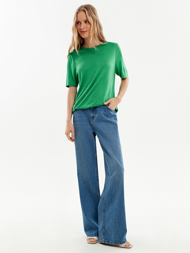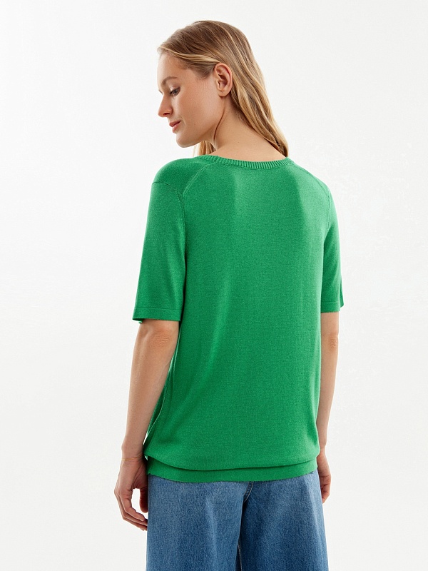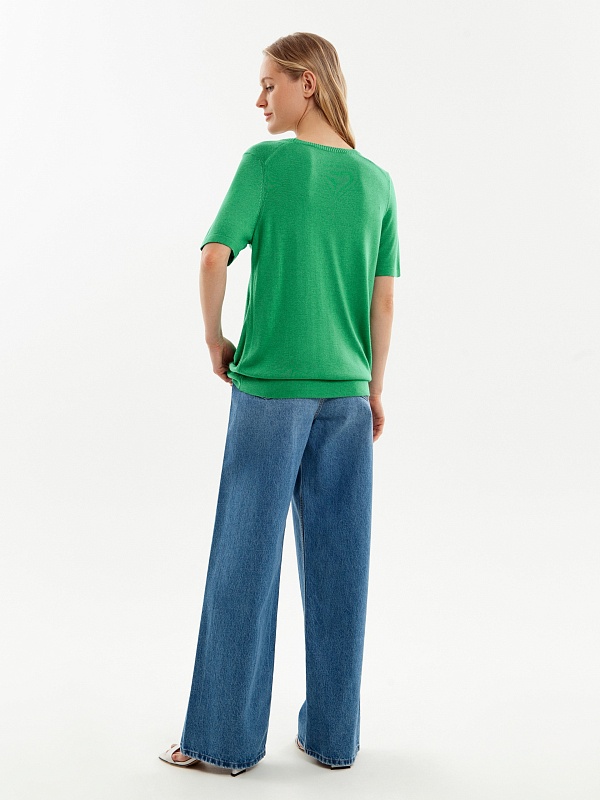 Джемпер с коротким рукавом сочетает в себе свободу прямой футболки и актуальный зеленый оттенок. Гладкая к коже вискозная нить холодит, не электризуется и обладает легким блеском.