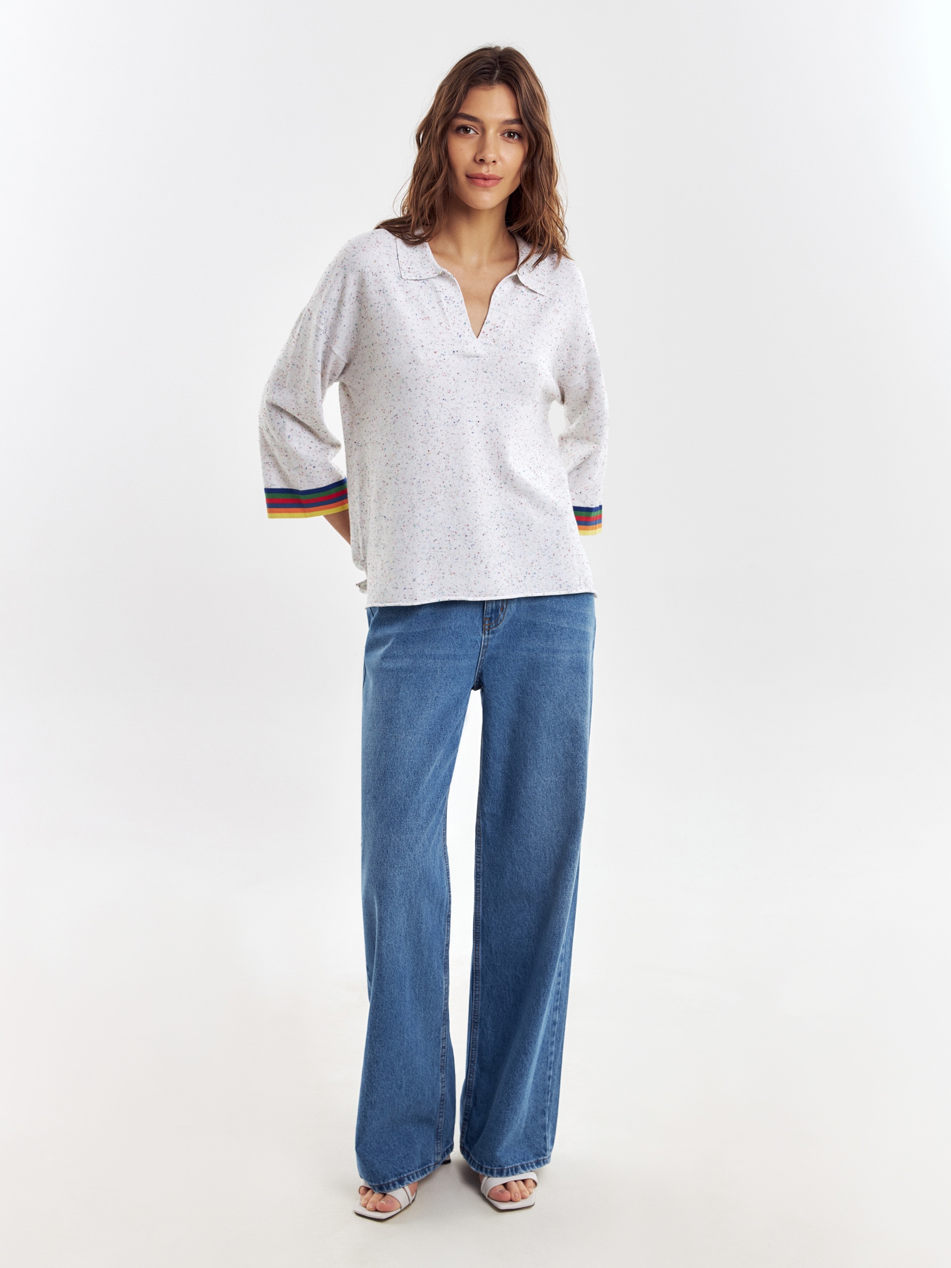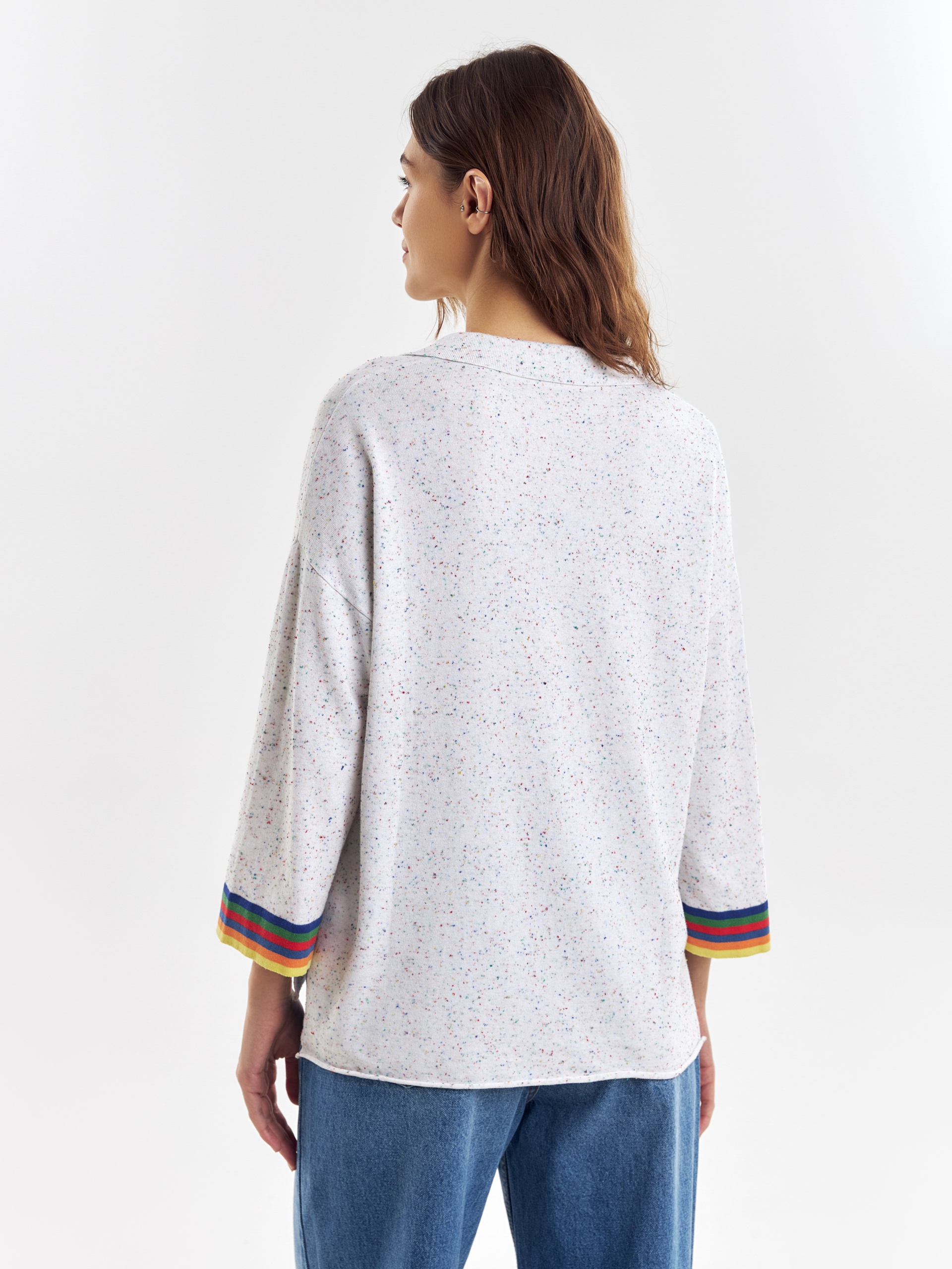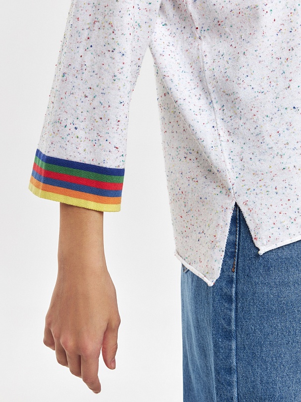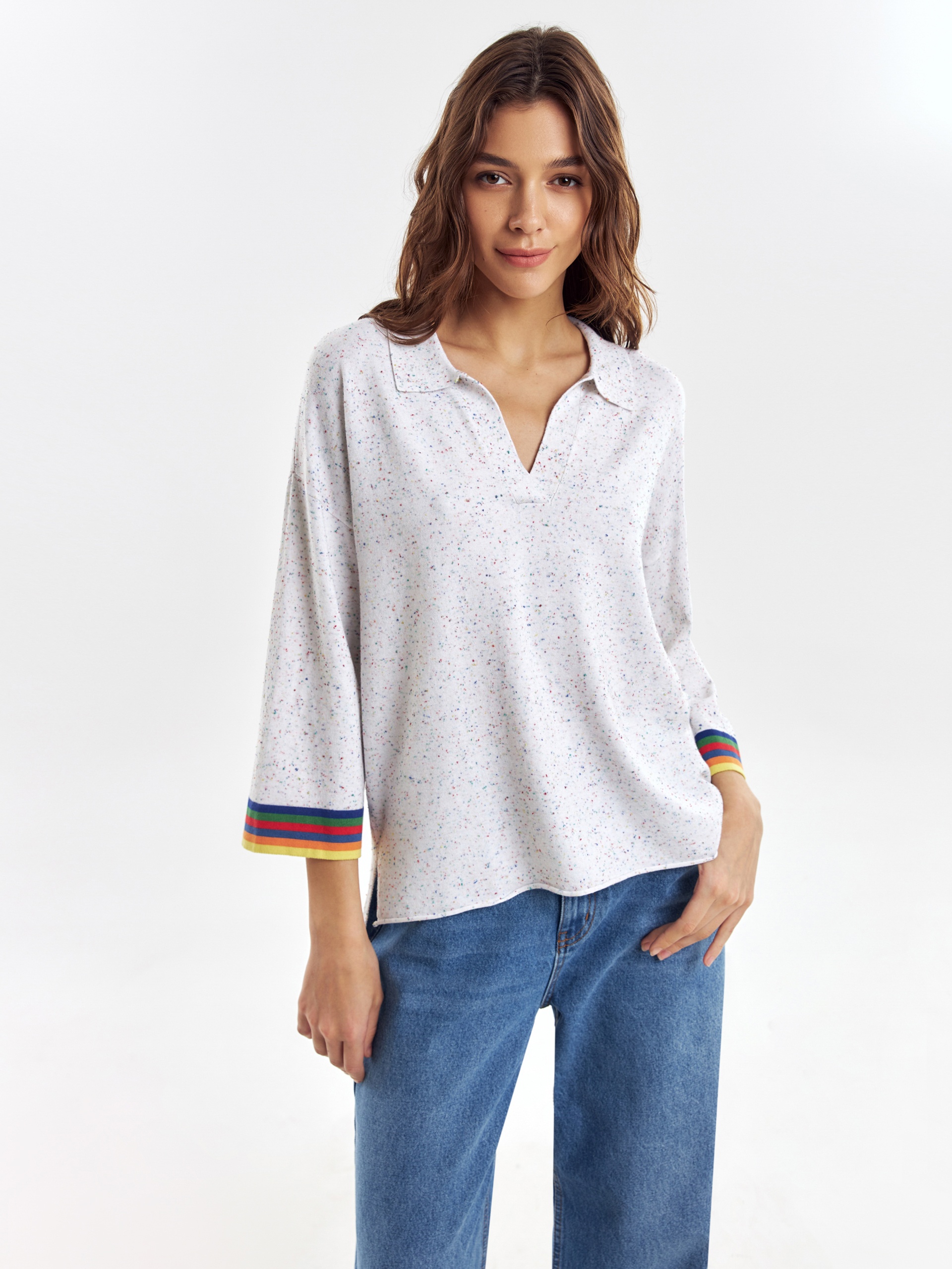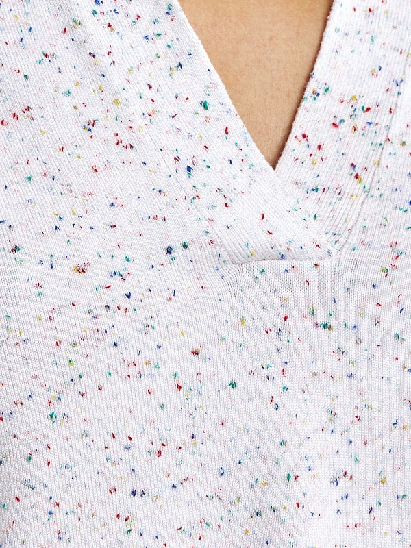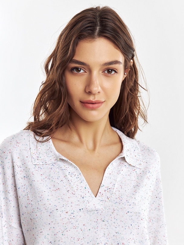 Джемпер свободного силуэта с V-образным вырезом и воротником апаш придаст вашему образу дух свободы, разрезы по бокам изделия дополнительно подчеркнут это. Вискозная нить в составе пряжи приятно холодит кожу и имеет легкий блеск. С этим джемпером можно создавать как нейтральные, так и яркие образы.