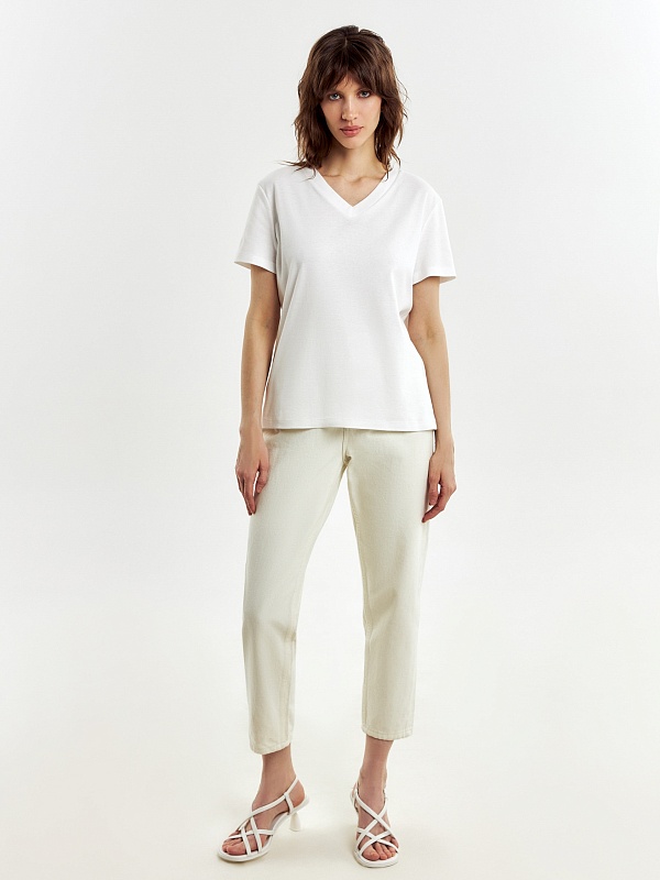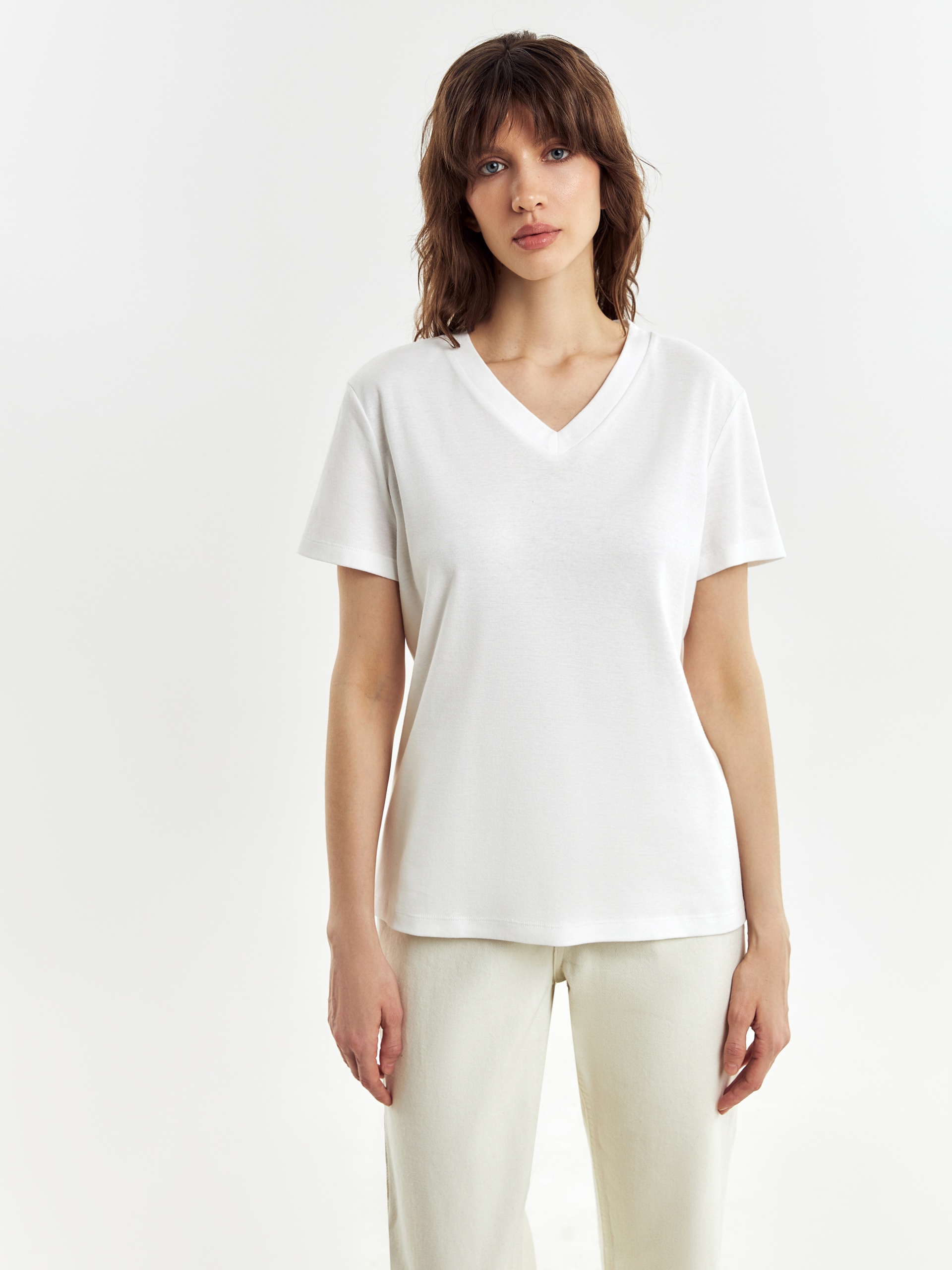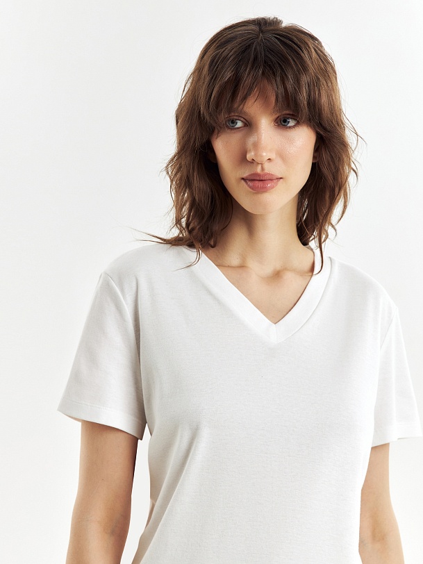Базовая футболка из высококачественного 100% мерсеризированного хлопка с V-Образным вырезом. Мерсеризированный хлопок имеет шелковистый блеск и не деформируется после стирок, практически не мнется и не выцветает со временем.