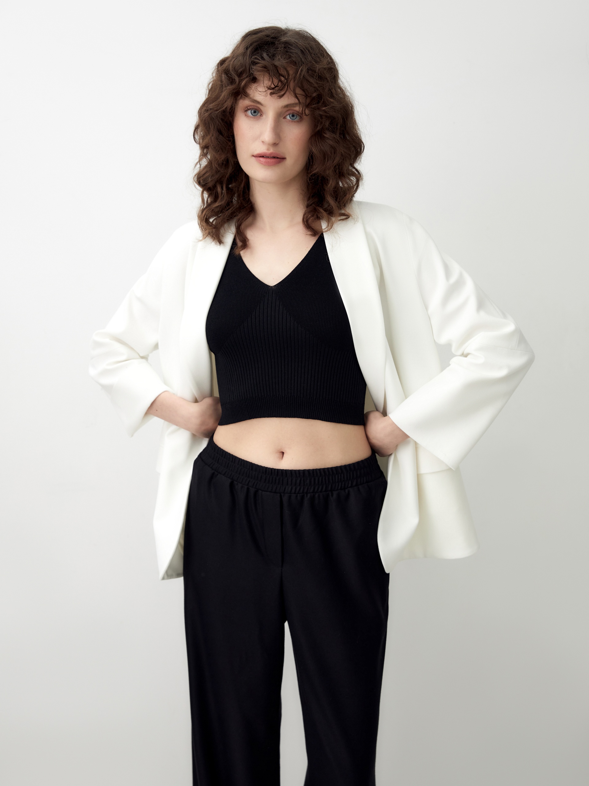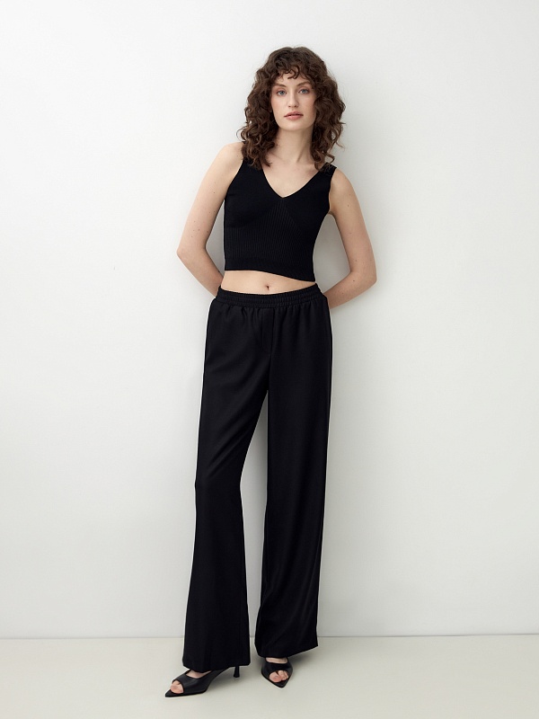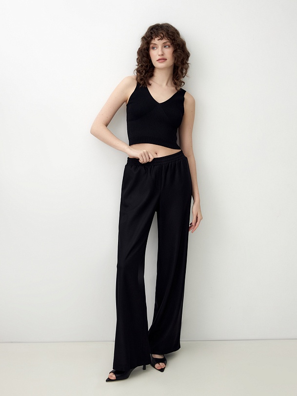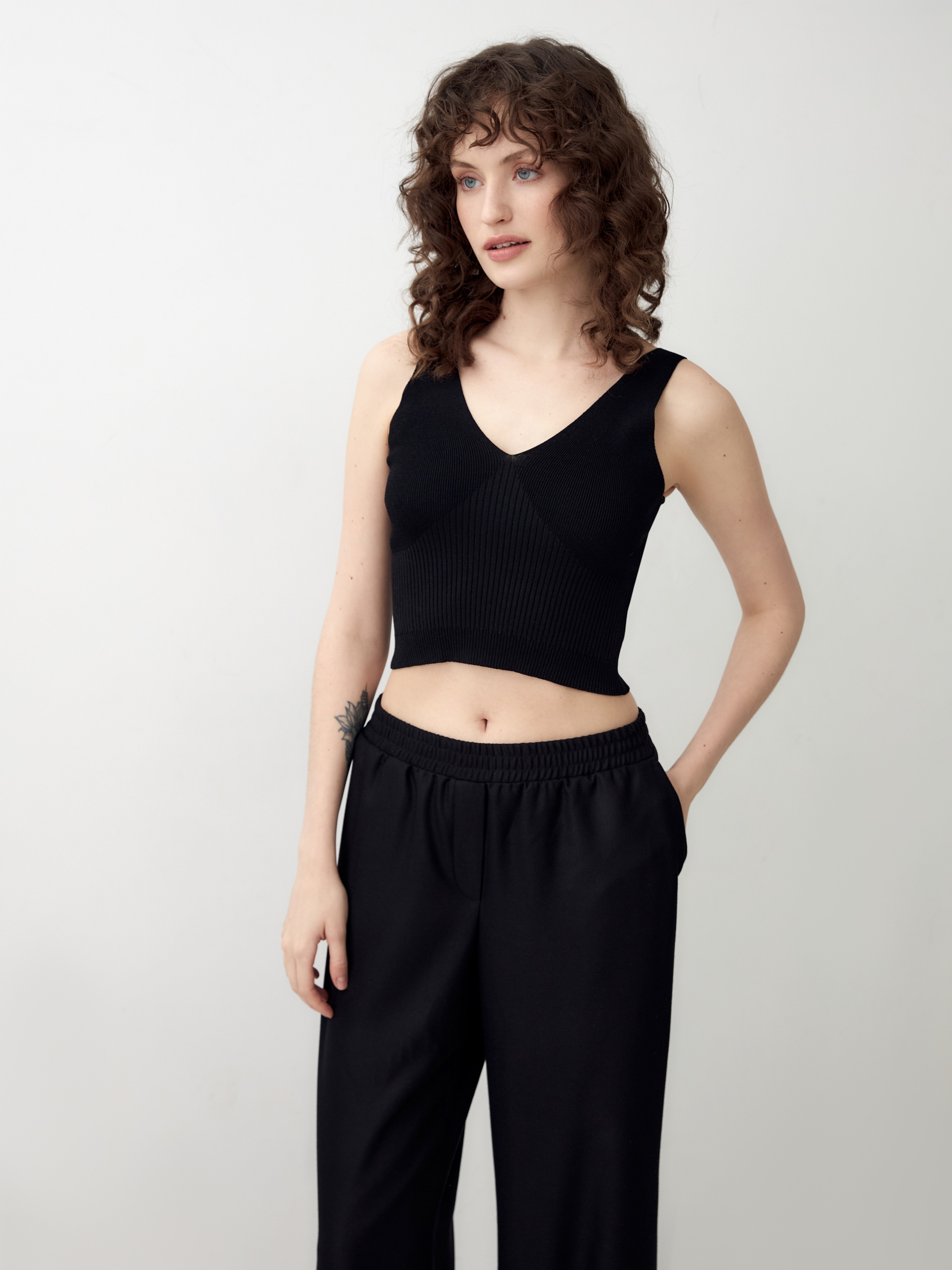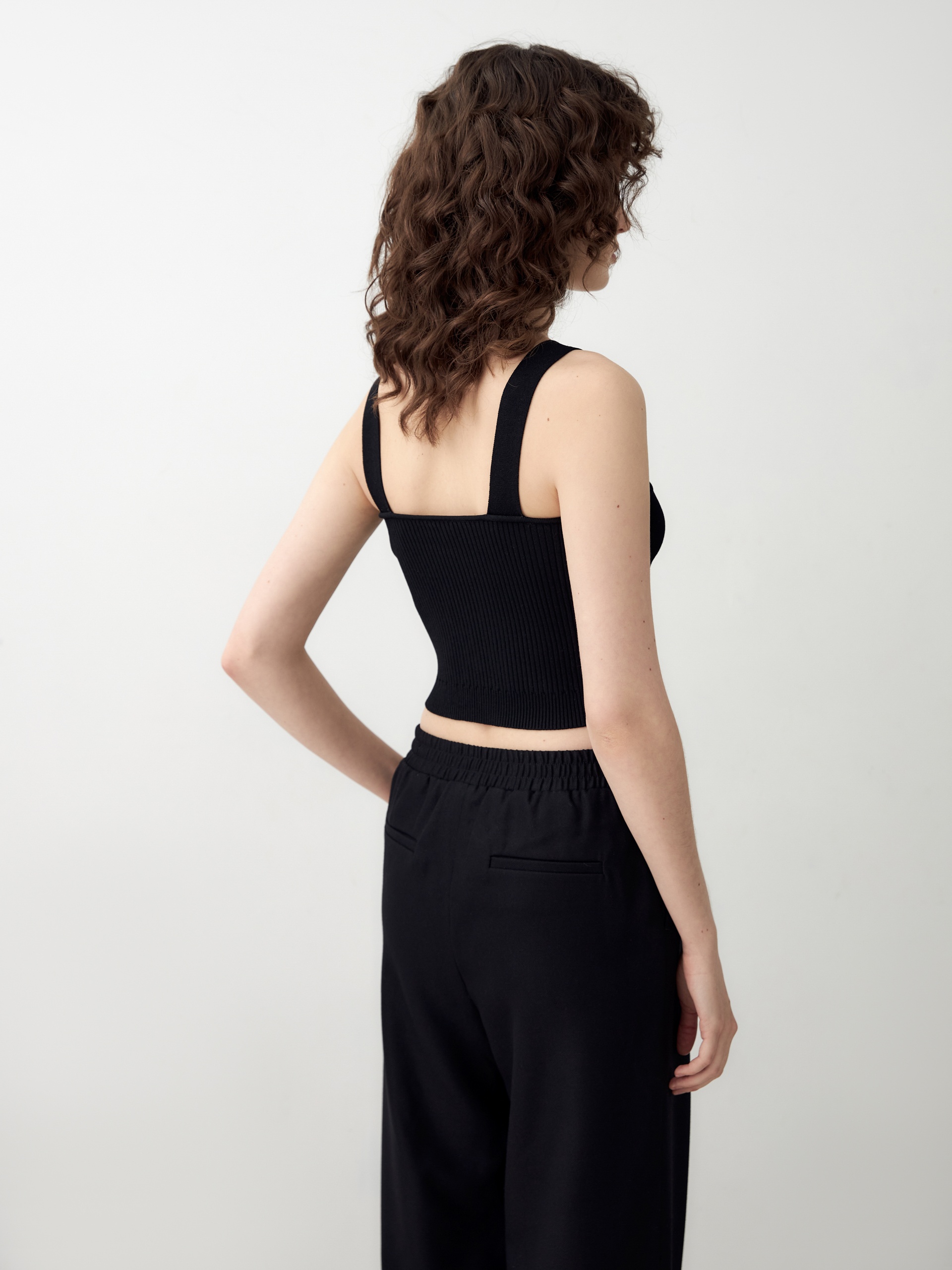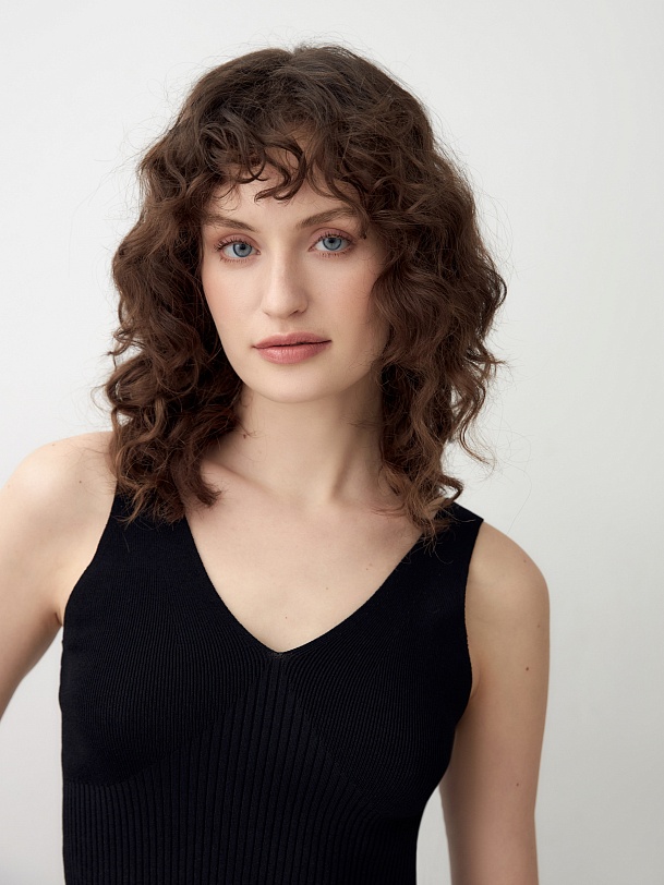 Трендовый вязаный кроп-топ на бретелях. Широкие бретели и глубокий V-образный вырез позволяют использовать эту модель как в повседневных, так и в вечерних образах.