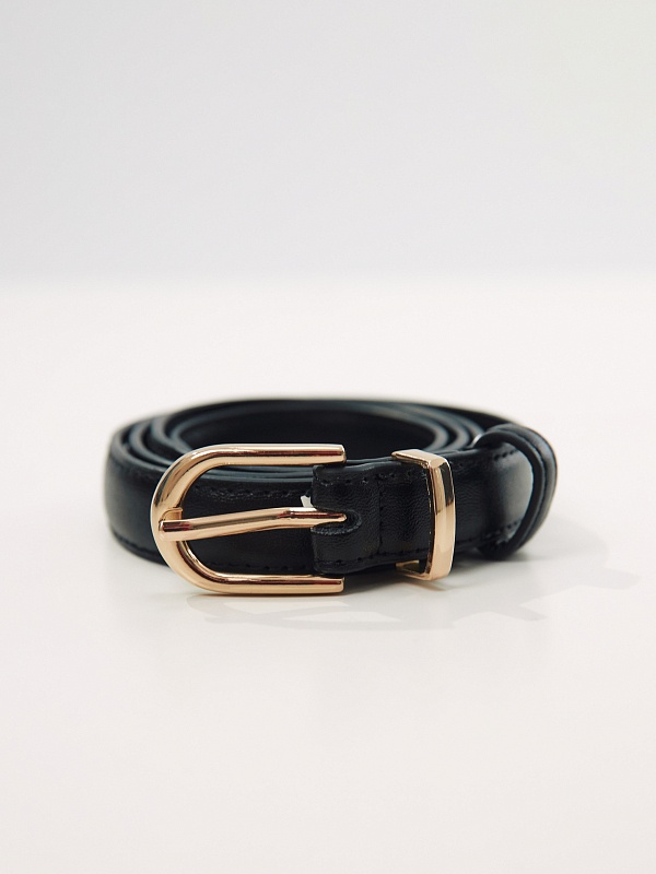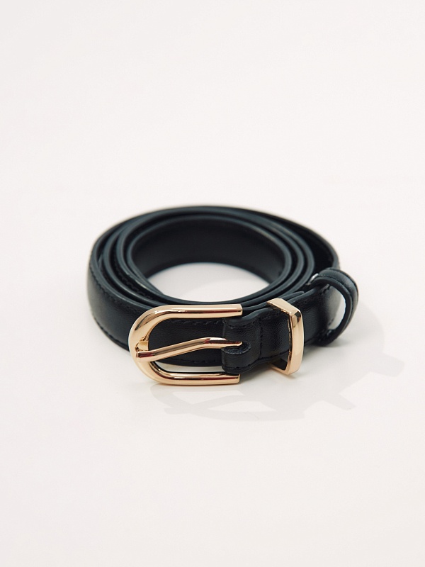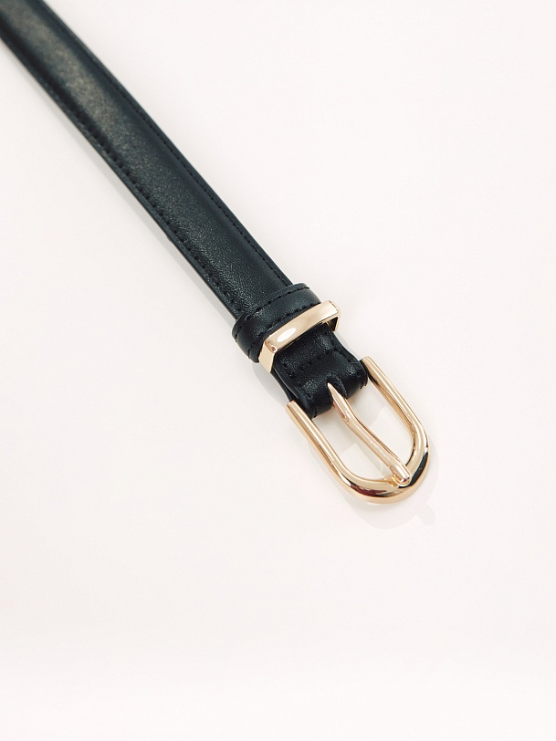 Универсальный ремень из гладкой натуральной кожи в классическом черном цвете. Края ремня прострочены, что делает его более долговечным. Ремень застегивается на минималистичную металлическую пряжку с золотым отблеском и металлическую шлевку. Ремень представлен в трех размерах: S длиной 100 см, M длиной 110 см и L длиной 120 см. Ширина 2 см.