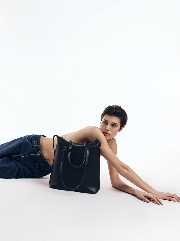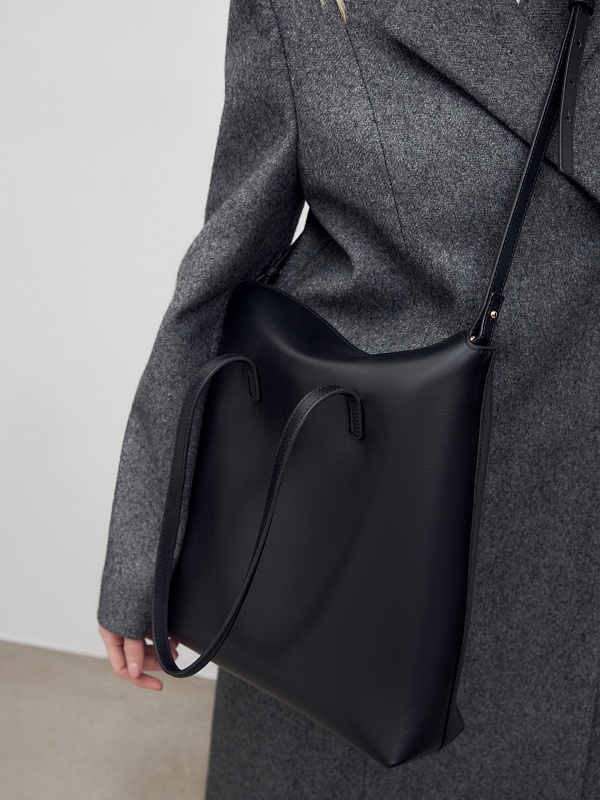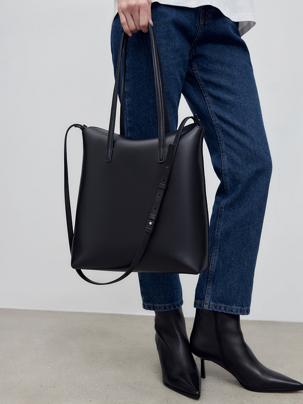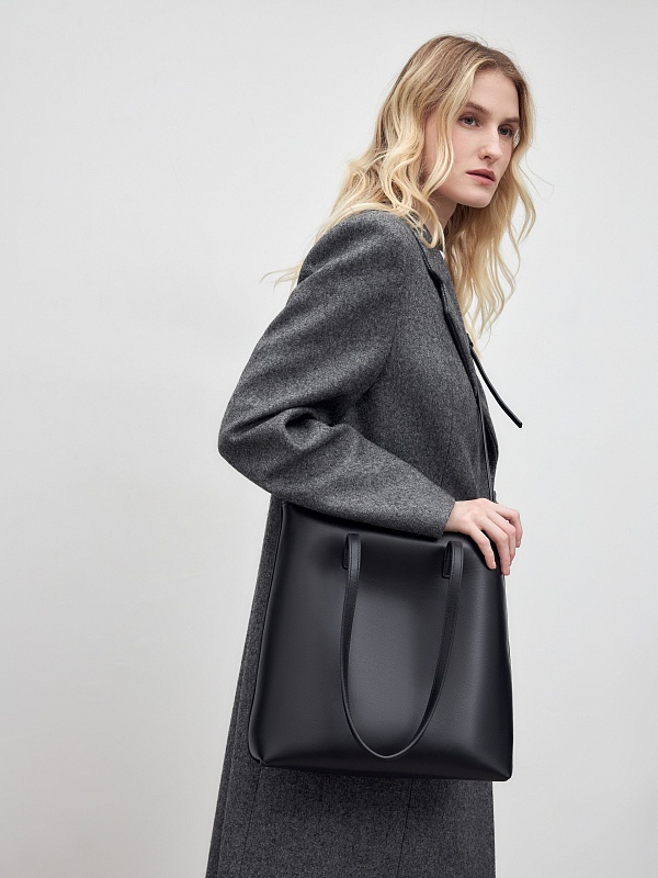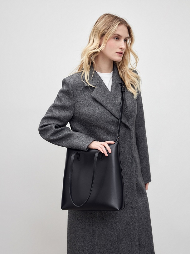 Объемная и вместительная сумка-тоут в классическом черном цвете. Сделана из качественной и плотной натуральной кожи. Внутри одно основное отделение и два боковых кармана для мелочей, один из которых на молнии. Застежка-клапан на потайную магнитную кнопку. Сумка имеет пару коротких ручек, позволяющих носить ее через плечо, и съемный длинный ремешок с регулировкой, что делает сумку идеальным аксессуаром на каждый день.