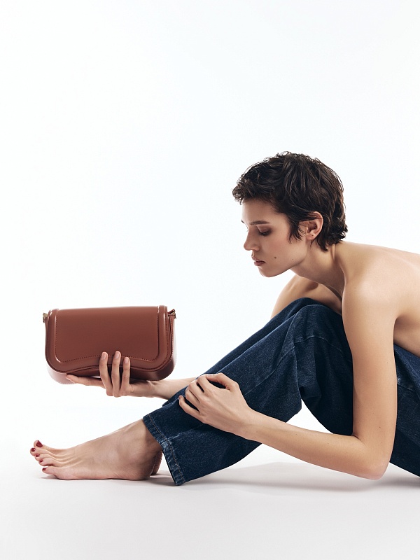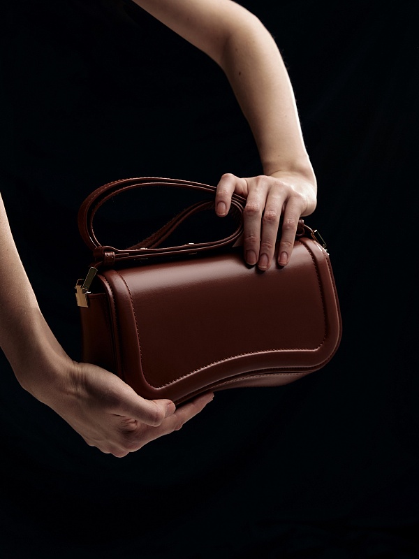 Миниатюрная сумка-багет в трендовом каштановом цвете. Сумка сделана из качественной и плотной натуральной кожи. Благодаря уникальной форме и позолоченной фурнитуре, сумка легко перейдет из делового образа в вечерний. Имеет одно основное отделение и клапан с магнитной застежкой, а ремешок ручки регулируется при помощи кнопок.