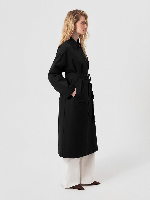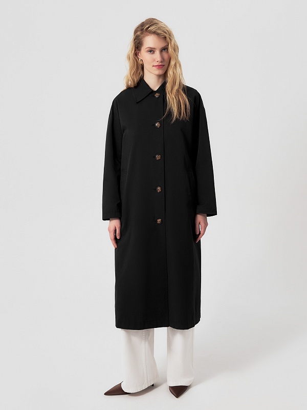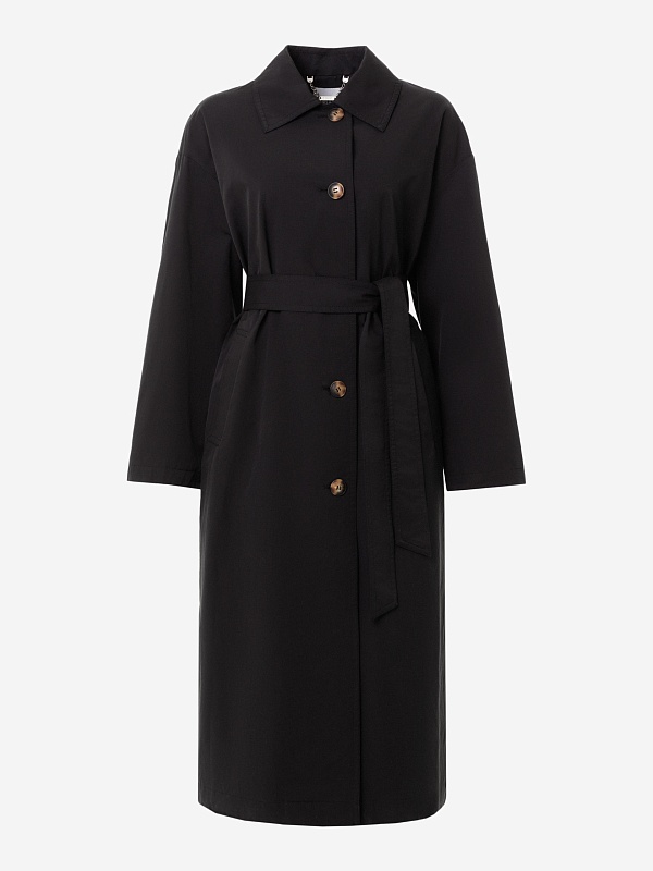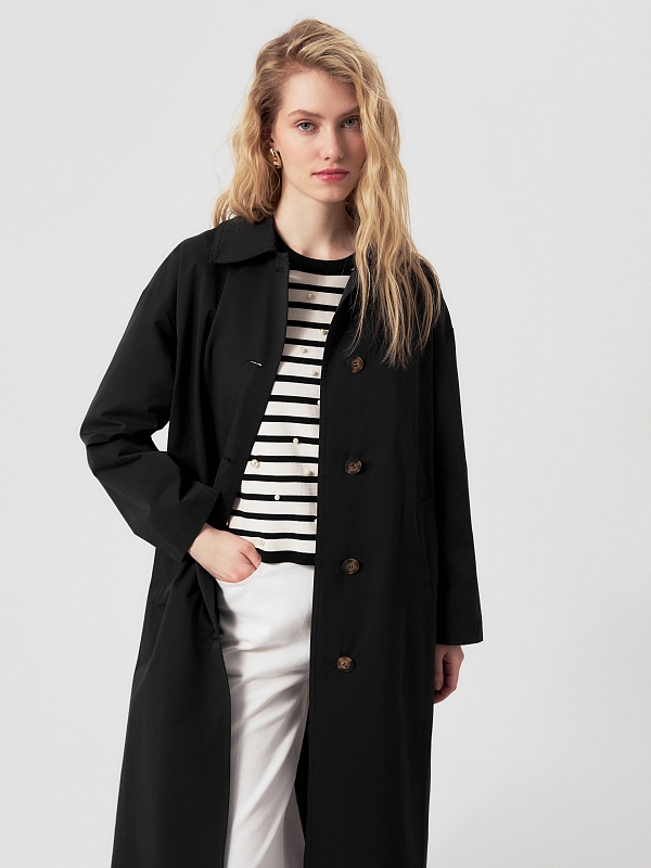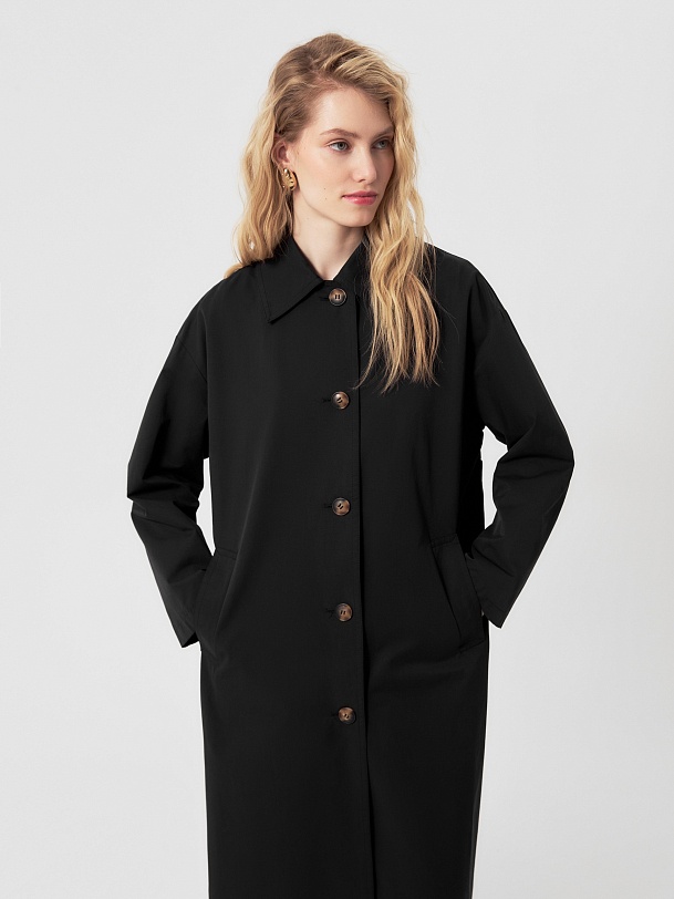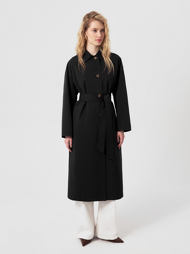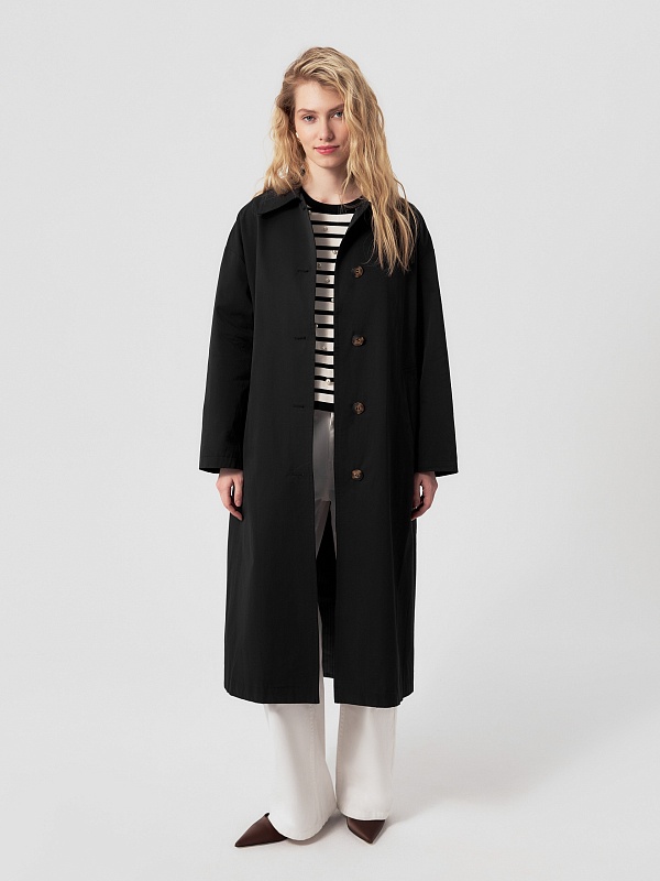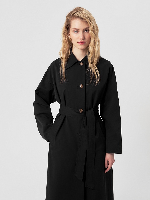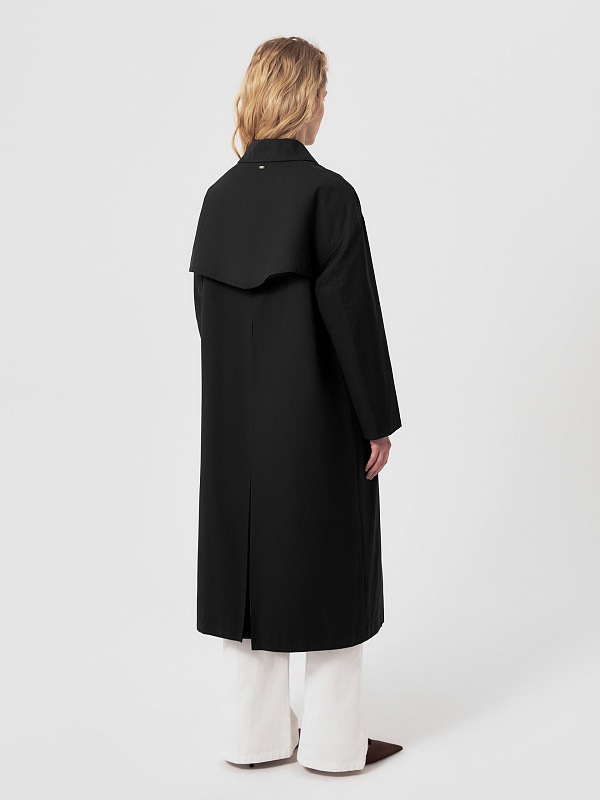 Однобортный плащ прямого силуэта в классическом черном цвете из плотной плащевой ткани с содержанием хлопка. Этот новый плащ отлично сочетает в себе современные детали и удобство. Он имеет свободный рубашечный рукав, аккуратный стояче-отложной воротник и застежку на ряд некрупных роговых пуговиц. На спинке плаща имеется широкая отлетная кокетка и глубокая встречная складка с застежкой на пату. По бокам расположены глубокие карманы с листочками. Плащ дополняет пояс из основной ткани. Изделие на подкладке.