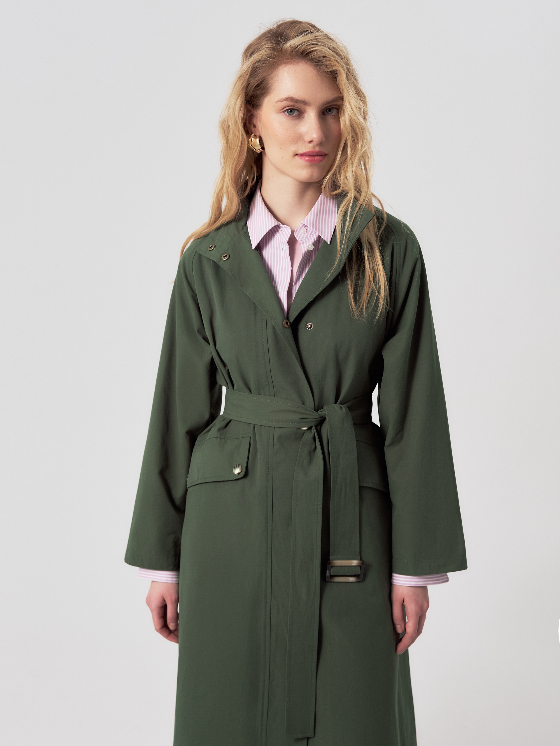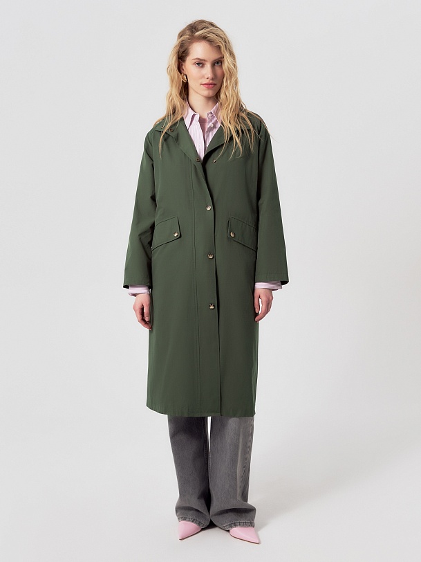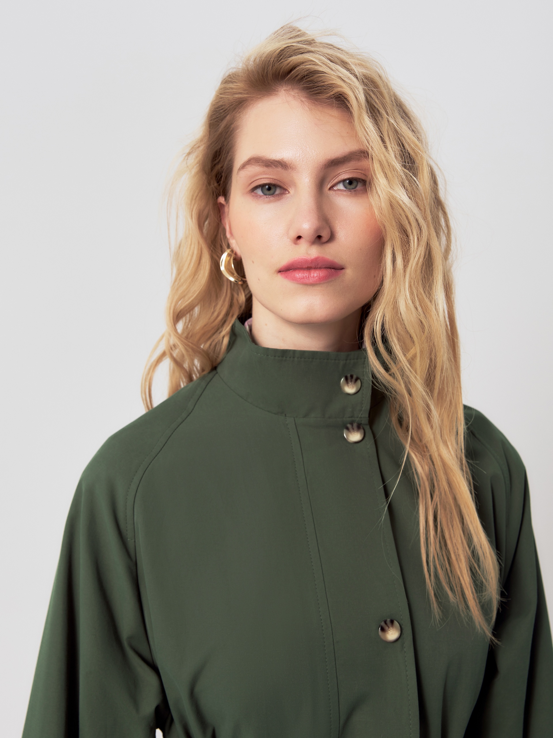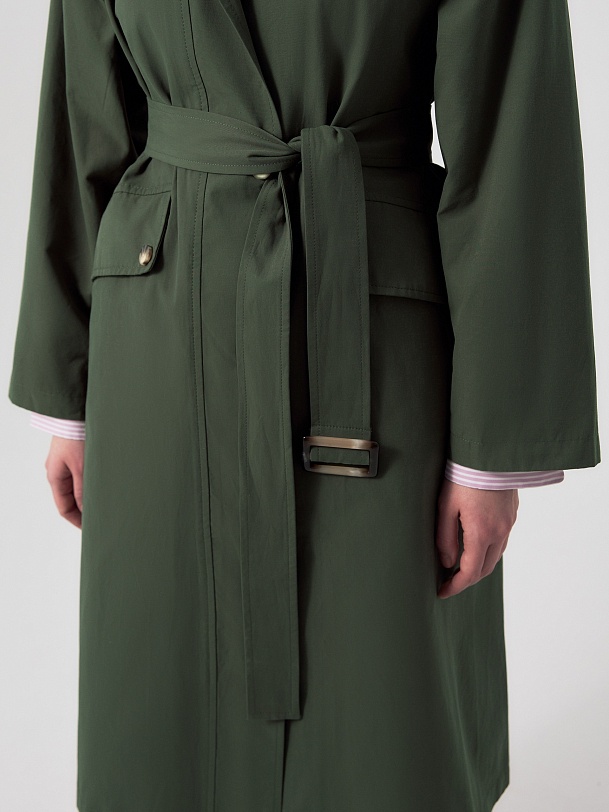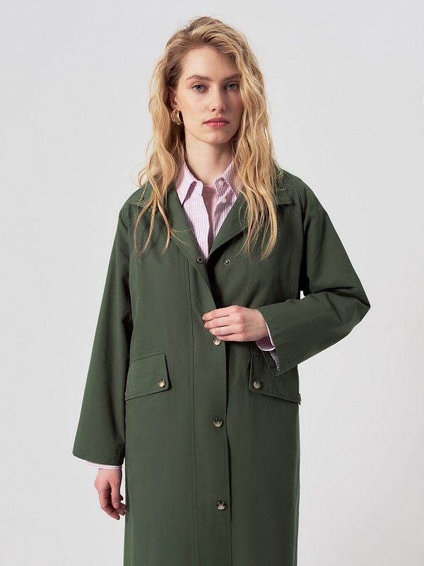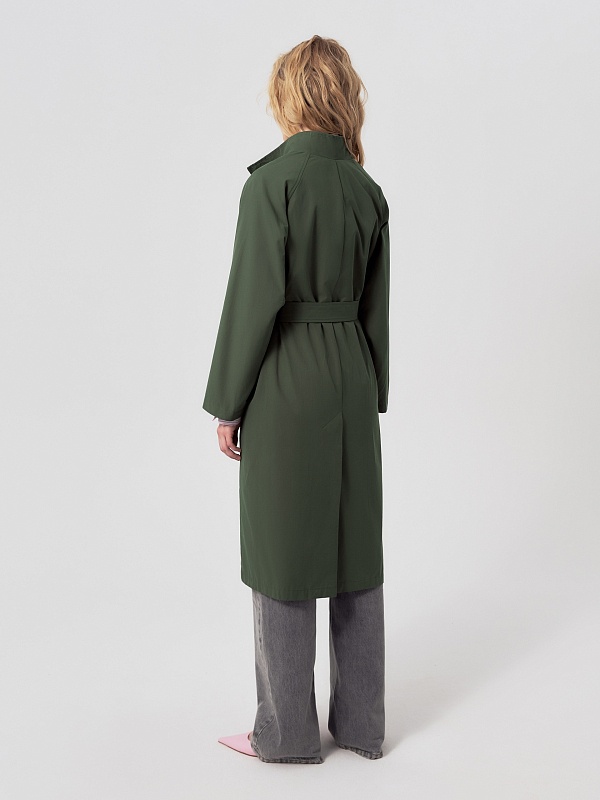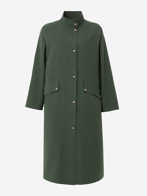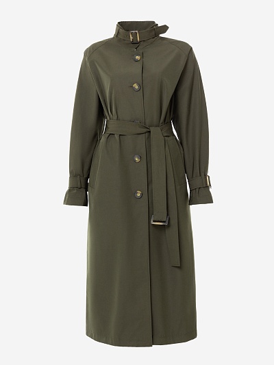 Однобортный закрытый плащ расклешенного силуэта из плотной плащевой ткани в насыщенном зеленом цвете хаки. Плащ имеет комфортный рукав-реглан, высокий воротник-стойку и застежку на ряд установочных кнопок. По бокам расположены глубокие карманы с клапанами. В среднем шве спинки имеется высокая шлица, обеспечивающая свободу шага. Плащ дополняет пояс из основной ткани на стильной роговой пряжке. Длина изделия ниже колена. Плащ на частичной подкладке.