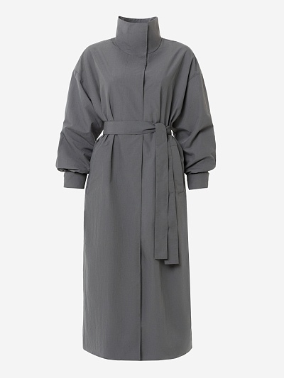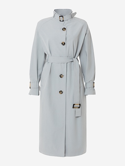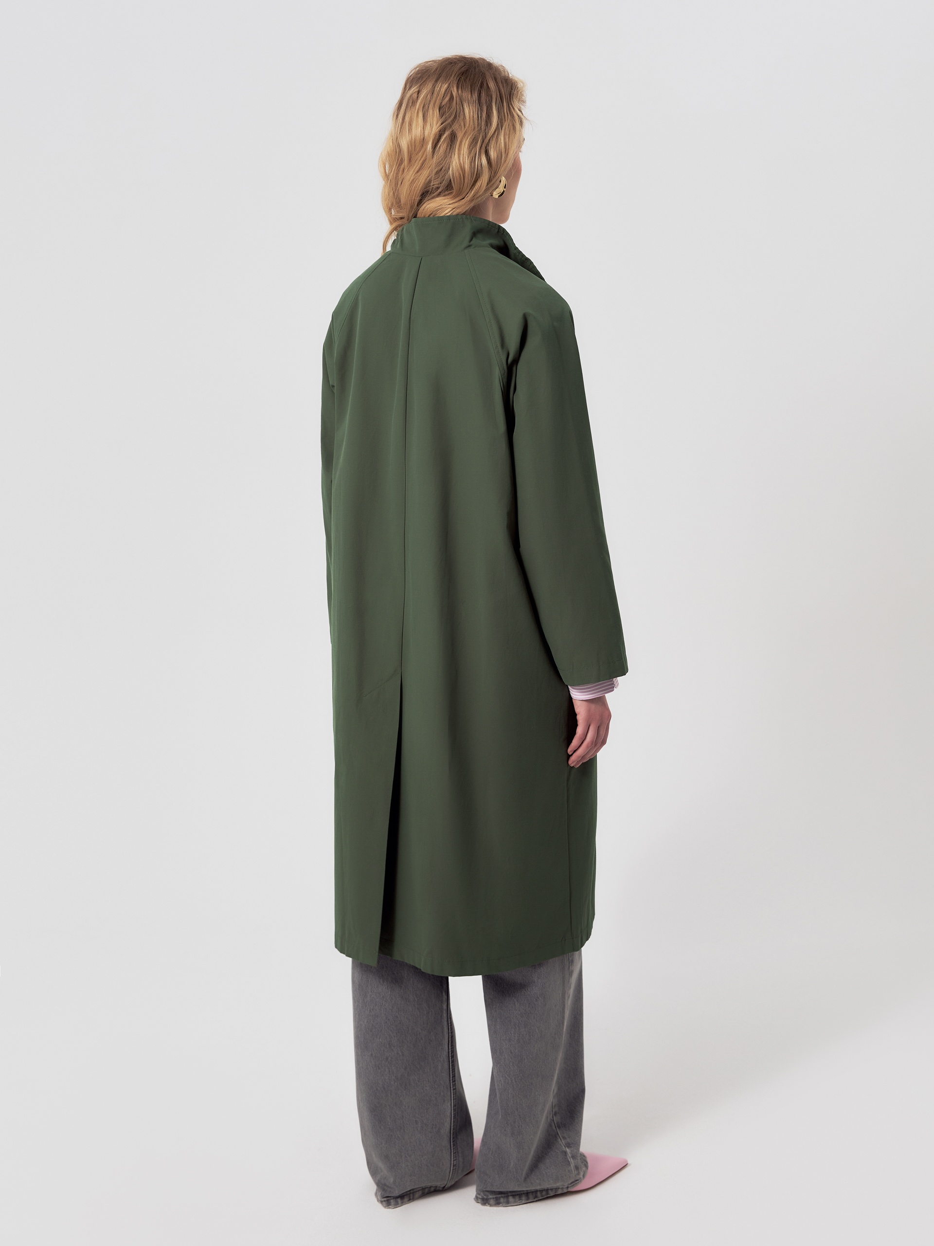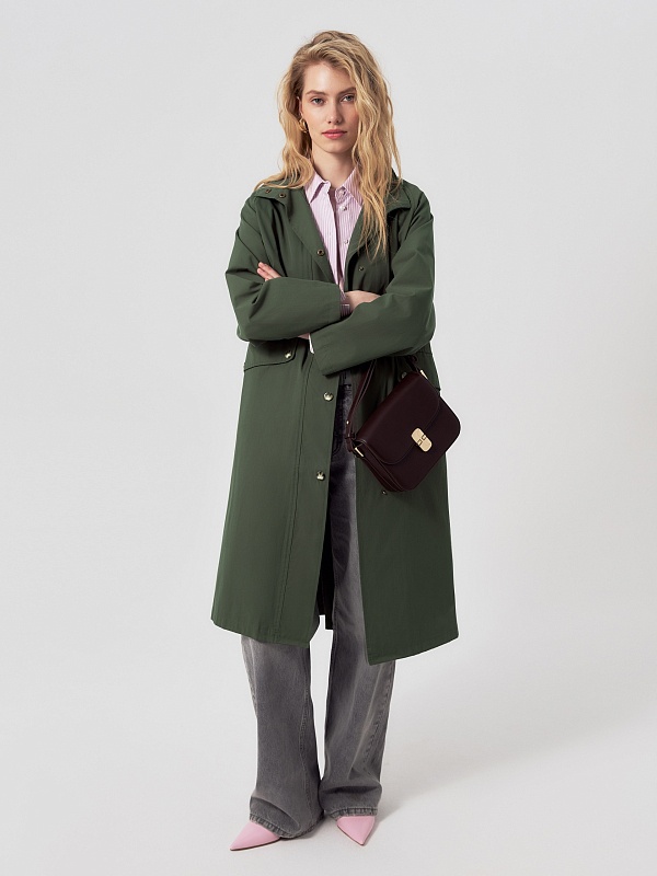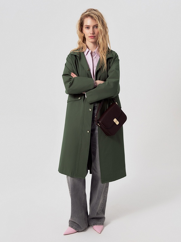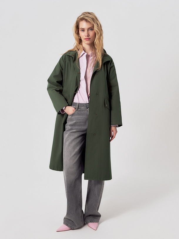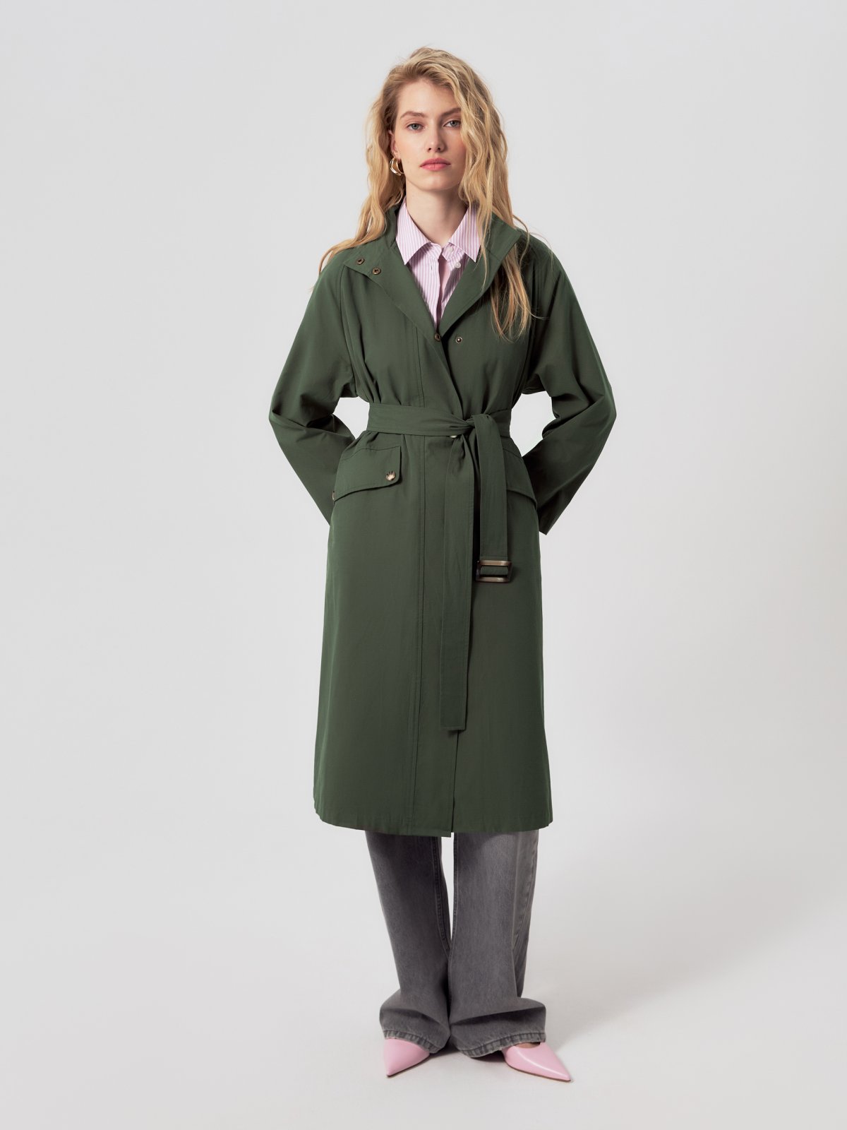 Однобортный закрытый плащ расклешенного силуэта из плотной плащевой ткани в насыщенном зеленом цвете хаки. Плащ имеет комфортный рукав-реглан, высокий воротник-стойку и застежку на ряд установочных кнопок. По бокам расположены глубокие карманы с клапанами. В среднем шве спинки имеется высокая шлица, обеспечивающая свободу шага. Плащ дополняет пояс из основной ткани на стильной роговой пряжке. Длина изделия ниже колена. Плащ на частичной подкладке.