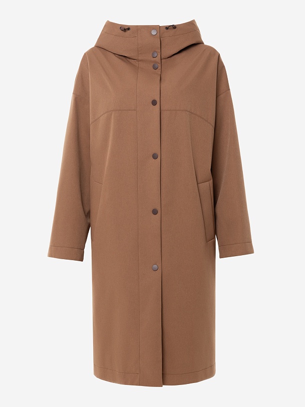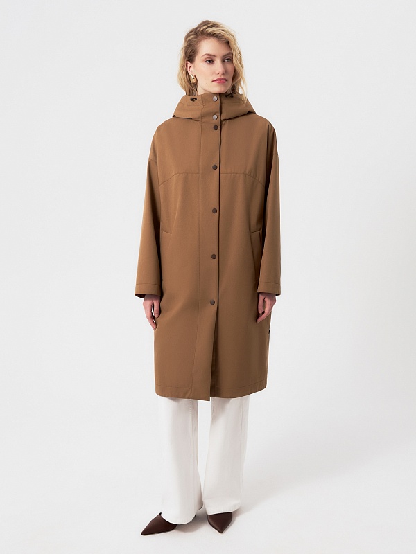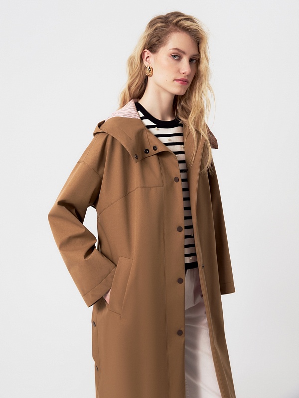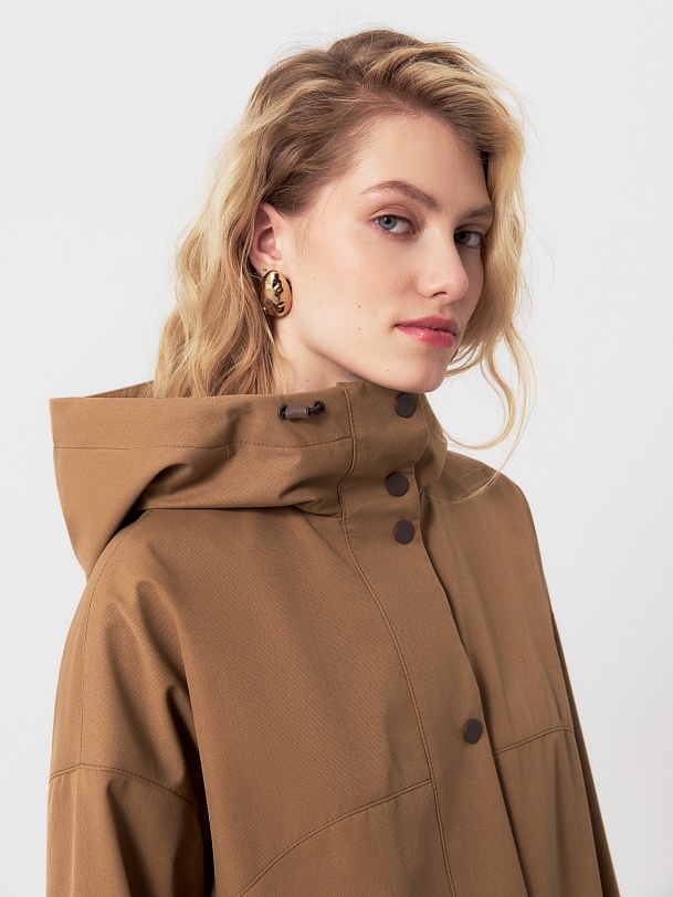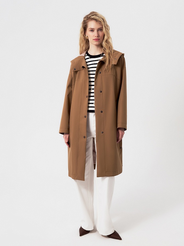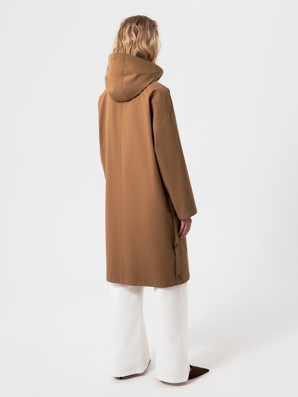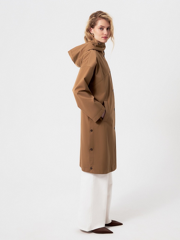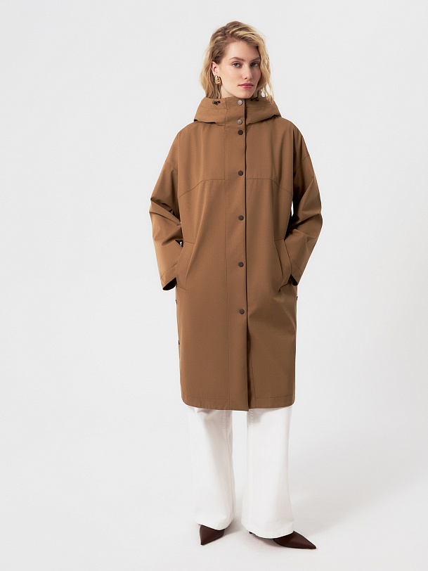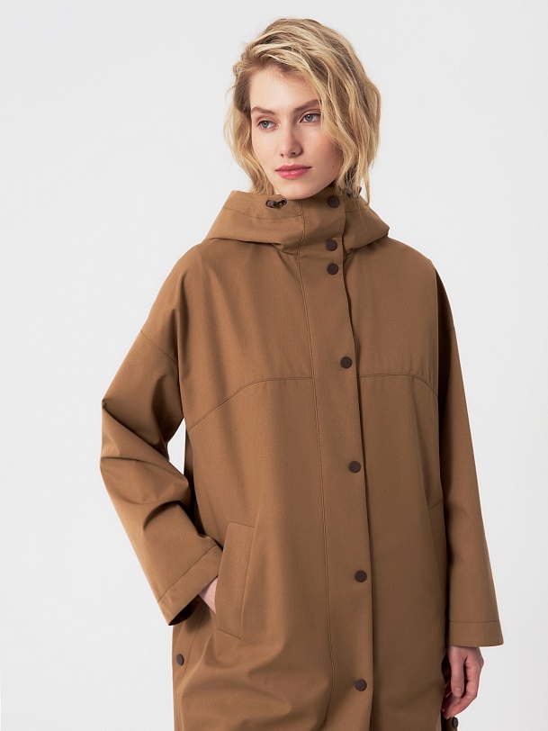 Плащ прямого силуэта из премиальной плащевой ткани в трендовом карамельном цвете. Этот плащ станет незаменимой вещью в Вашем гардеробе, ведь в нем есть все то, что необходимо для комфортной весны. Горловину плаща обрамляет глубокий капюшон с регулировкой объема. Плащ имеет свободный рубашечный рукав и длину до колена. Спереди располагается кокетка, создающая интересную форму. По бокам находятся два разреза на кнопках, которые, при желании, увеличат ширину шага. Плащ застегивается на ряд надежных установочных кнопок, имеет два функциональных кармана. Выполнен с использованием высокотехнологичной плащевой ткани с мембранным покрытием, которая надежно защитит от ветра. Произведено в Санкт-Петербурге.