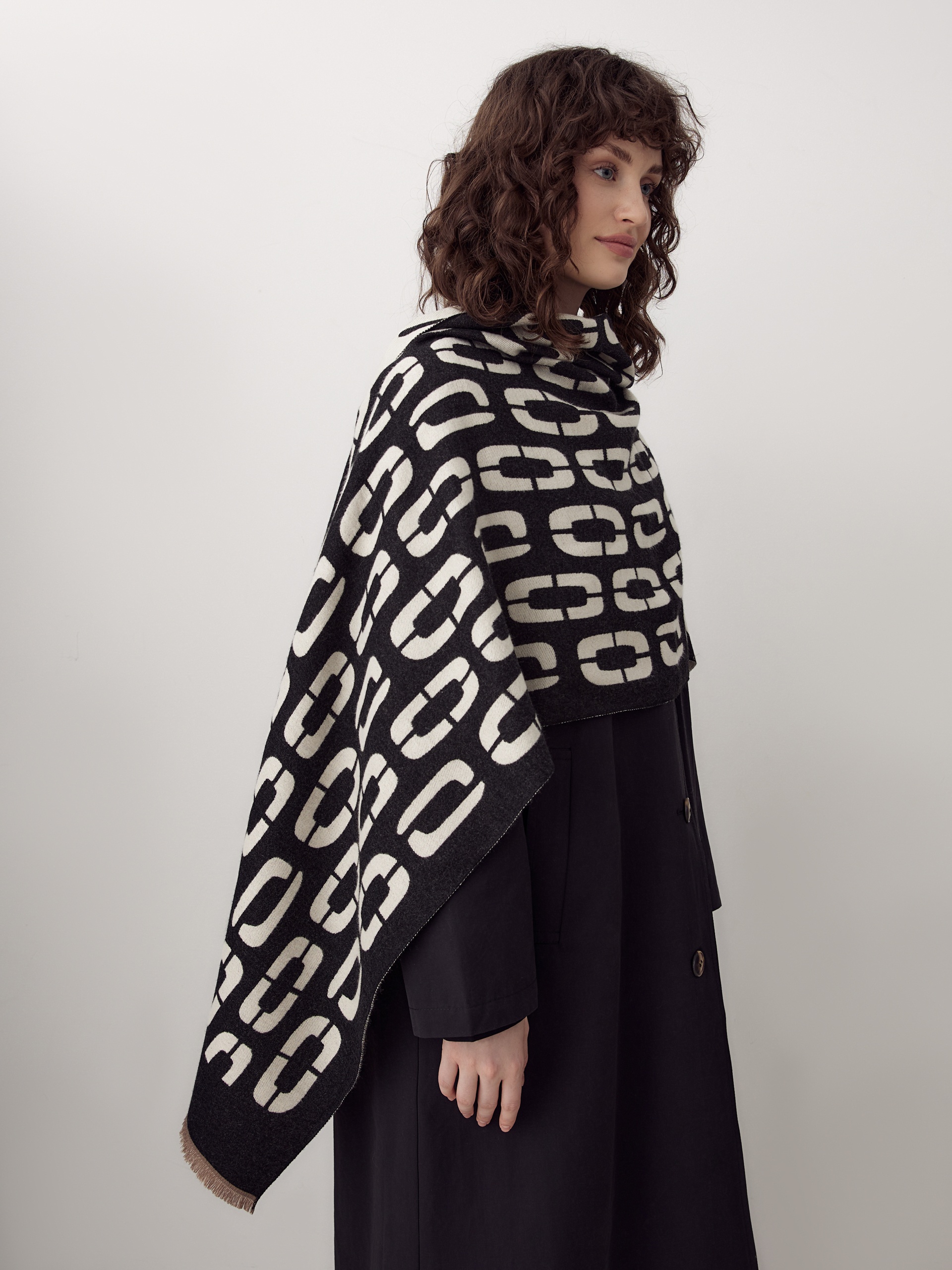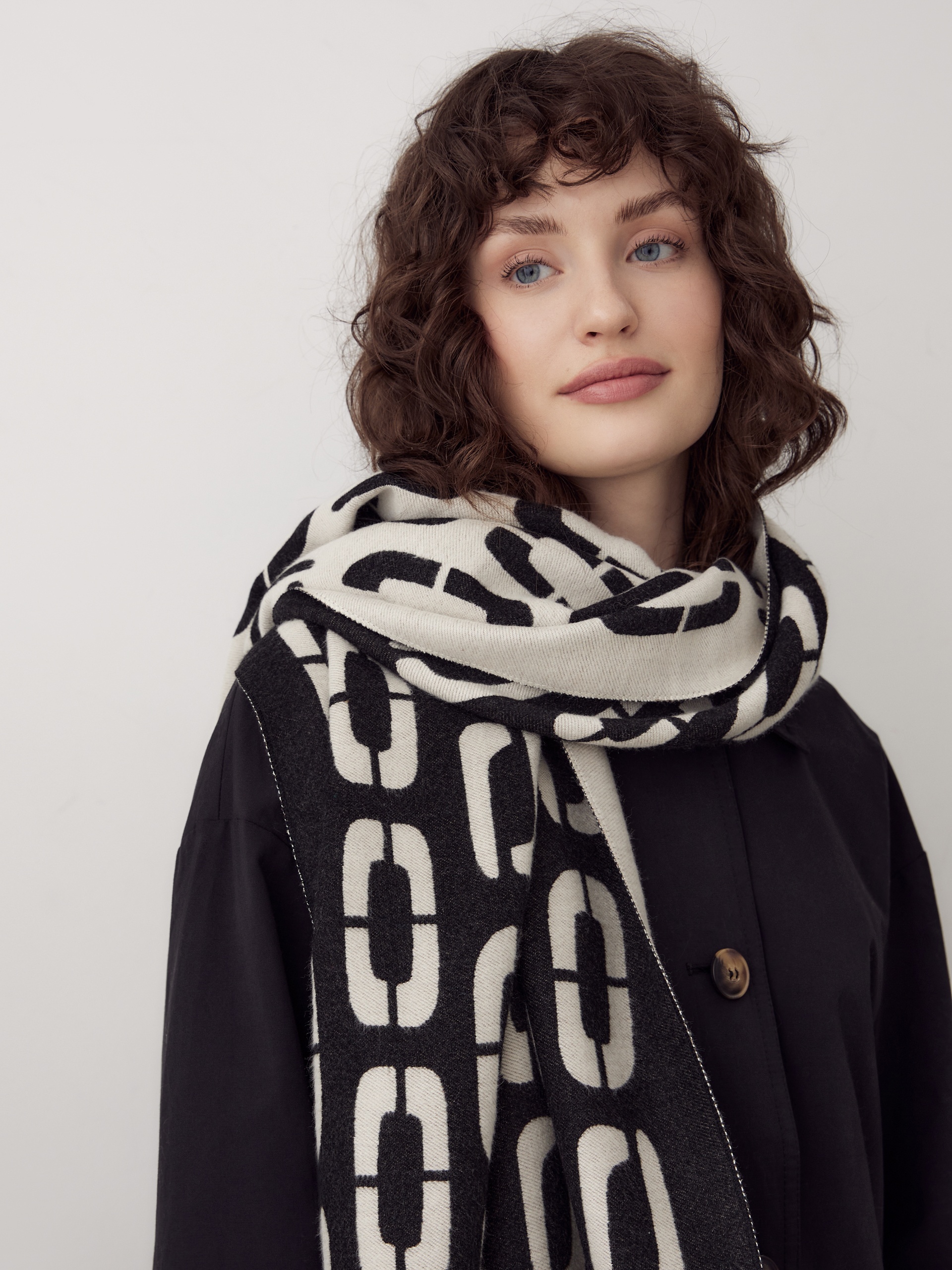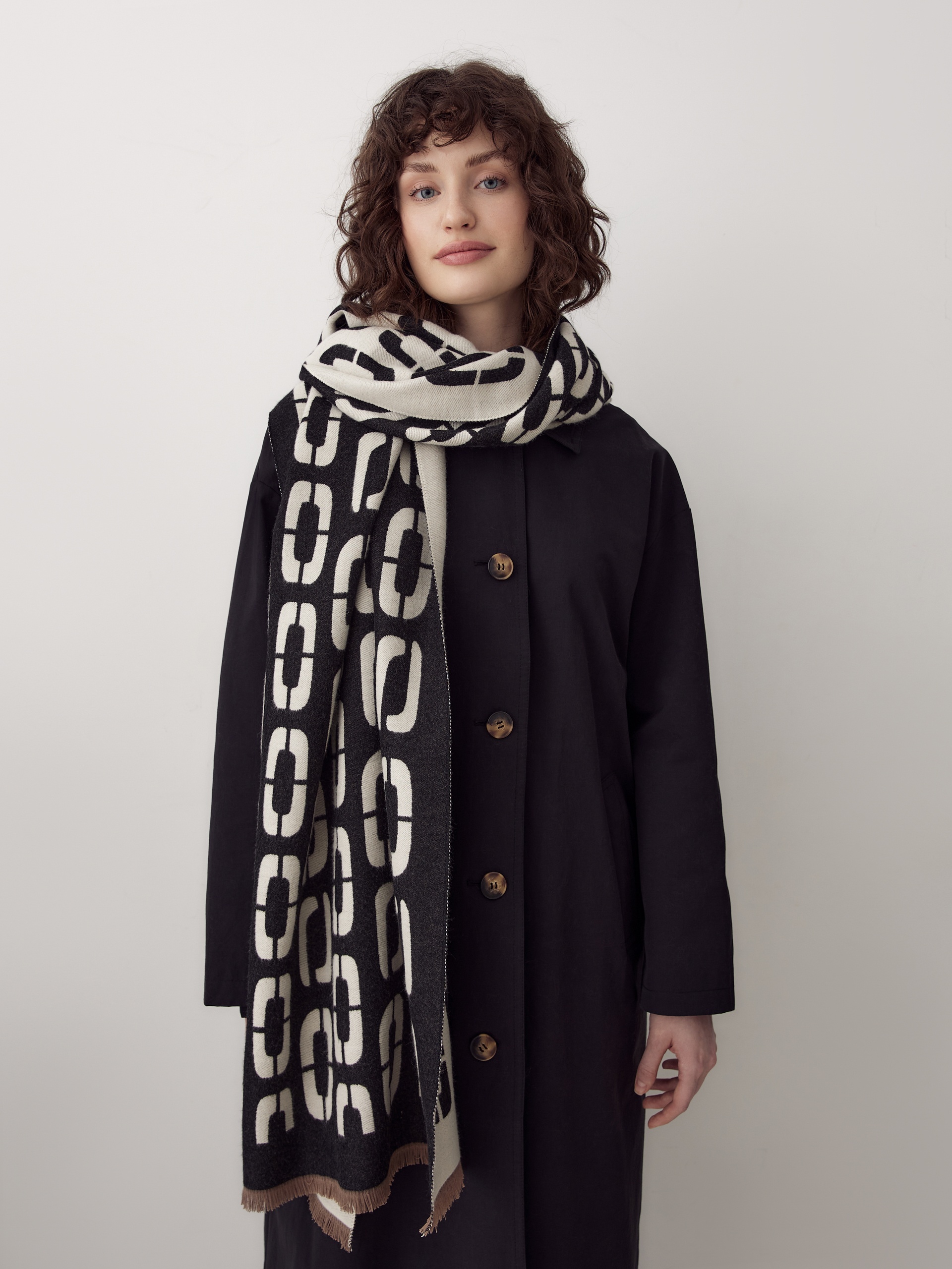 Длинный двухсторонний широкий палантин из мягкого вискозного волокна с геометрическим принтом. Изделие имеет достаточную длину, чтобы полностью обернуть им шею и плечи. Шарф имеет уникальную модную черно-белую расцветку. Такой шарф легко дополнит любой образ с пальто из нашей коллекции и станет незаменимой базовой вещью в вашем гардеробе.