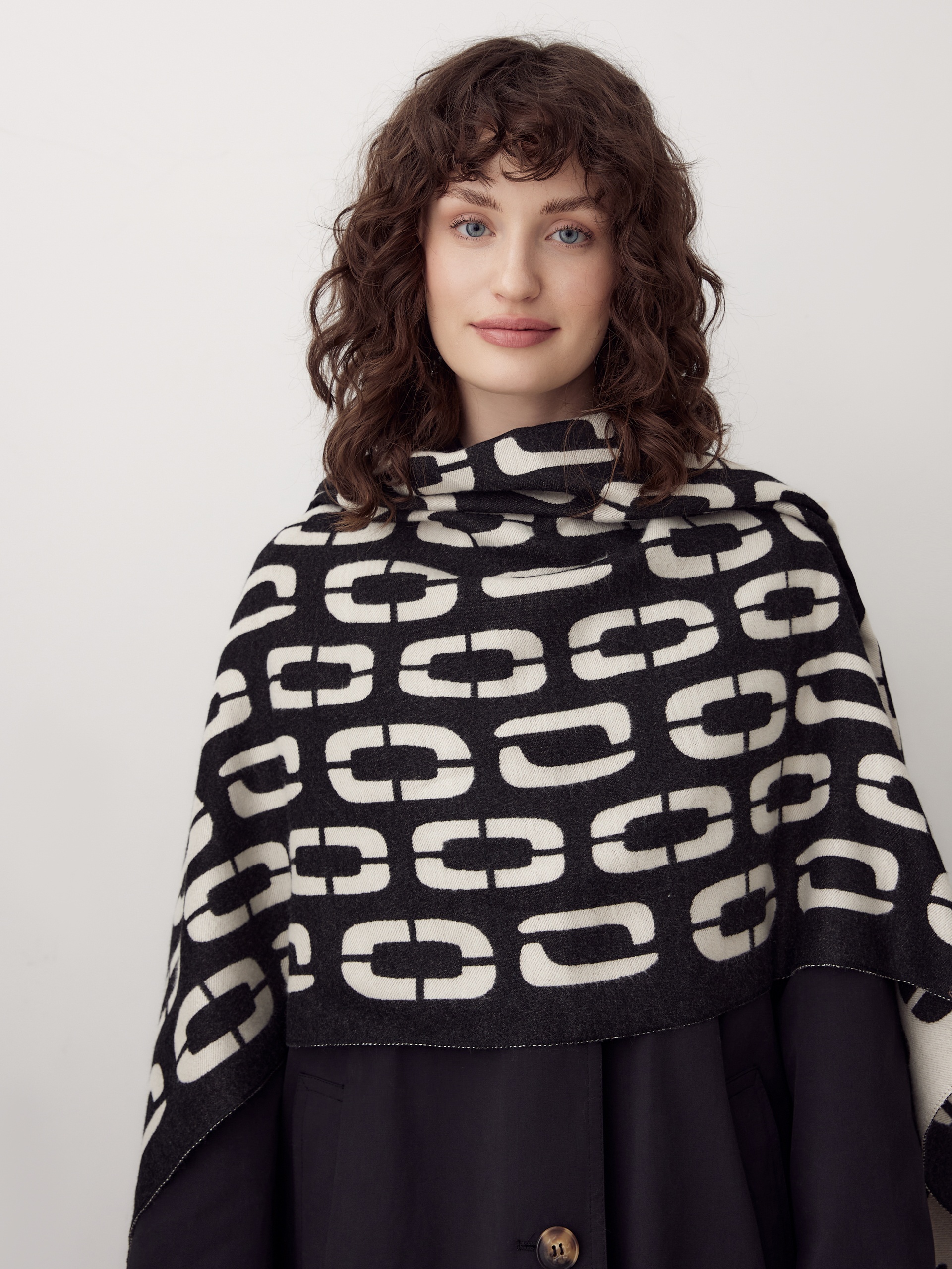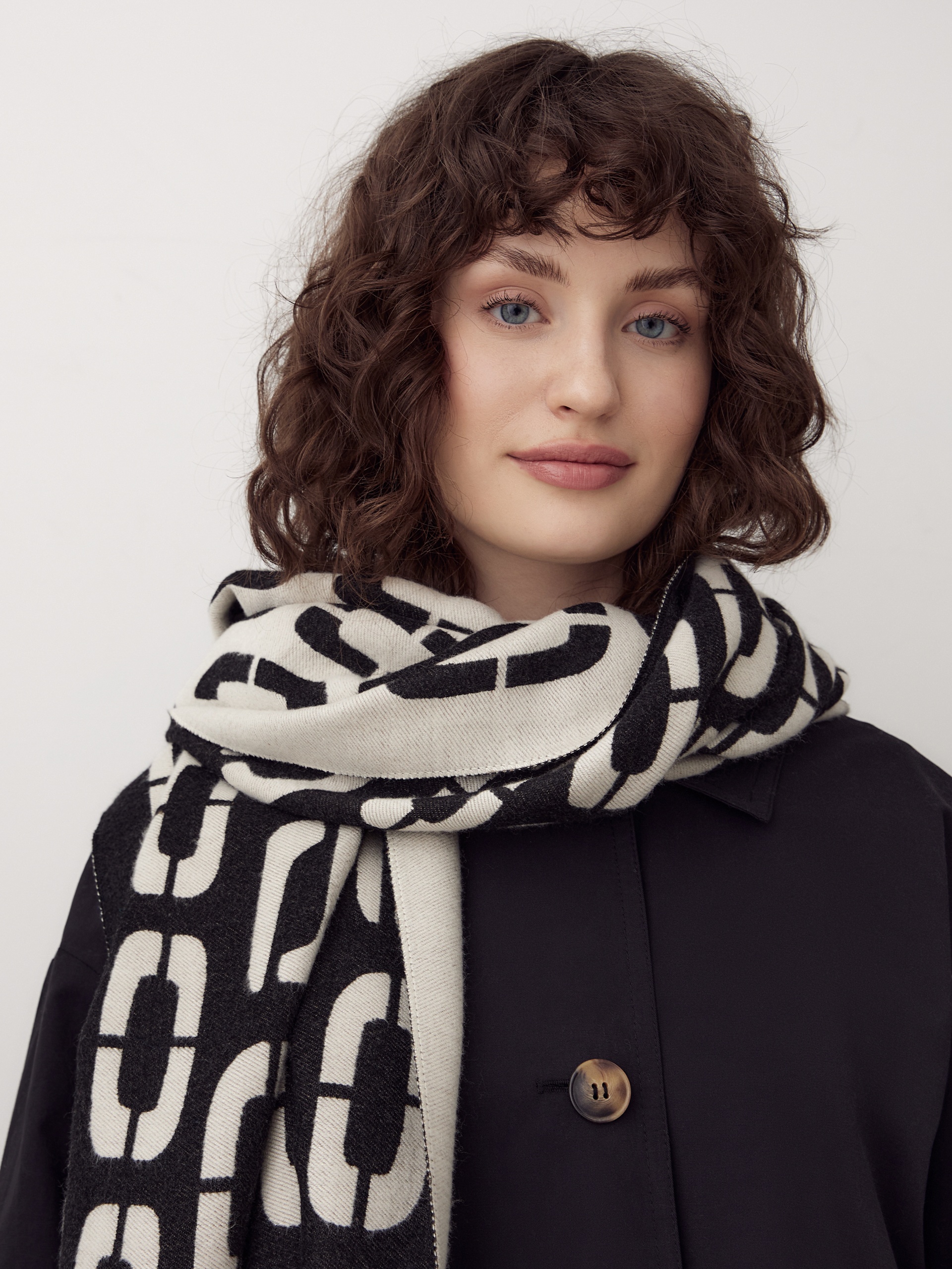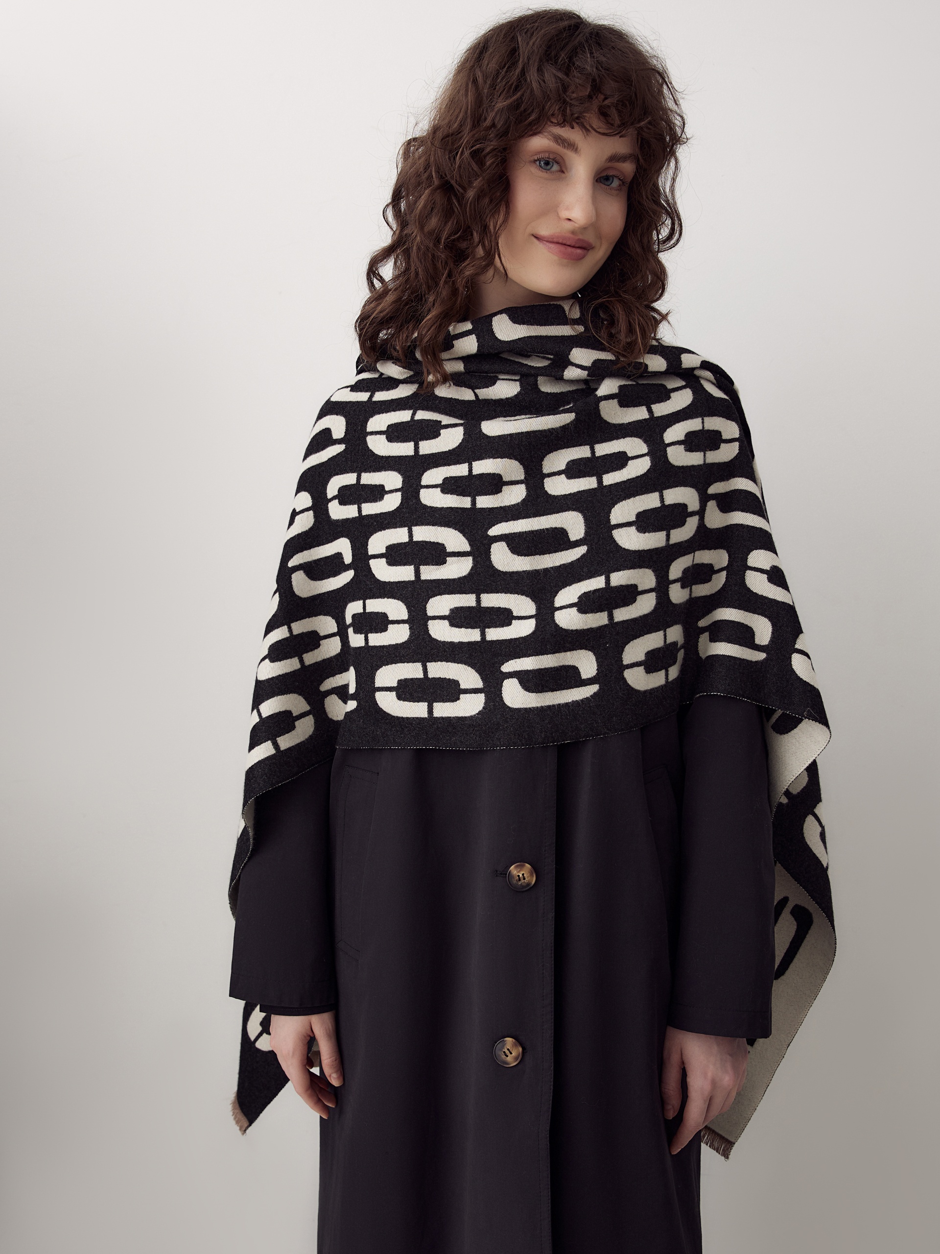 Длинный двухсторонний широкий палантин из мягкого вискозного волокна с геометрическим принтом. Изделие имеет достаточную длину, чтобы полностью обернуть им шею и плечи. Шарф имеет уникальную модную черно-белую расцветку. Такой шарф легко дополнит любой образ с пальто из нашей коллекции и станет незаменимой базовой вещью в вашем гардеробе.