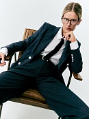 Прямой удлиненный однобортный жакет с ложной застежкой на пуговицы. Английский воротник с остроконечными лацканами. На полочке два наклоненных кармана с клапанами. Жакет полностью на подкладке и выполнен из 100% хлопковой ткани в тонкую полоску. Составит дерзкий ансамбль с широкими брюками из этой же ткани.