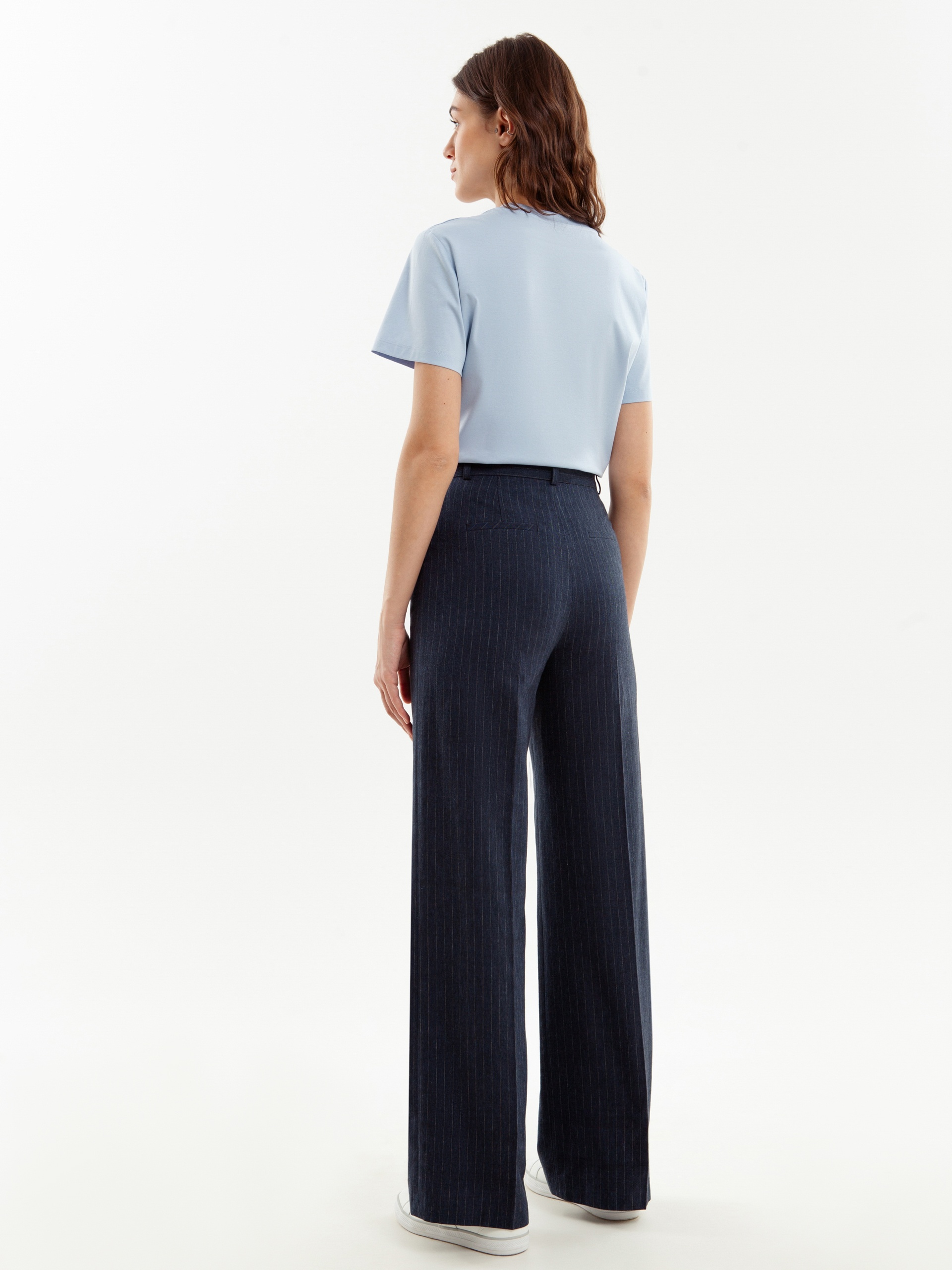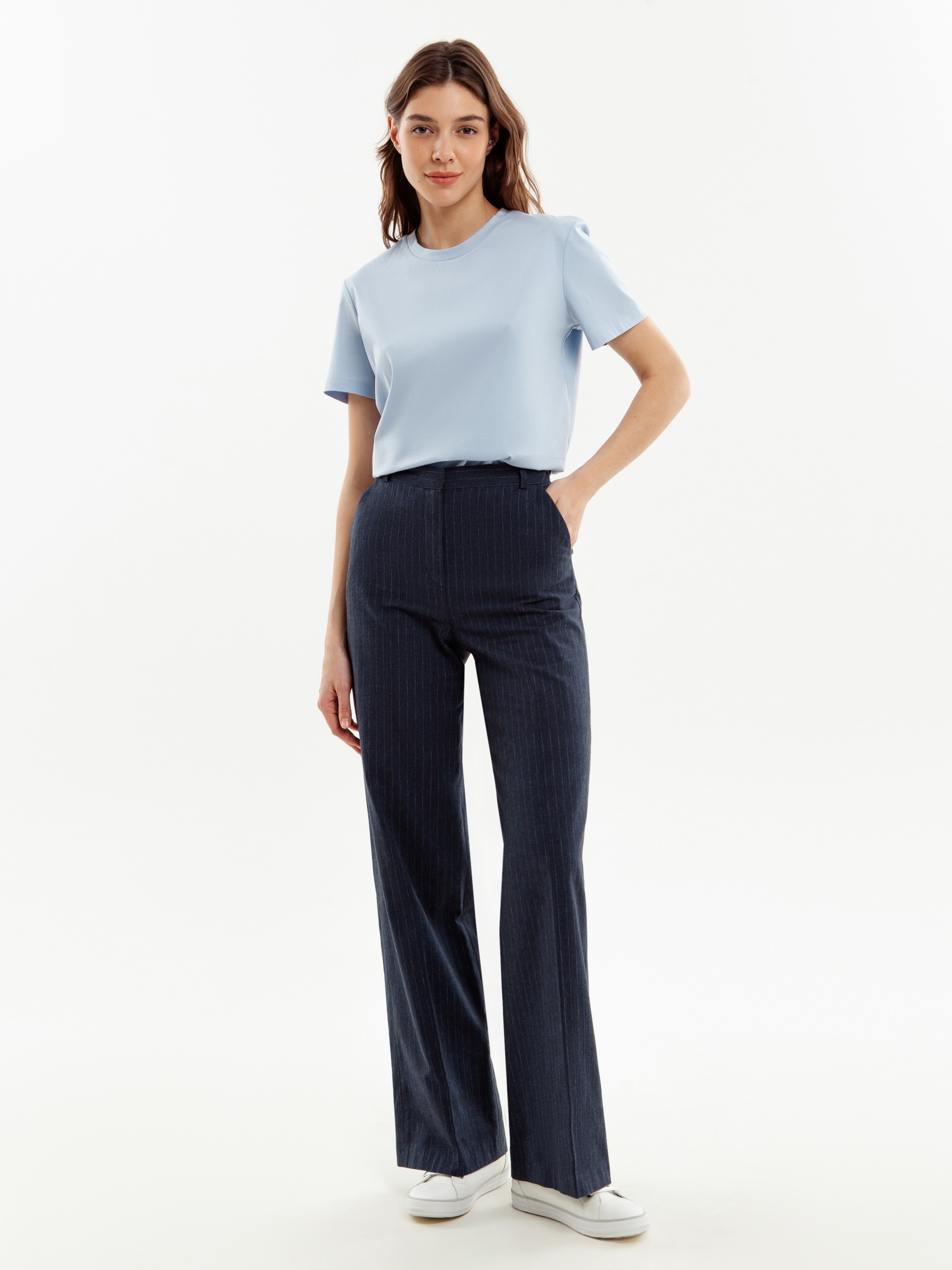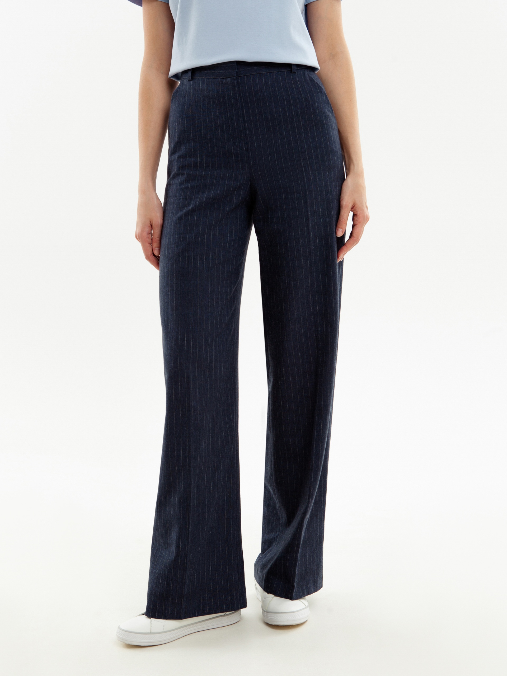 Прямые брюки свободного силуэта из 100% хлопковой костюмной ткани в тонкую полоску. Имеют два функциональных кармана по бокам и два прорезных кармана сзади. Брюки идеально сочетаются с жакетом из одного цветового блока.