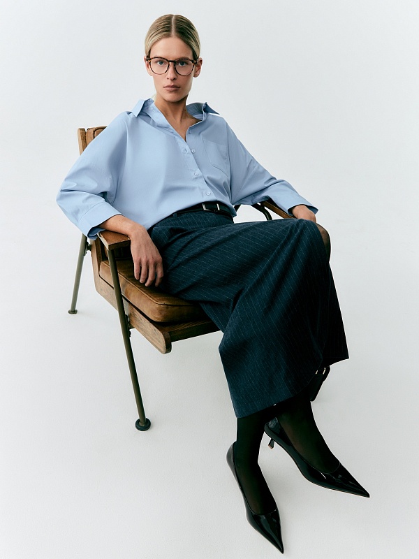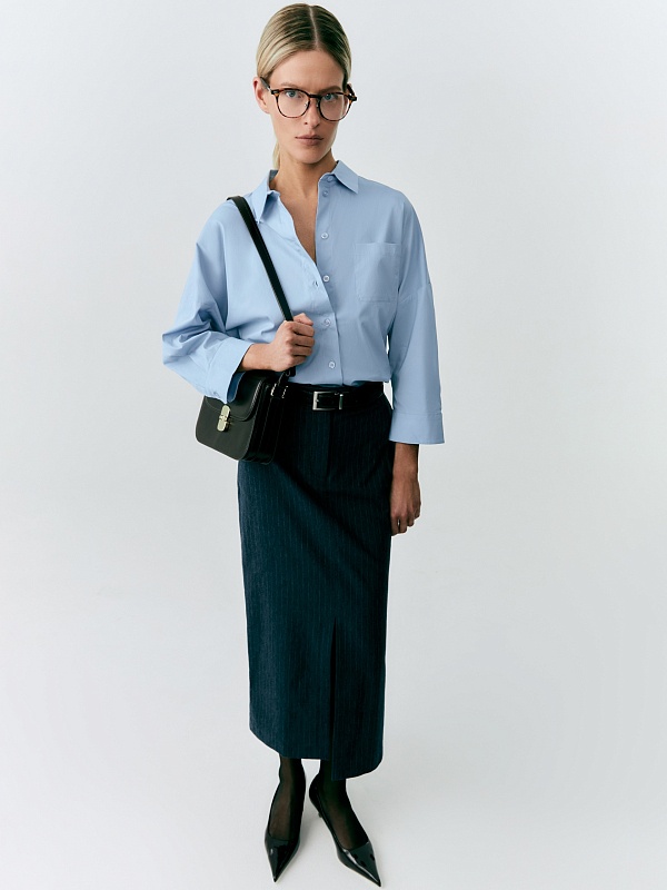 Прямая юбка длины миди, на талии с гульфиком по центру, на притачном поясе со шлевками. Разрез спереди по центру. Юбка из 100% хлопковой костюмной ткани в тонкую полоску. Рабочие карманы по бокам.