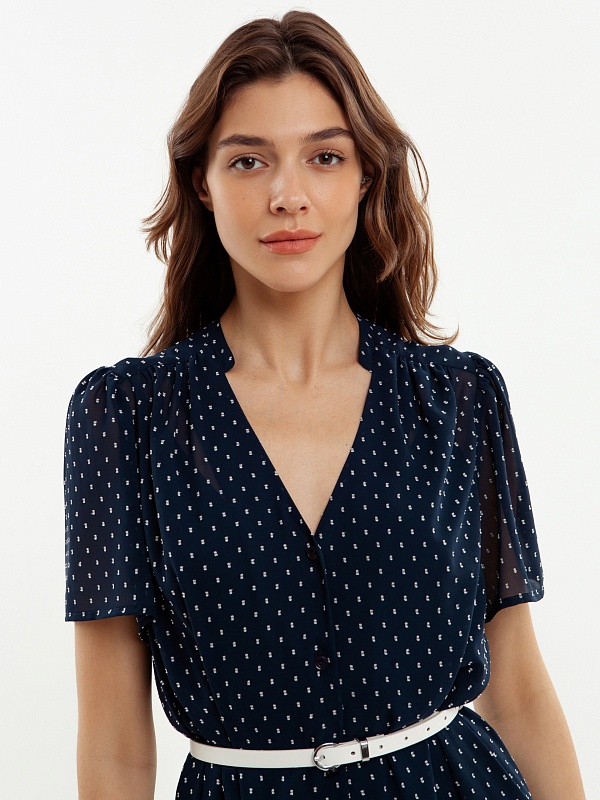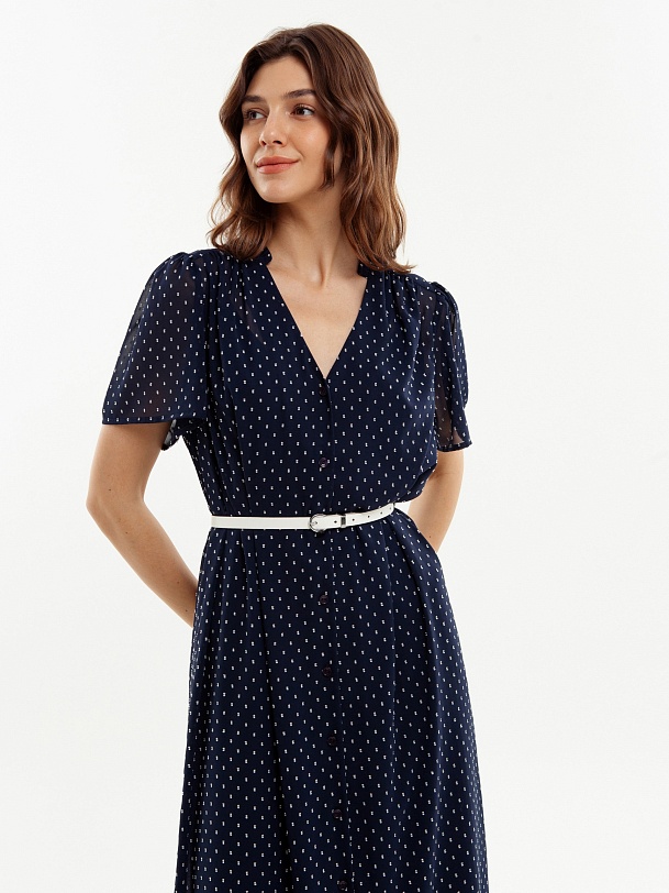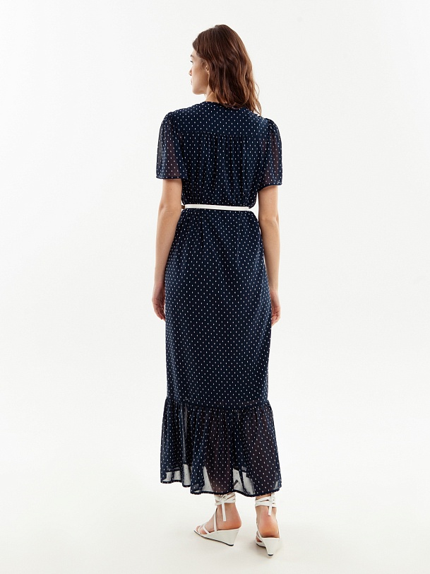 Прямое платье длины макси, с воланом по низу, планка с пуговицами до волана. Горловина со стойкой и V-образный вырез. Небольшие рукава крылышки. Платье на подкладке. В комплект входит тонкий молочный ремень из экокожи.