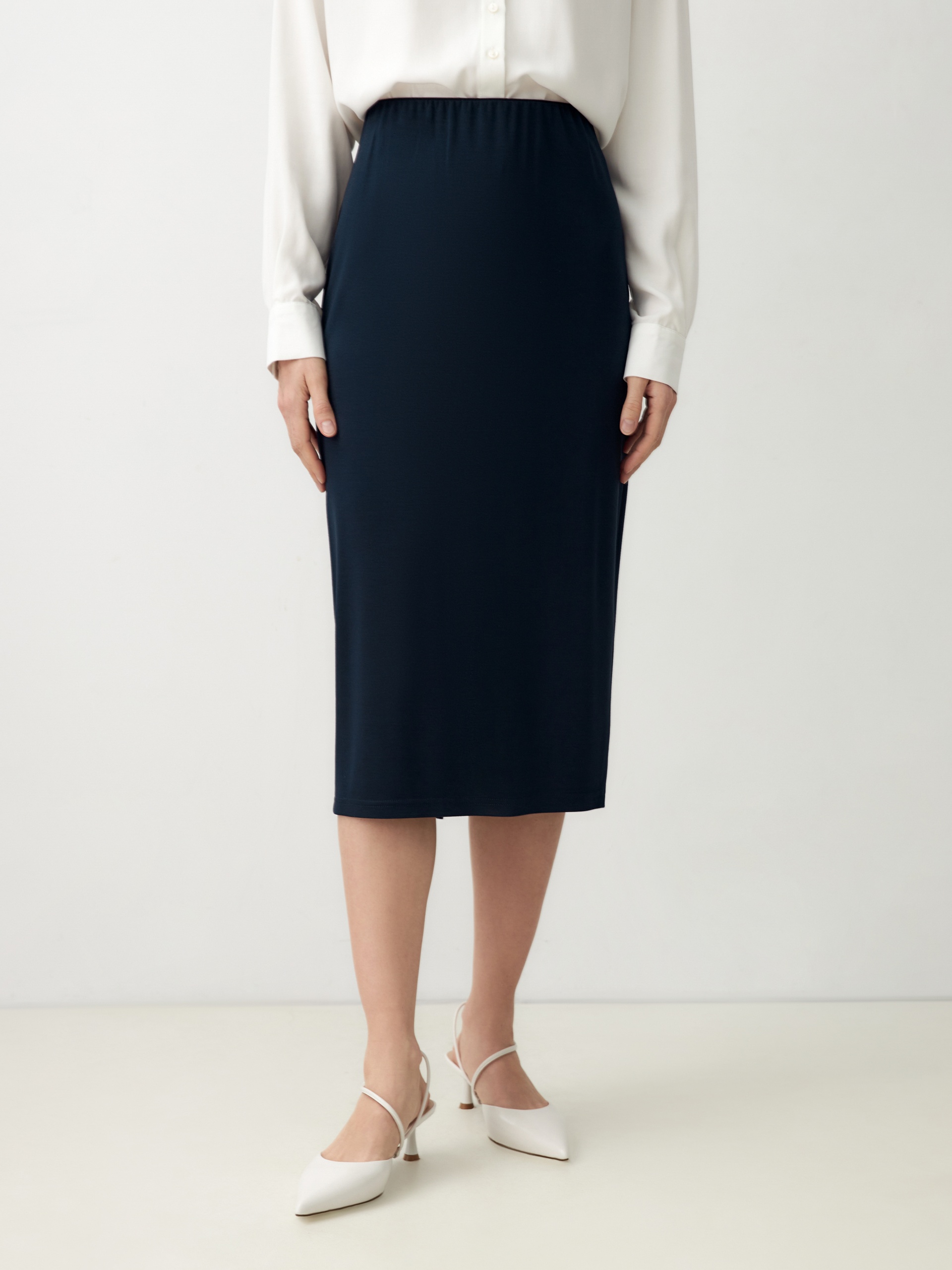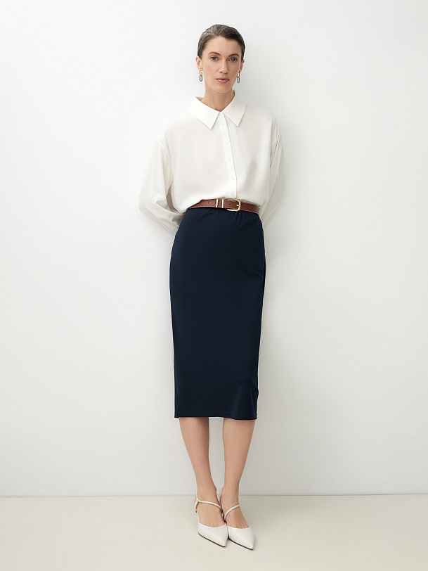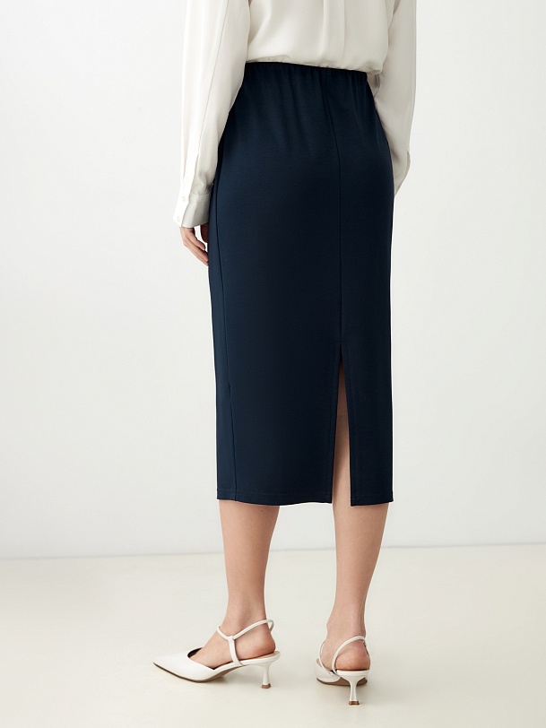 Комфортная юбка-карандаш из трикотажа, приятного к телу, с эластичной внутренней резинкой пояса и шлицей.