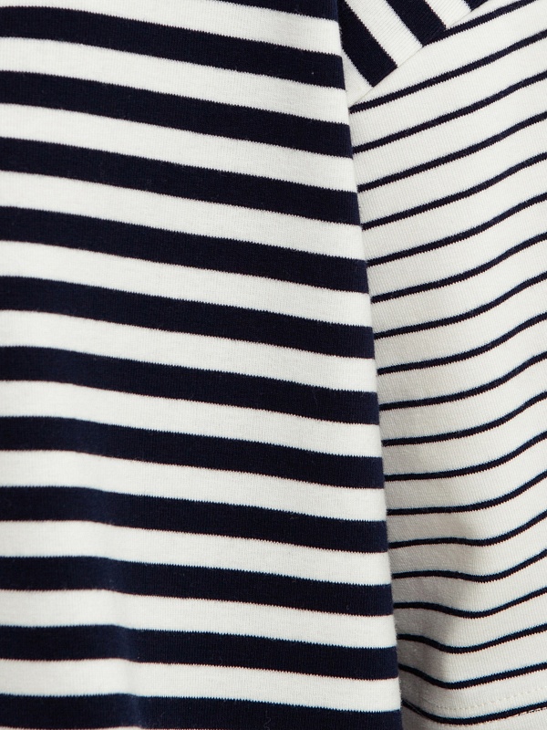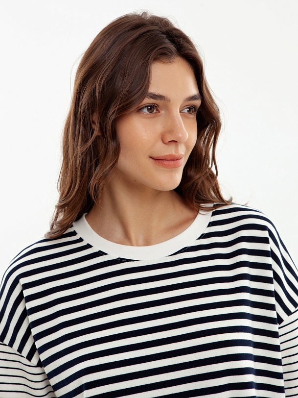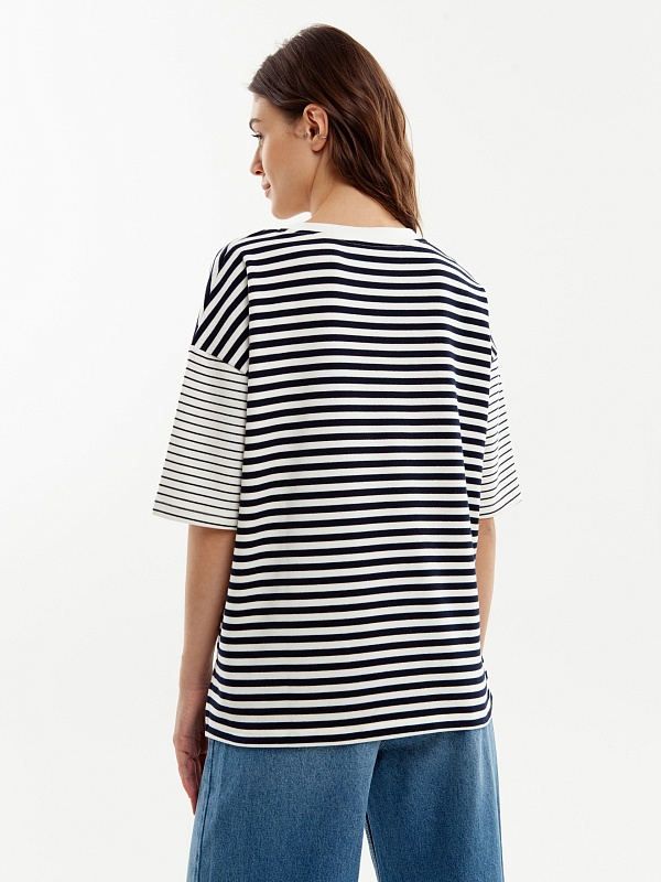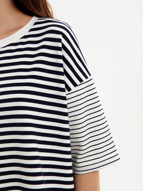 Футболка свободного силуэта с круглой горловиной и спущенной линией рукава, в боковых швах разрезы. Темно-синие полоски разного размера придают образу игривости.