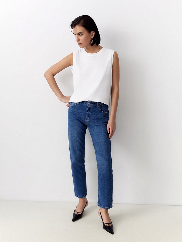 Прямые джинсы высокой посадки из хлопка с добавлением эластана, с фигурными рабочими карманами. Застежка спереди на молнию и металлическую пуговицу. Сзади фигурная кокетка и накладные карманы. Идеальная модель для создания комфортных повседневных образов.