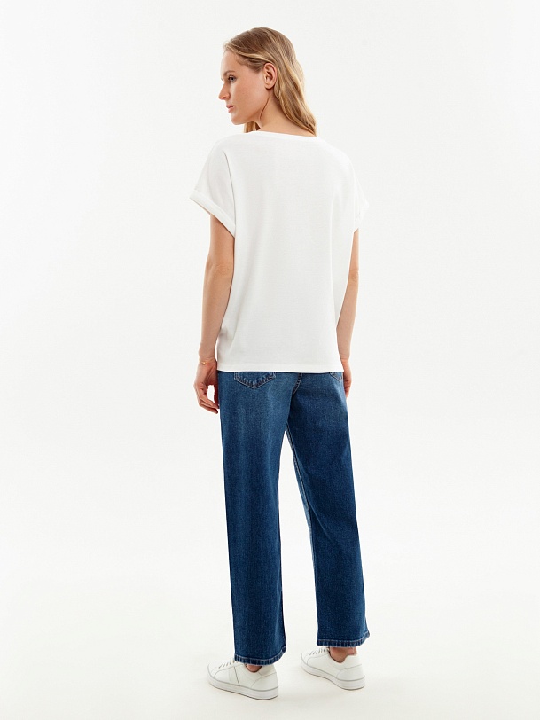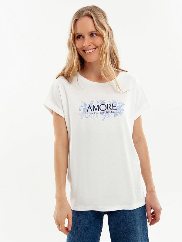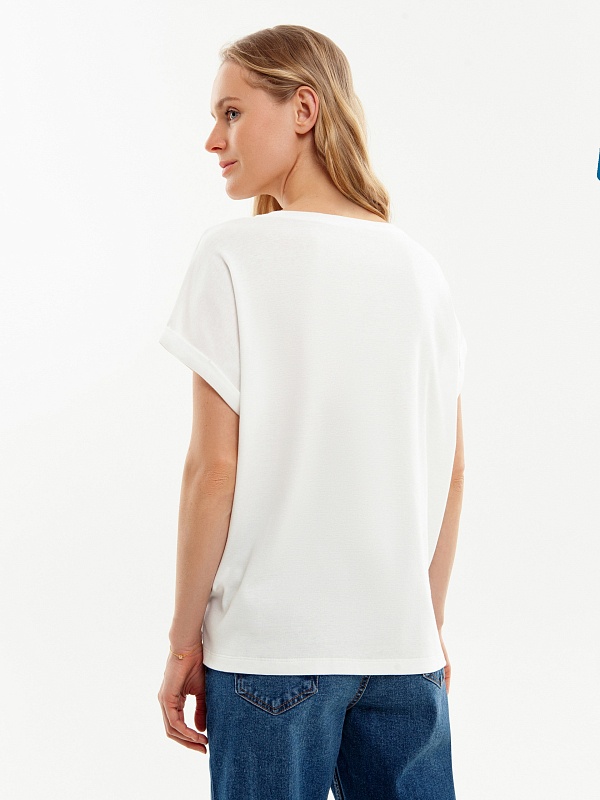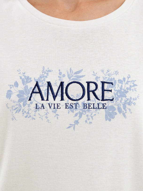 Футболка из премиального мерсеризированного хлопка, свободного кроя, с разрезами по бокам и с женственным мотивом на полочке, скомбинированным из принта и вышивки. Мерсеризированный хлопок имеет шелковистый блеск и не деформируется после стирок, практически не мнется и не выцветает со временем.